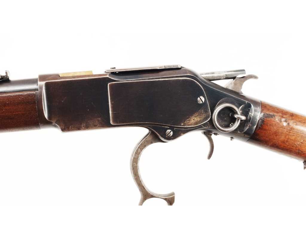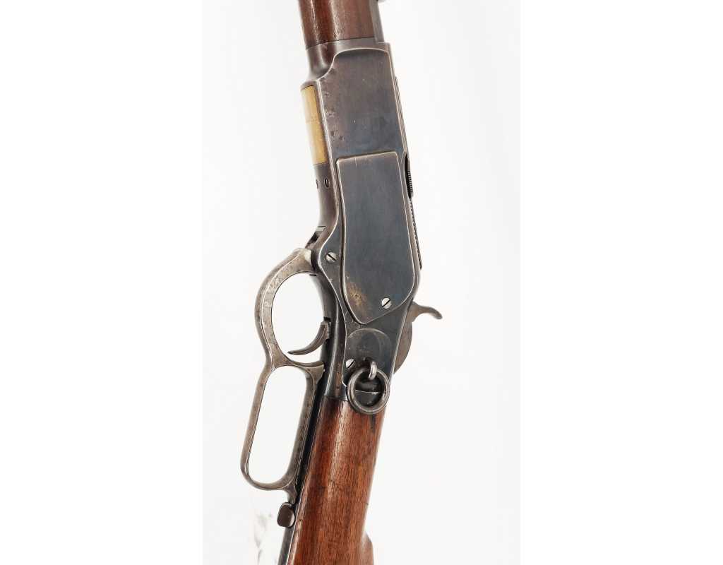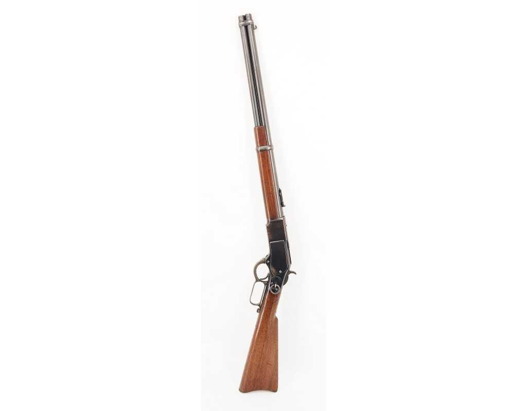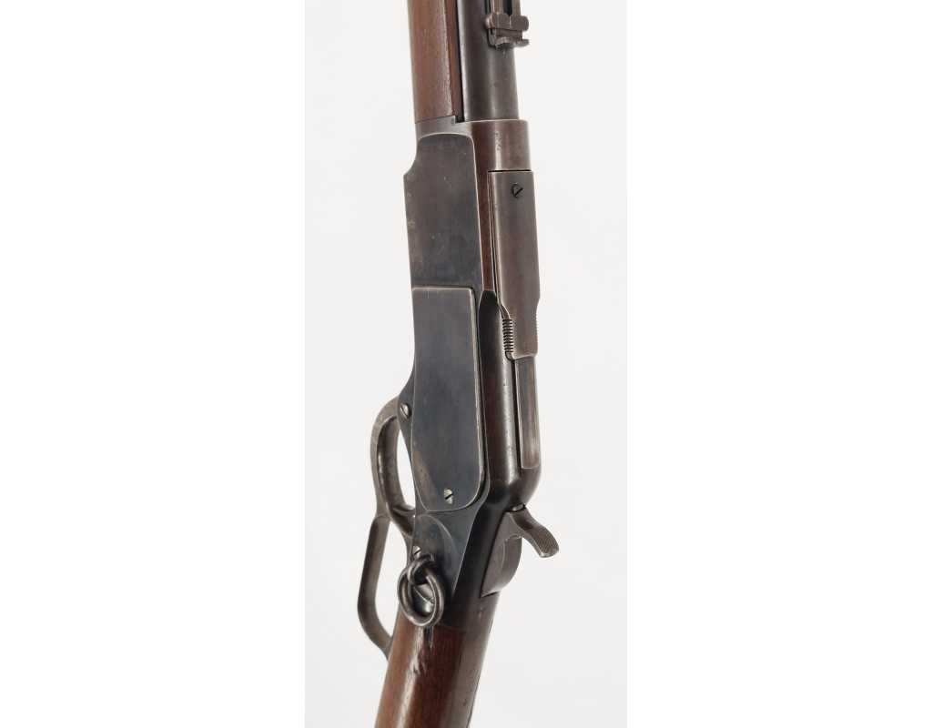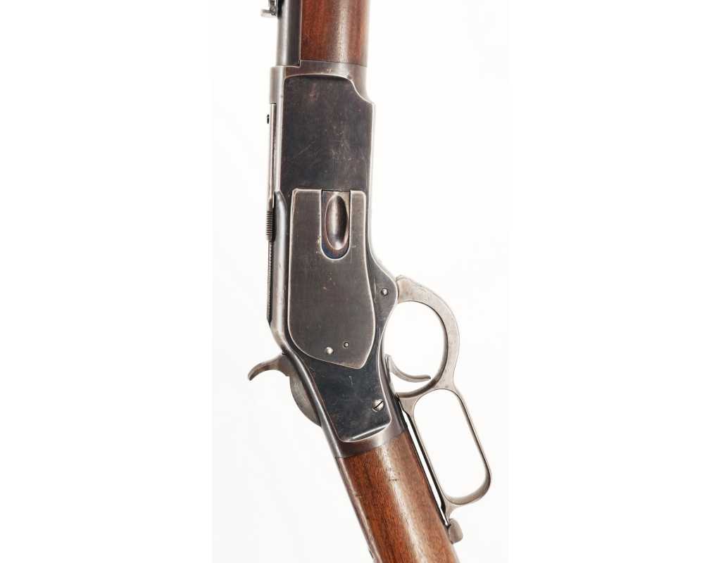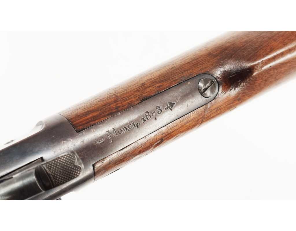 Carabine de selle Winchester modèle 1873 calibre 44/40 produite en 1899/1900 dans sa finition bronzée d'origine très bien conservée, patine d'usage et fines taches. Canon rond de 51cm bien marqué du calibre et du fabricant, hausse graduée et guidon d'origine, rayures brillantes sans usure particulière ni tache, inscription du modèle sur la queue de culasse, mécanisme complet et fonctionnel sans jeu, monture en noyer sans usure des angles, petites traces de manipulation sans accident. N°536006