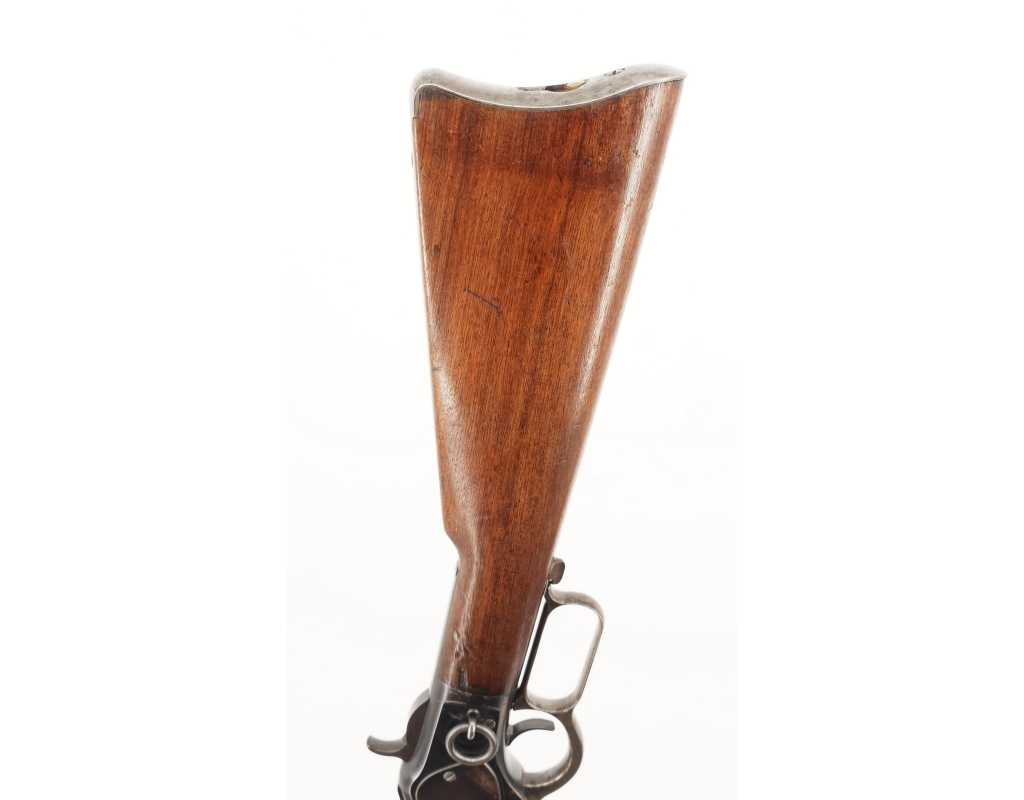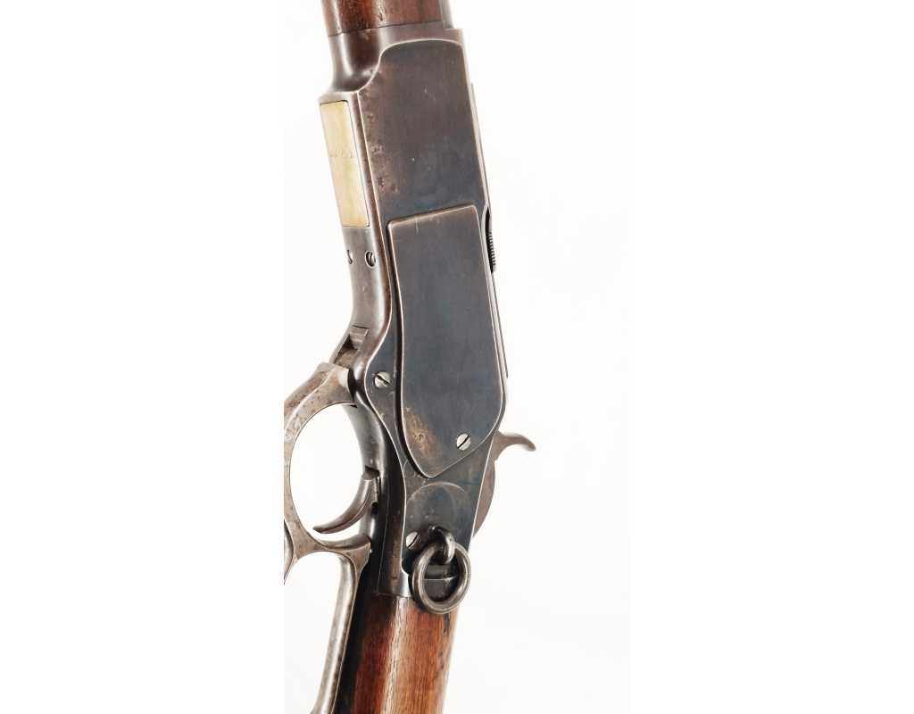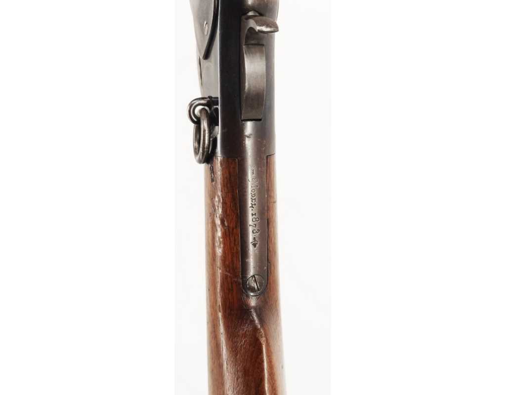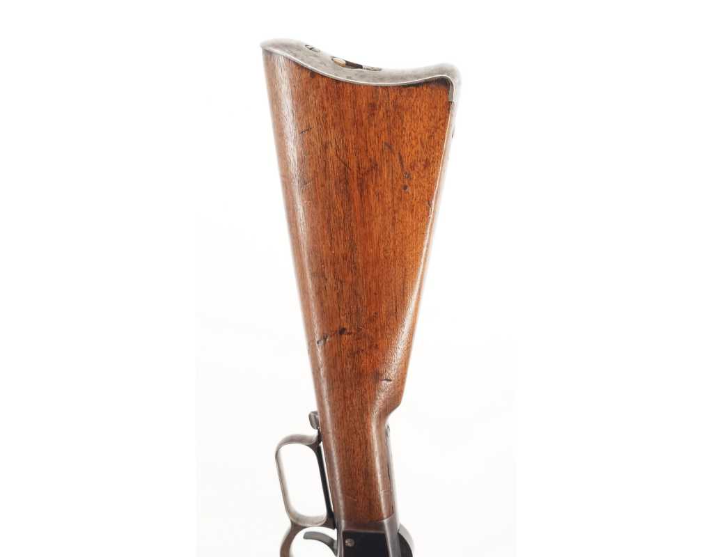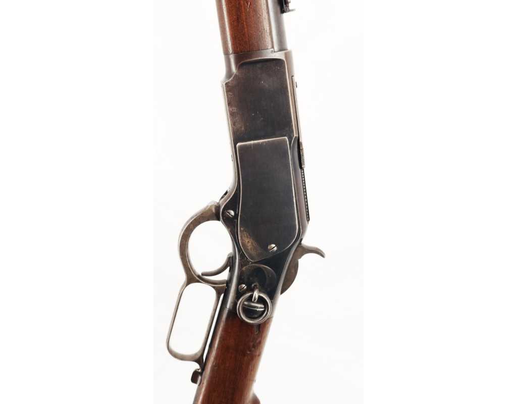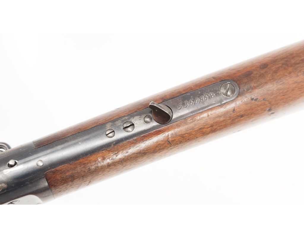 Carabine de selle Winchester modèle 1873 calibre 44/40 produite en 1899/1900 dans sa finition bronzée d'origine très bien conservée, patine d'usage et fines taches. Canon rond de 51cm bien marqué du calibre et du fabricant, hausse graduée et guidon d'origine, rayures brillantes sans usure particulière ni tache, inscription du modèle sur la queue de culasse, mécanisme complet et fonctionnel sans jeu, monture en noyer sans usure des angles, petites traces de manipulation sans accident. N°536006