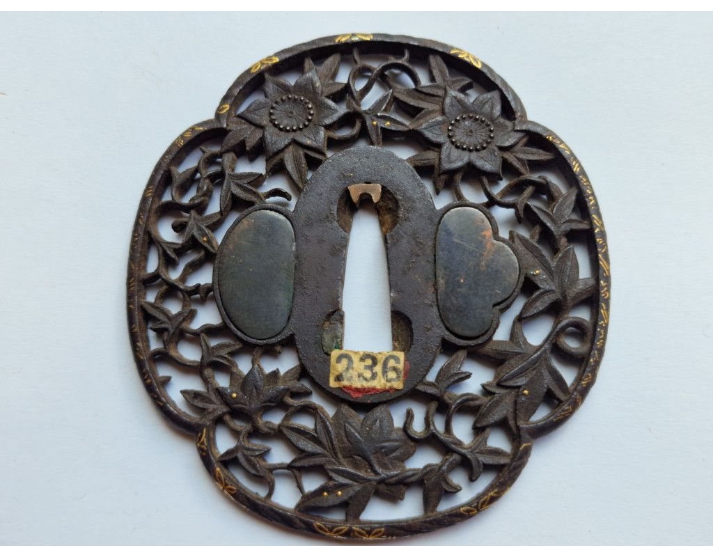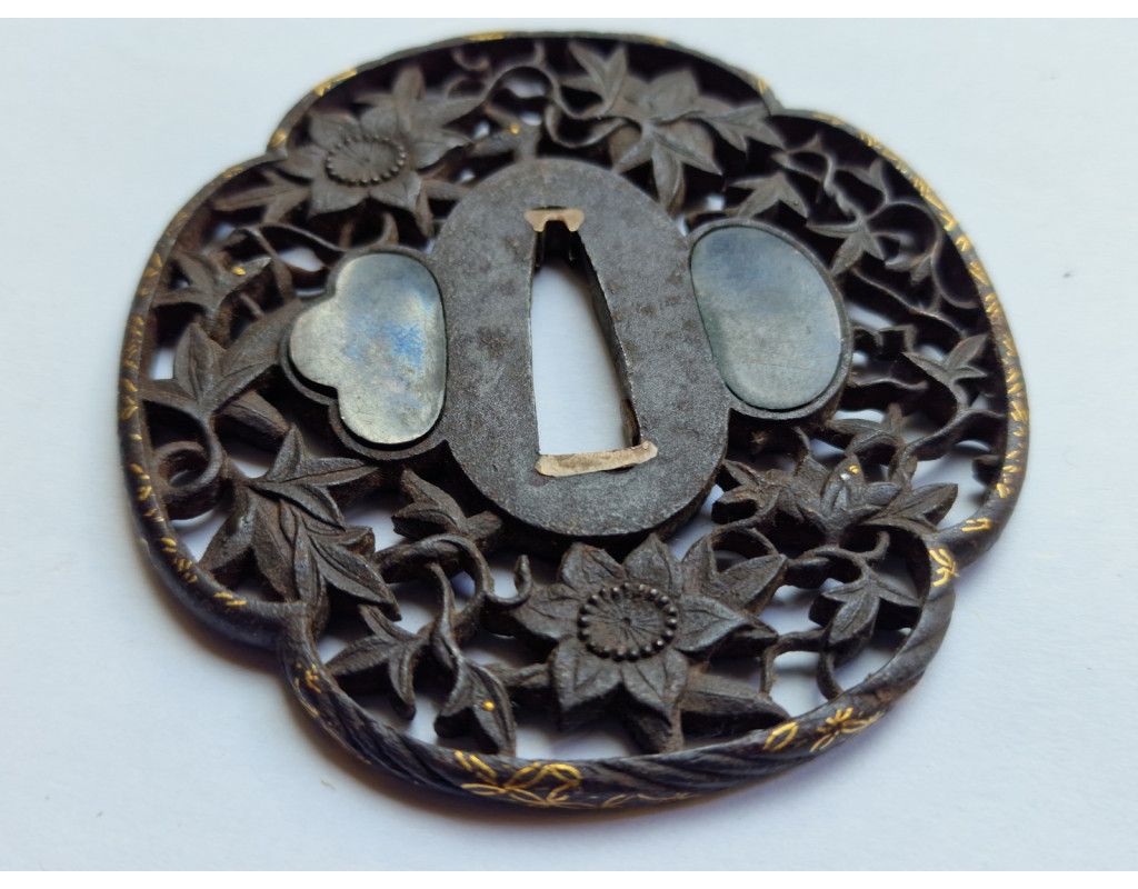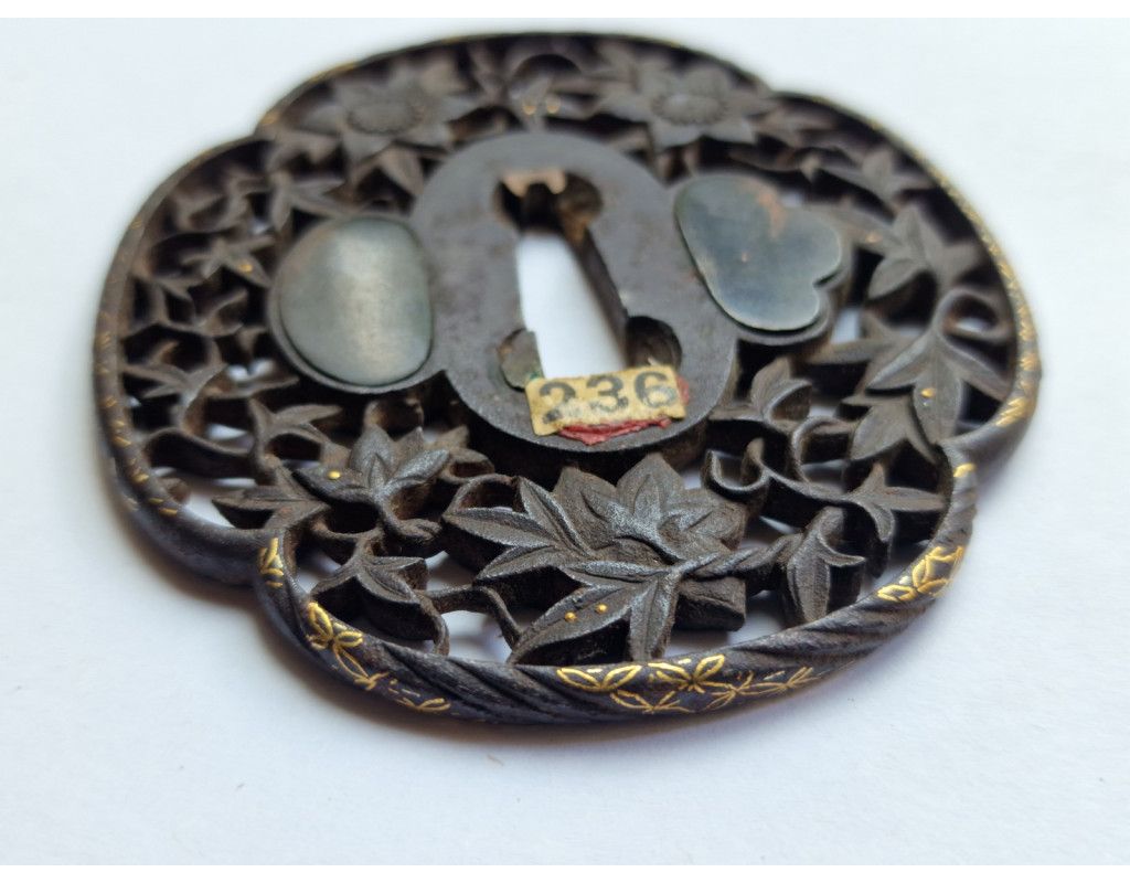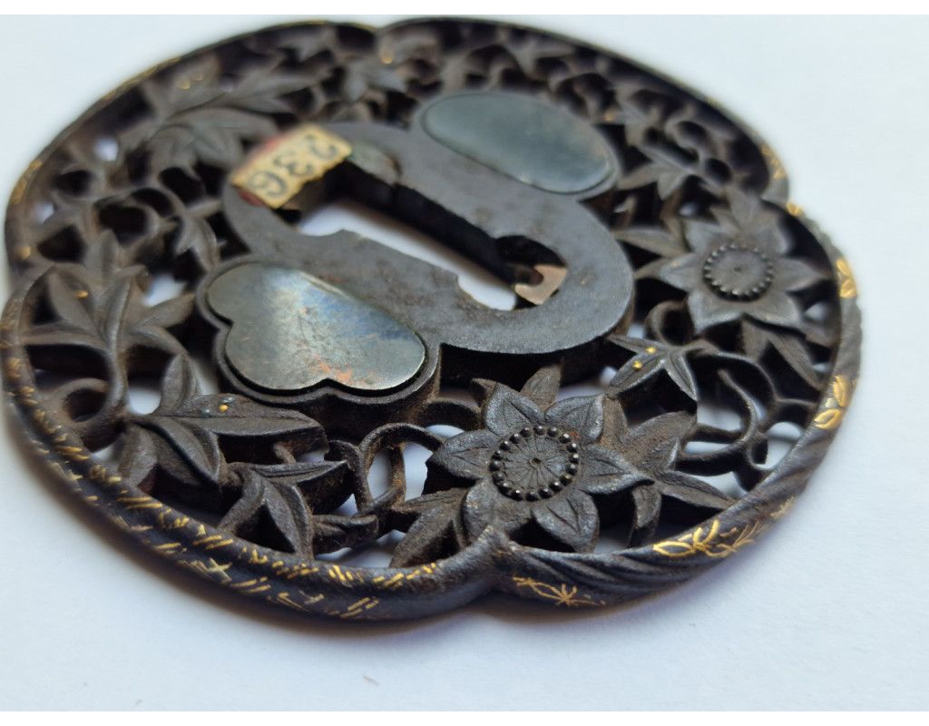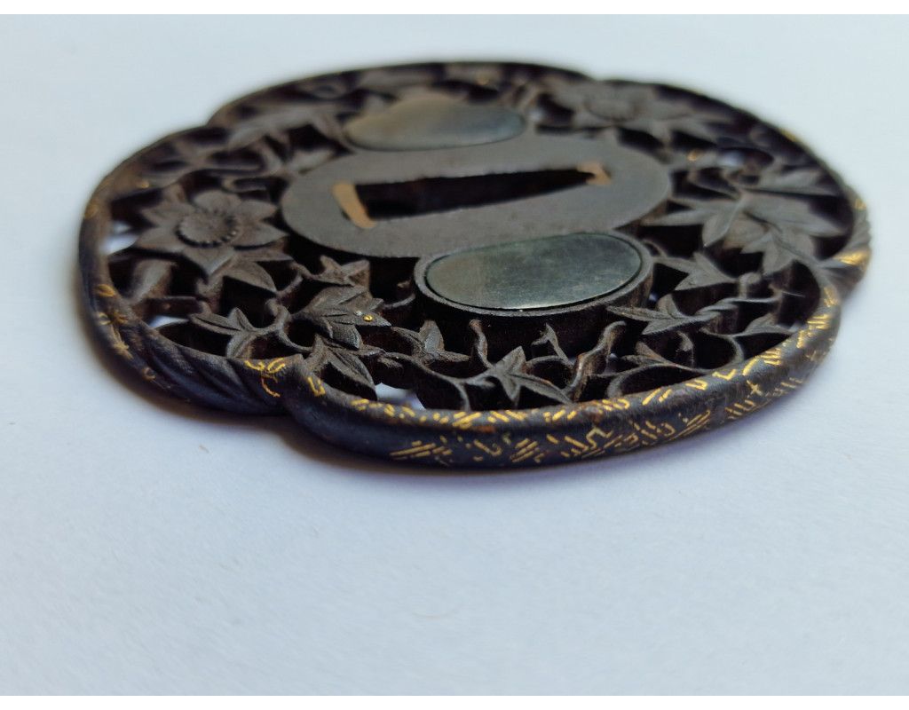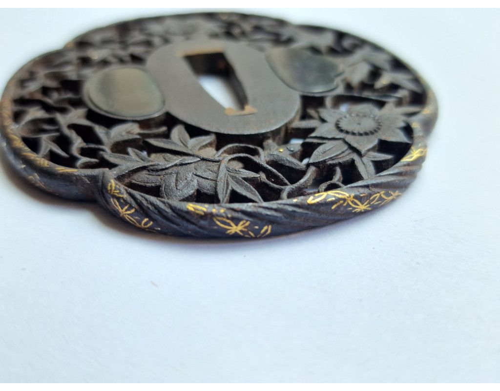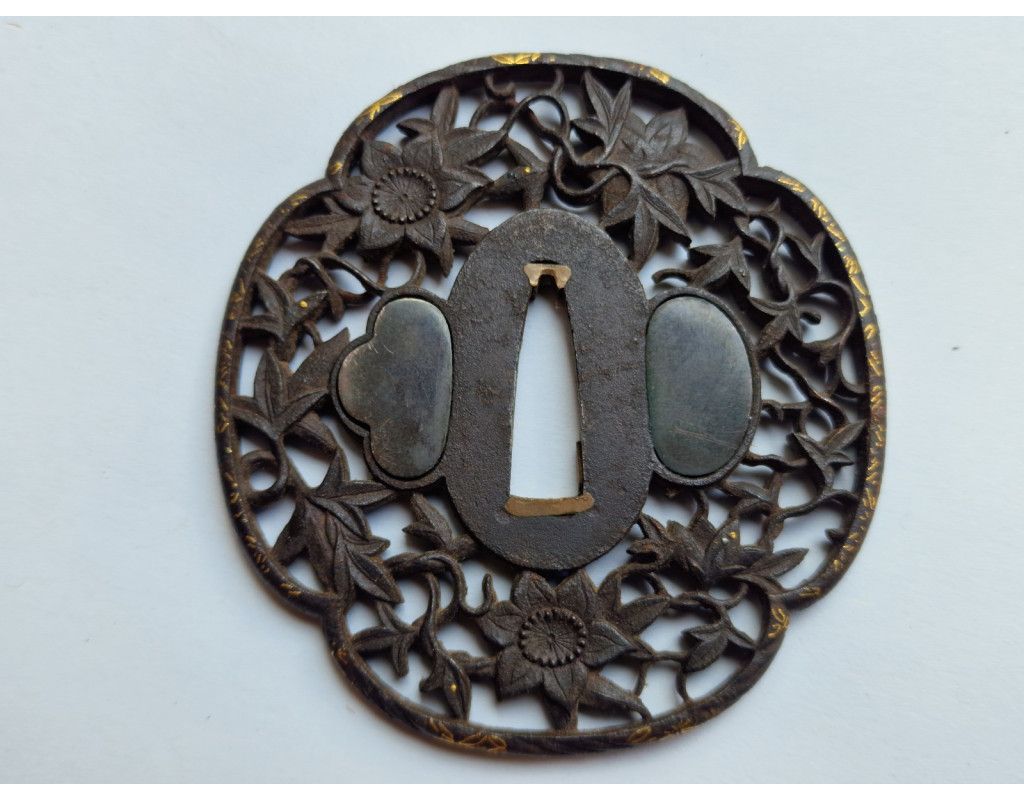 Tsuba pour Wakizashi en fer ajourée de fleurs et feuilles, bordure damasquinée d'or. Belle patine avec fines taches.
