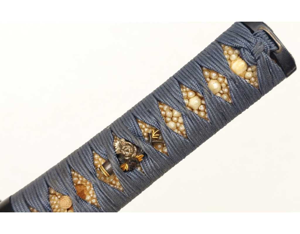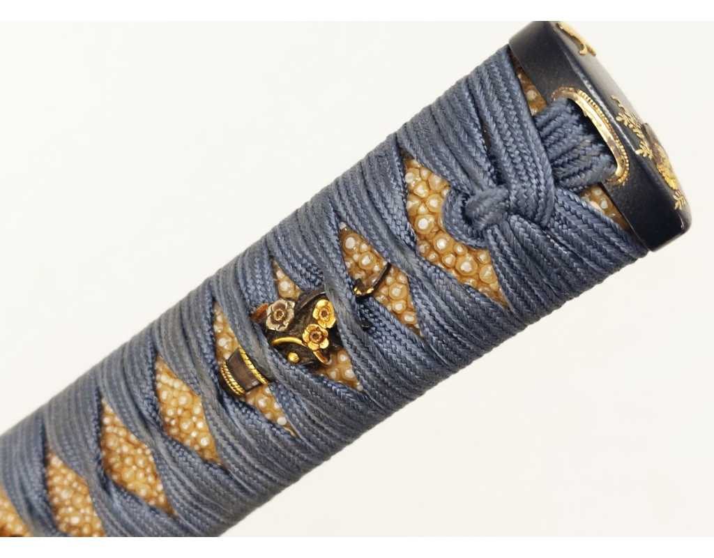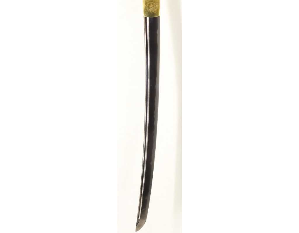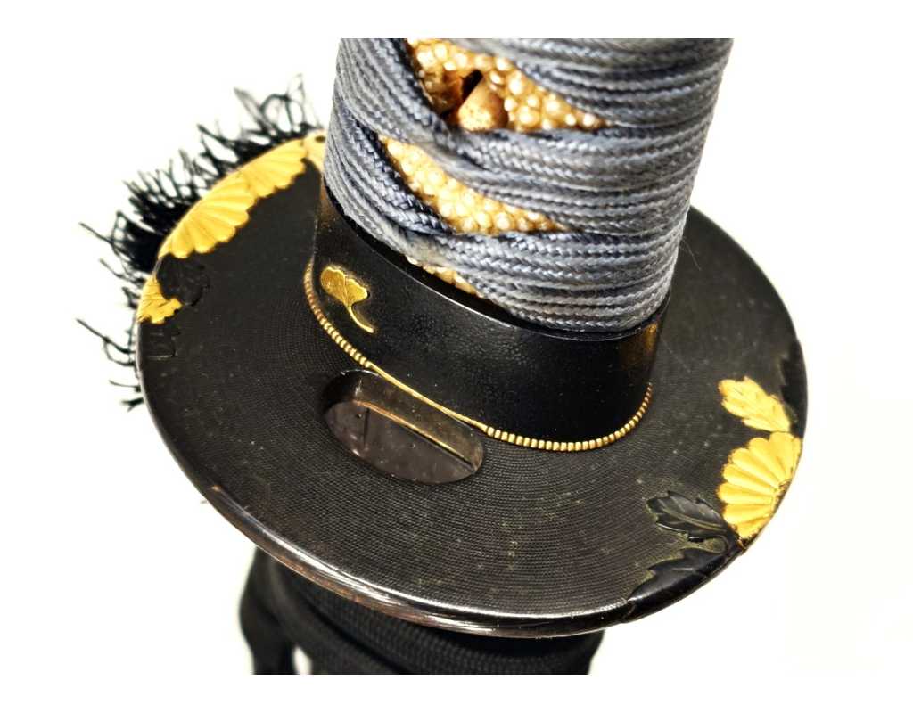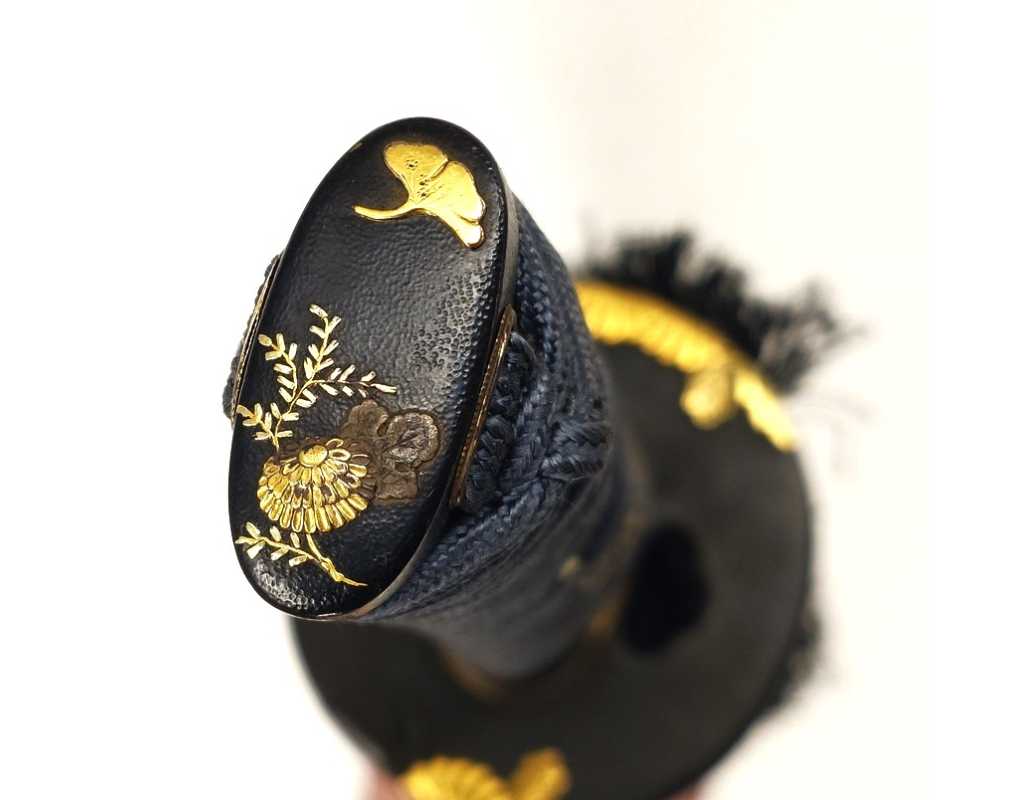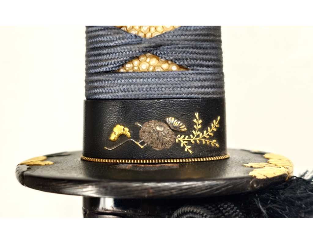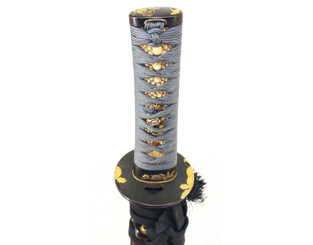 Nagasa 51cm, polissage complet sans défaut, belle cristallisation de la trempe, beau grain de forge très fin jusqu'au boshi. Monture en shakudo noir finement perlé en nanako très fin bien en suite, incrustation or et argent de pivoine, fleur de lotus, feuilles de ginko et fleurs de pivoine, tsuba recouverte de samé d'origine, tresse de soie bleu ciel remplacée au polissage récemment, menukis d'ikebana fleuri. Saya laqué marron foncé sans accident. Longueur totale 70cm.