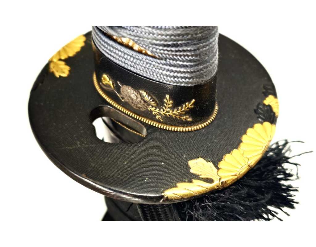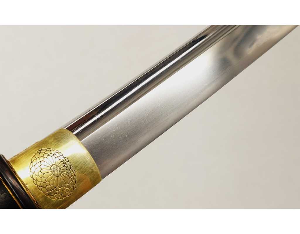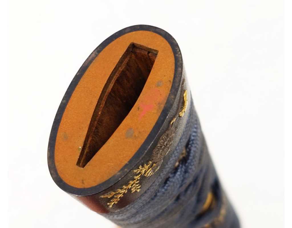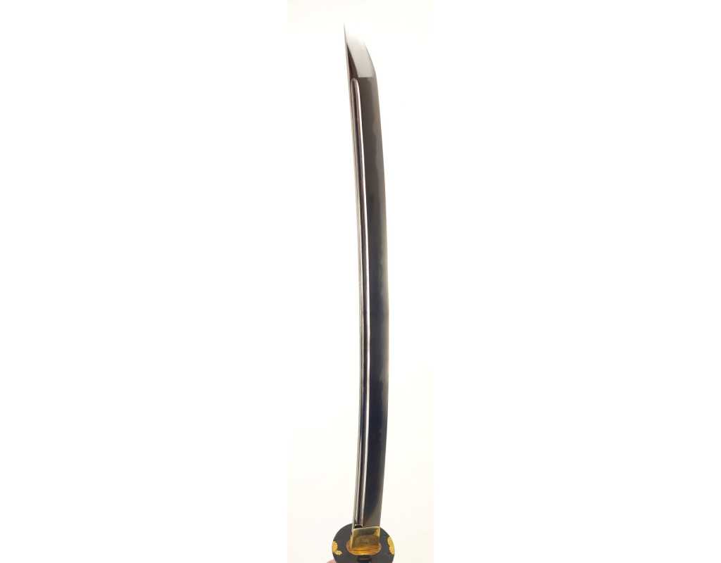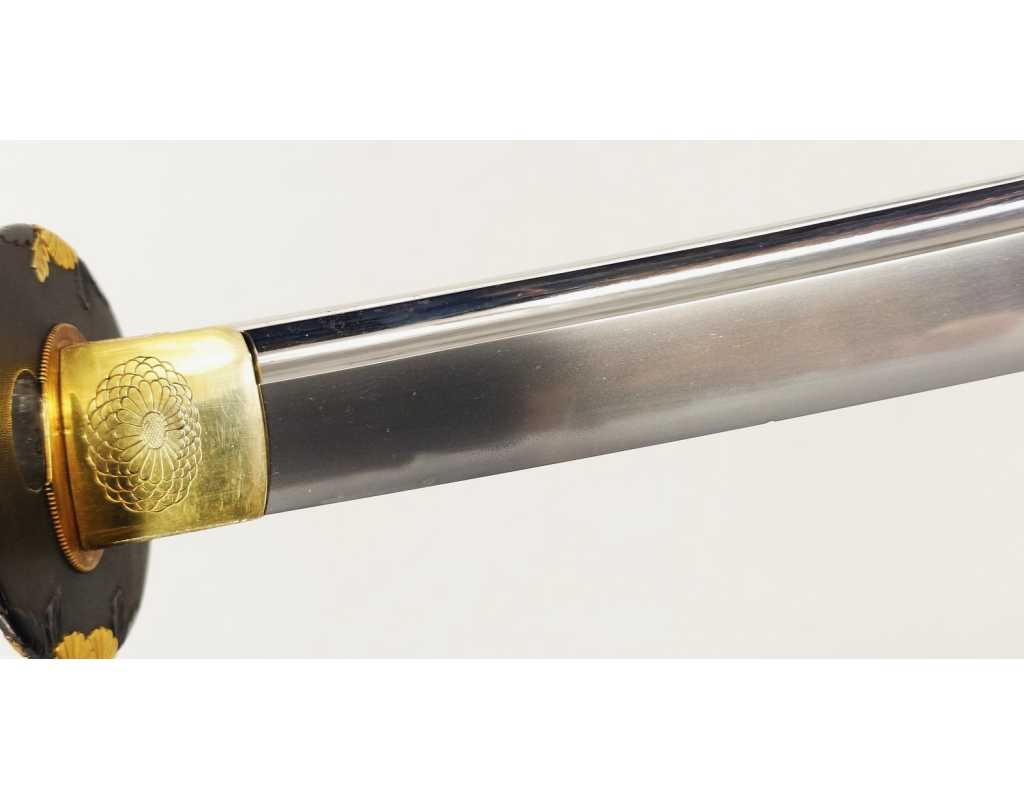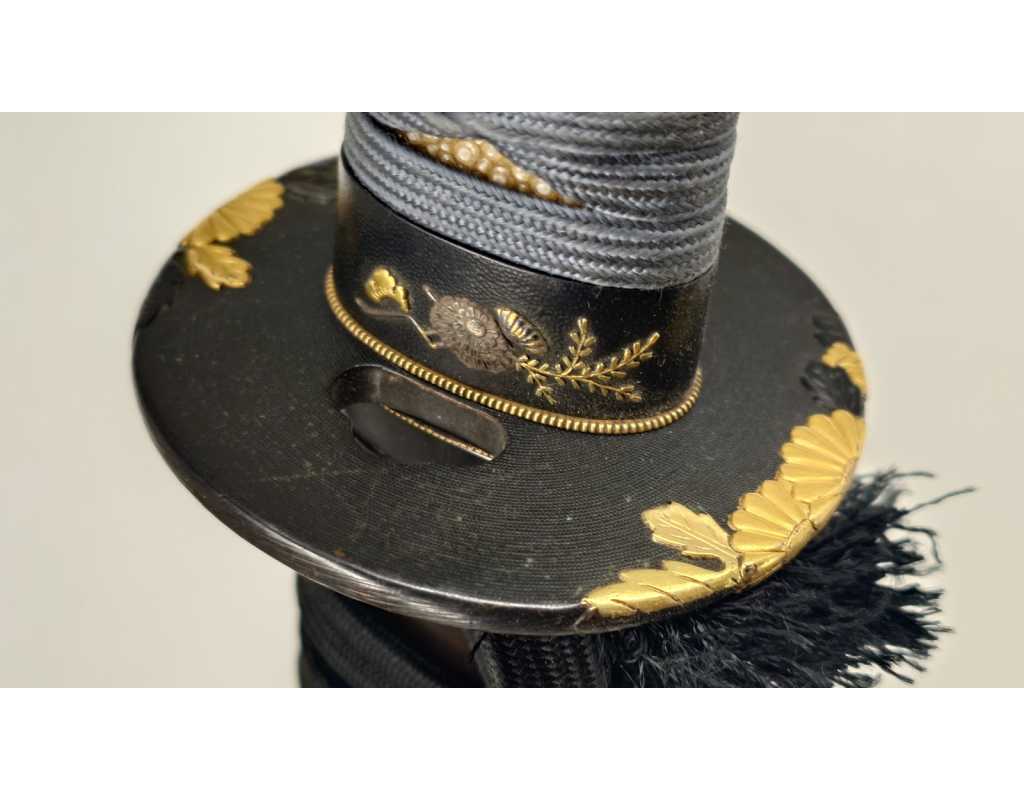 Nagasa 51cm, polissage complet sans défaut, belle cristallisation de la trempe, beau grain de forge très fin jusqu'au boshi. Monture en shakudo noir finement perlé en nanako très fin bien en suite, incrustation or et argent de pivoine, fleur de lotus, feuilles de ginko et fleurs de pivoine, tsuba recouverte de samé d'origine, tresse de soie bleu ciel remplacée au polissage récemment, menukis d'ikebana fleuri. Saya laqué marron foncé sans accident. Longueur totale 70cm.