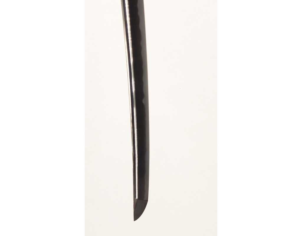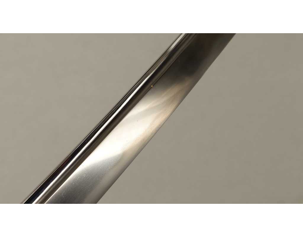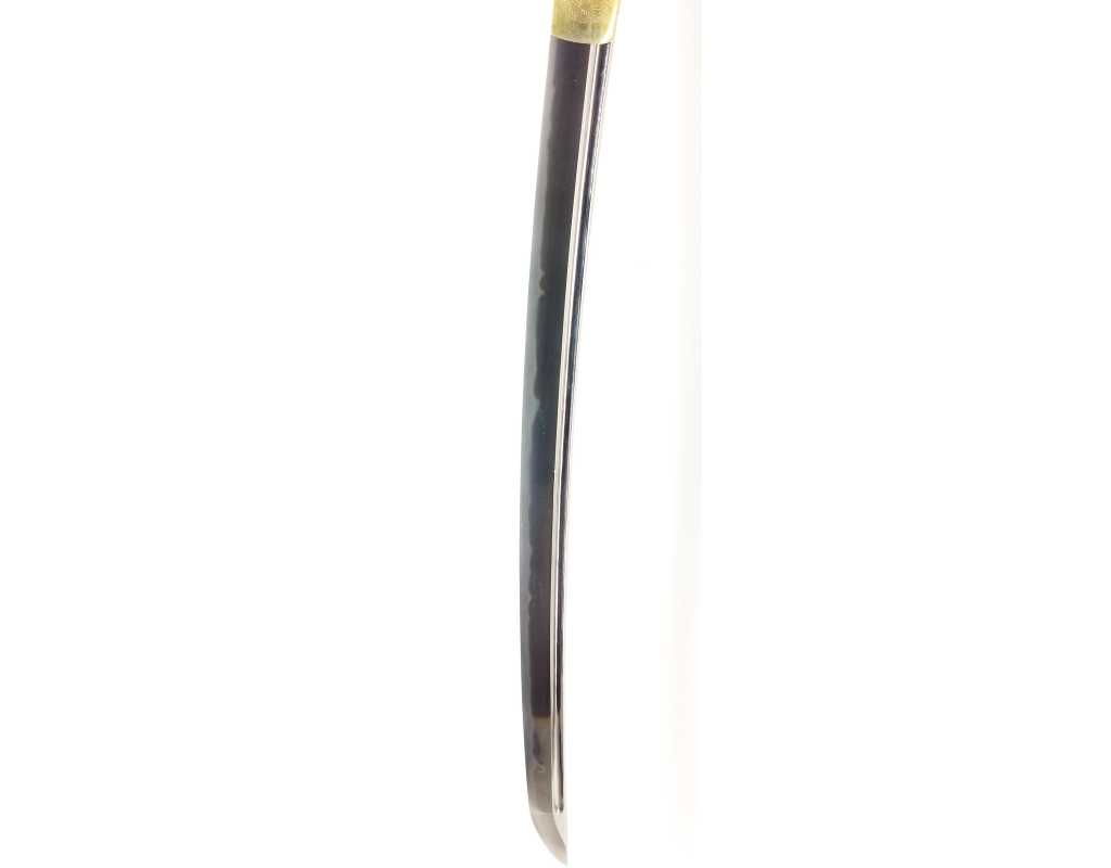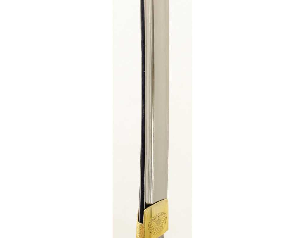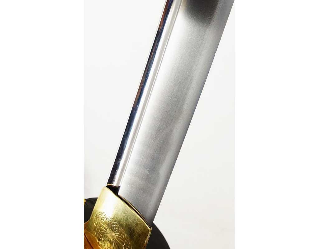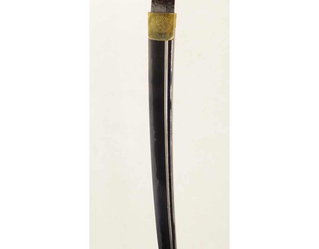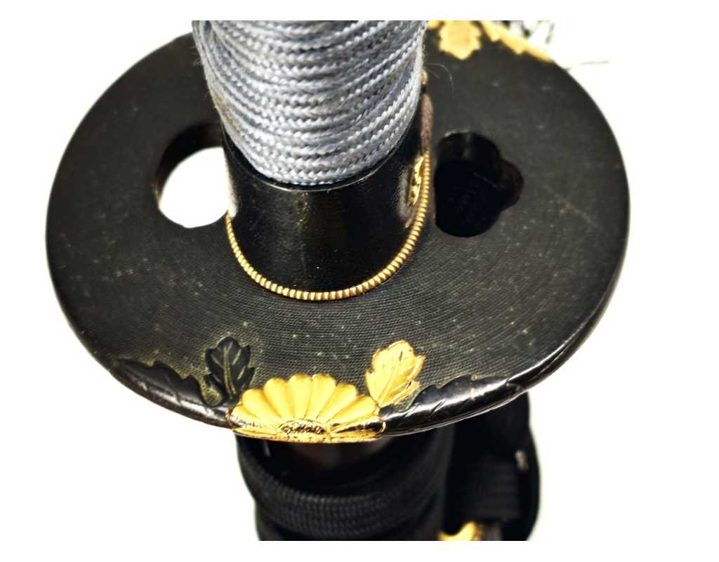 Nagasa 51cm, polissage complet sans défaut, belle cristallisation de la trempe, beau grain de forge très fin jusqu'au boshi. Monture en shakudo noir finement perlé en nanako très fin bien en suite, incrustation or et argent de pivoine, fleur de lotus, feuilles de ginko et fleurs de pivoine, tsuba recouverte de samé d'origine, tresse de soie bleu ciel remplacée au polissage récemment, menukis d'ikebana fleuri. Saya laqué marron foncé sans accident. Longueur totale 70cm.