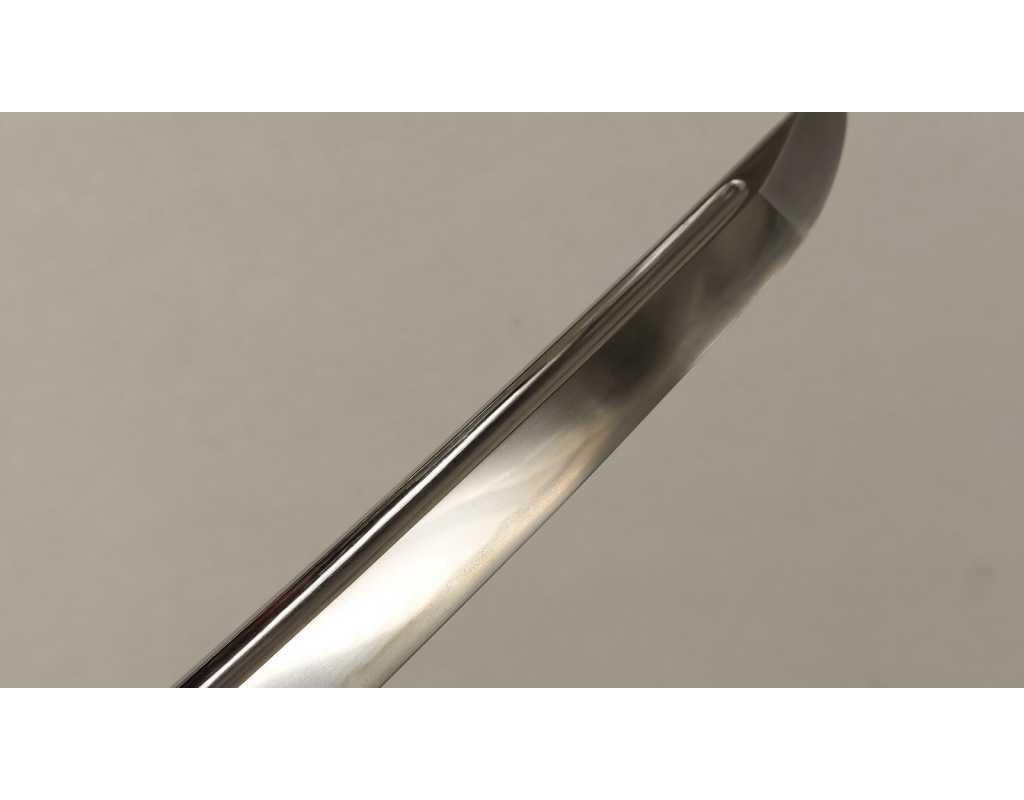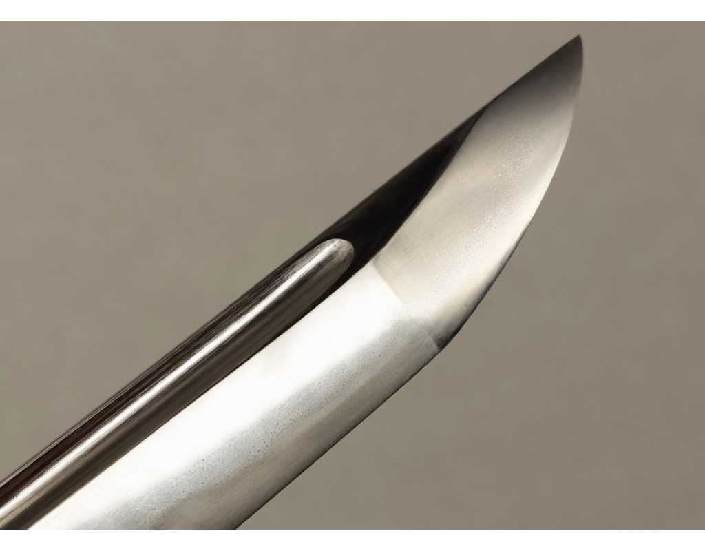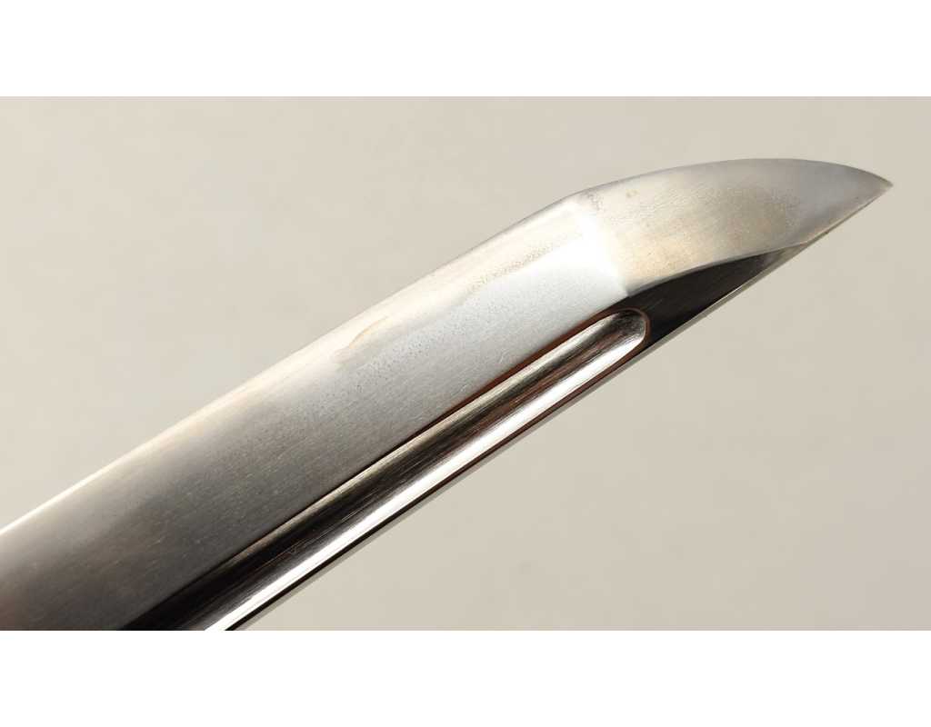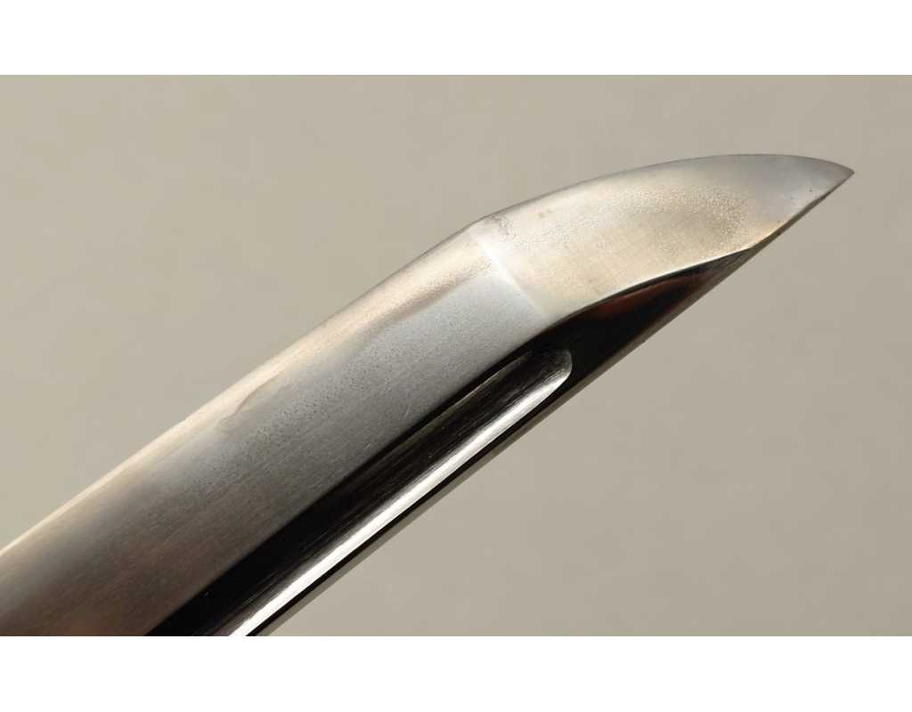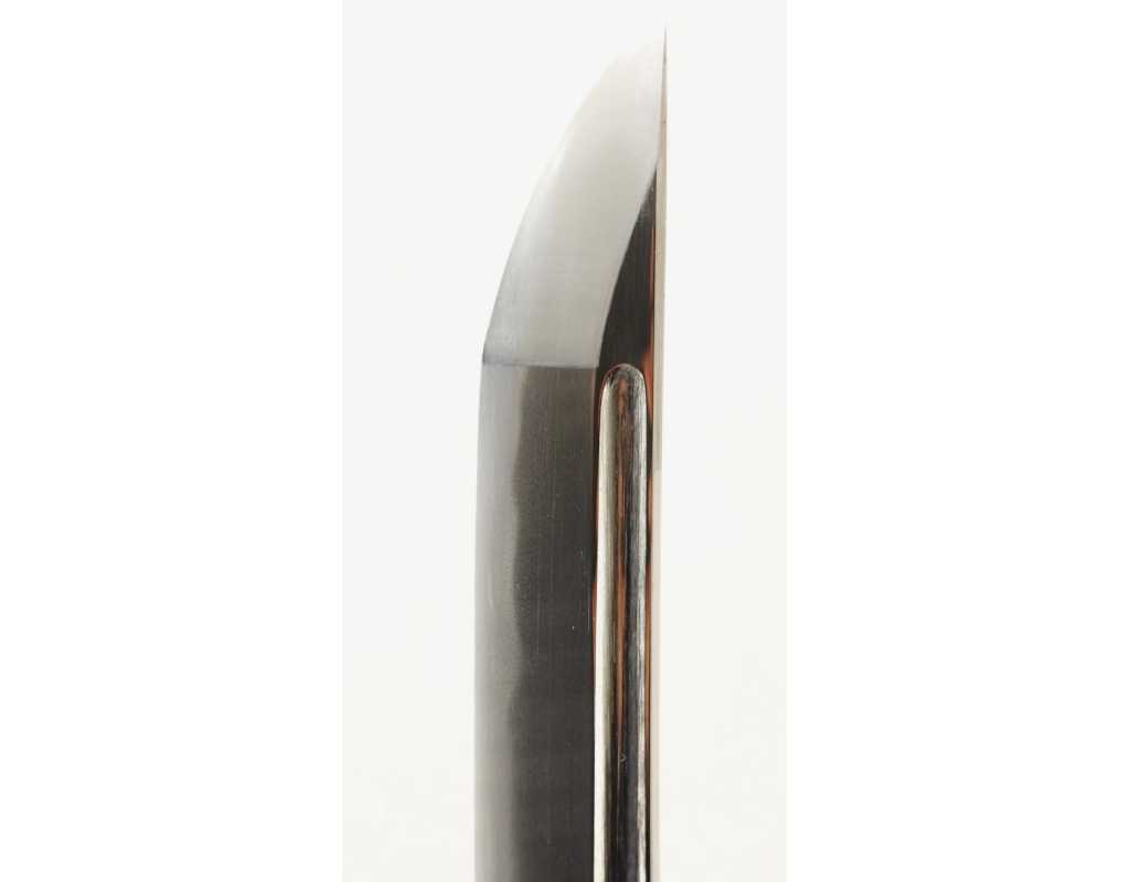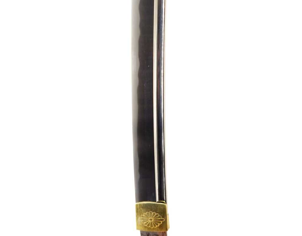 Nagasa 51cm, polissage complet sans défaut, belle cristallisation de la trempe, beau grain de forge très fin jusqu'au boshi. Monture en shakudo noir finement perlé en nanako très fin bien en suite, incrustation or et argent de pivoine, fleur de lotus, feuilles de ginko et fleurs de pivoine, tsuba recouverte de samé d'origine, tresse de soie bleu ciel remplacée au polissage récemment, menukis d'ikebana fleuri. Saya laqué marron foncé sans accident. Longueur totale 70cm.
