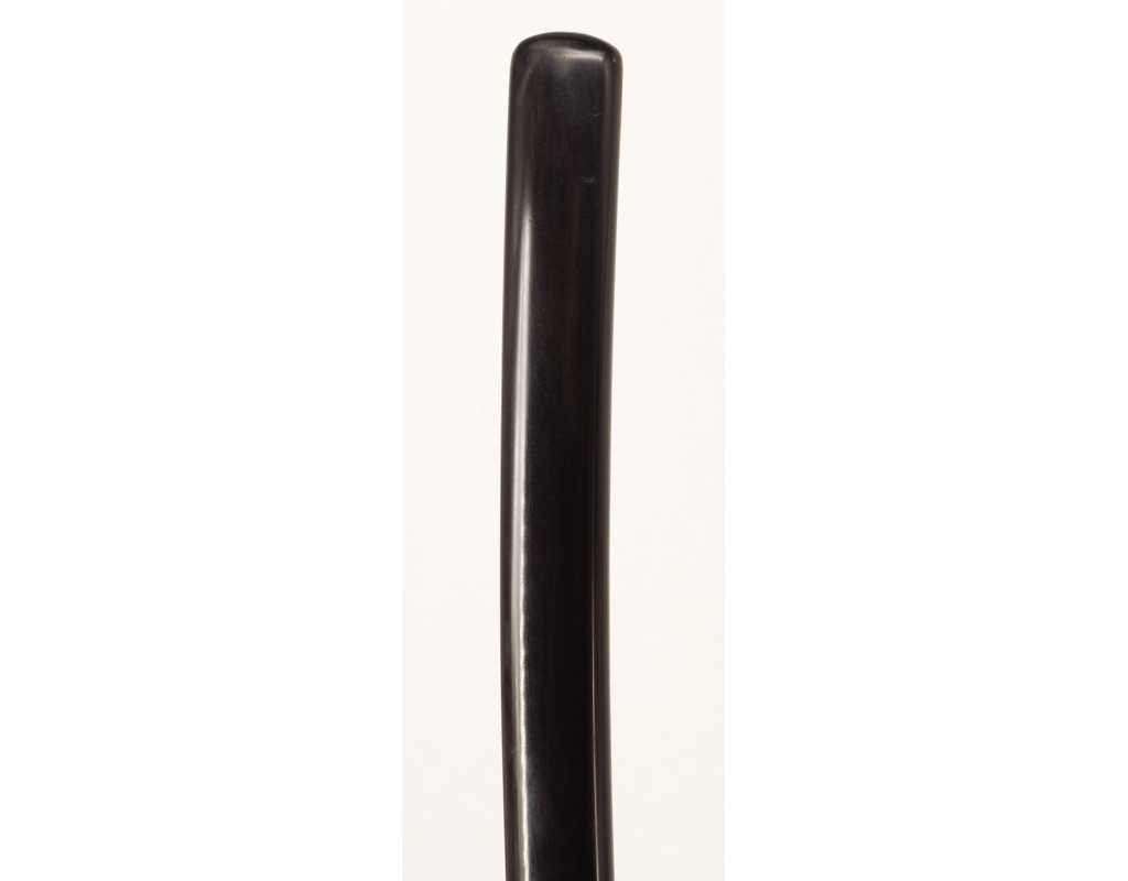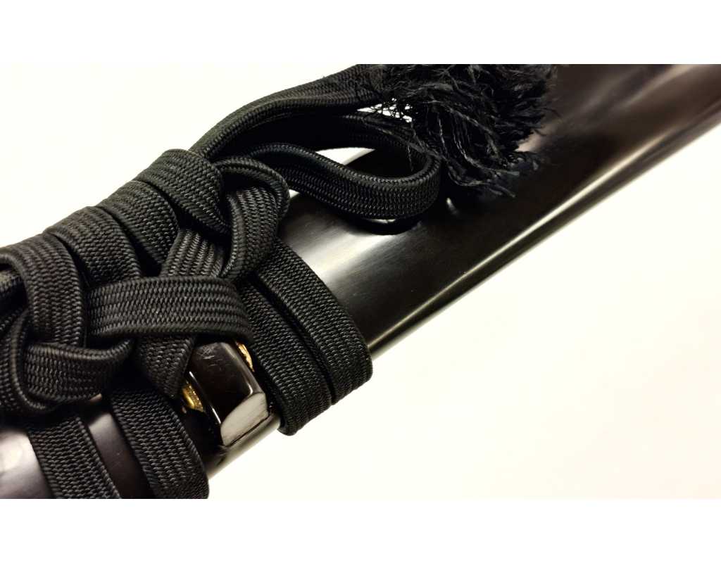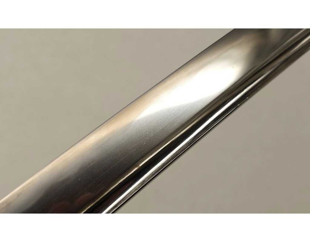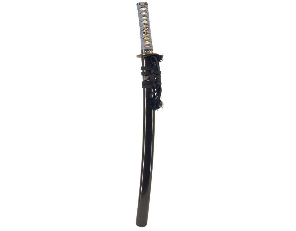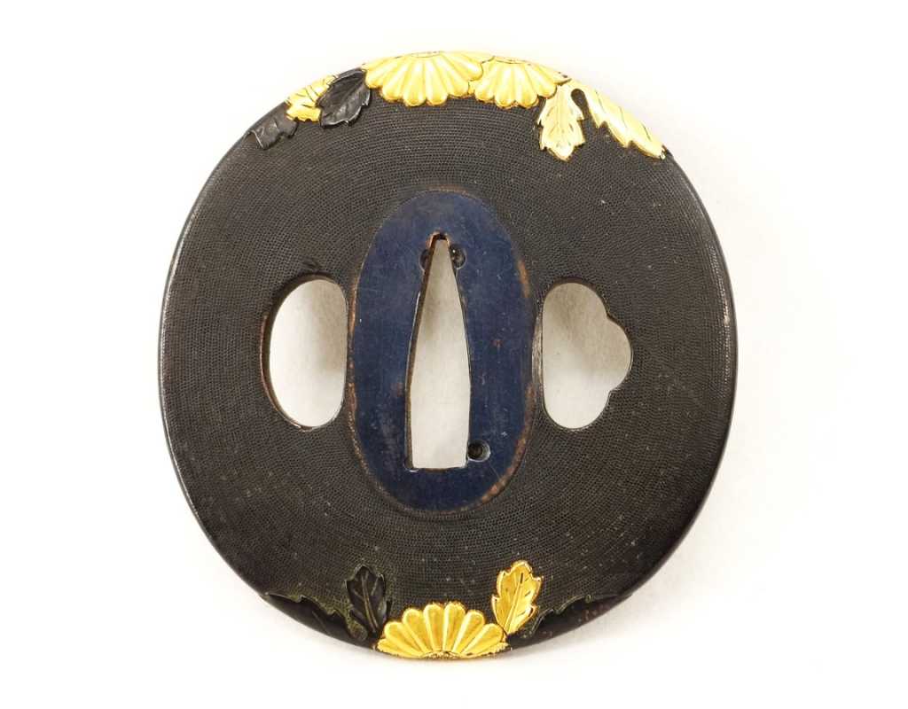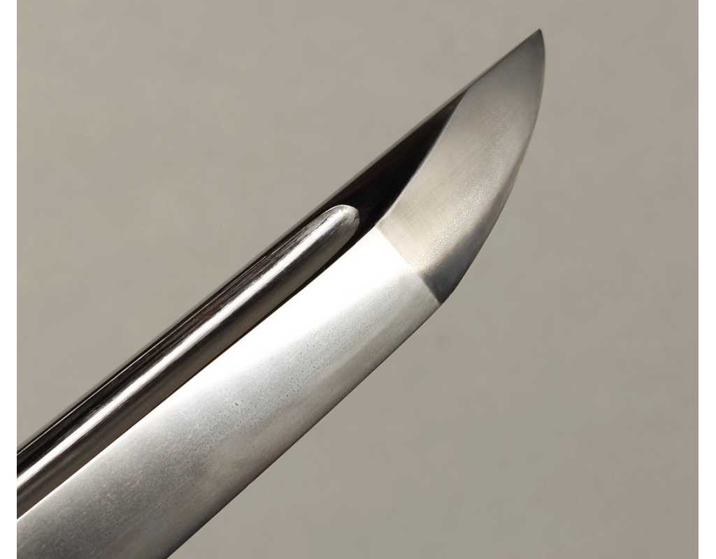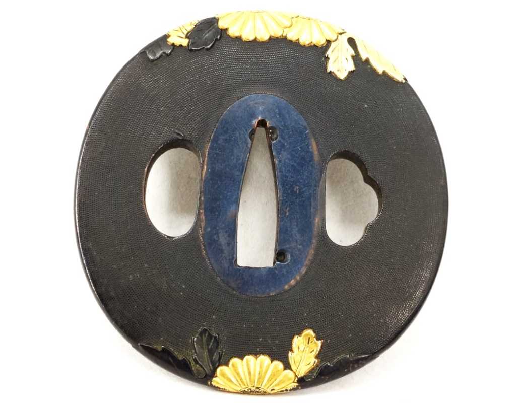 Nagasa 51cm, polissage complet sans défaut, belle cristallisation de la trempe, beau grain de forge très fin jusqu'au boshi. Monture en shakudo noir finement perlé en nanako très fin bien en suite, incrustation or et argent de pivoine, fleur de lotus, feuilles de ginko et fleurs de pivoine, tsuba recouverte de samé d'origine, tresse de soie bleu ciel remplacée au polissage récemment, menukis d'ikebana fleuri. Saya laqué marron foncé sans accident. Longueur totale 70cm.