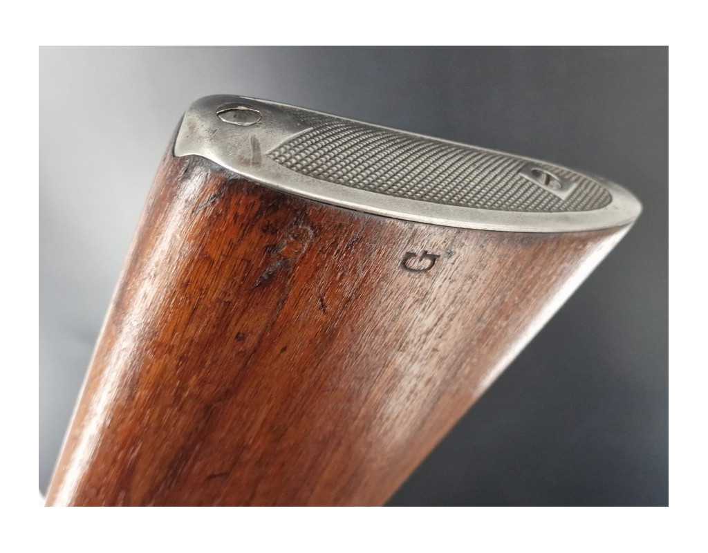 Très rare Fusil Winchester modèle 1886 en Express 50/110. Calibre 50 WCF (50/110). Brevet de 1885 sous le pontet, numéro 148900 qui correspond à la date de fabrication 1910. Bronzage d'origine patiné sans oxydation, marquages non atténués. Mécanique complète et fonctionnel avec toutes pièces d'origine. Canon rond de 66cm bien marqué du fabriquant du calibre, rayures d'aspect brillantes proche miroir sans usure particulière ni aucun tache. Queue de culasse avec son marquage du modèle, patent bien marquée sous le levier d'armement près du numéro de série. Crosse 33.5cm et garde main en noyer sans usure sur les angles, talon en fer quadrillé. Outils de rechargement 50/90 et étuis / douilles 50/110 disponible sous présentation d'une licence de tir.