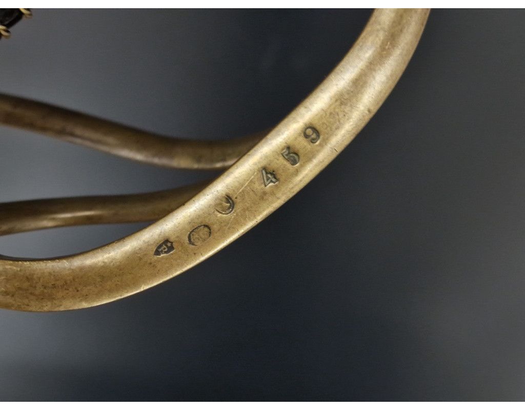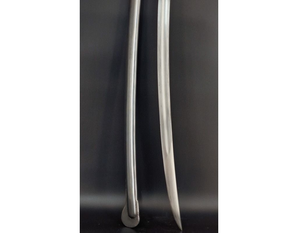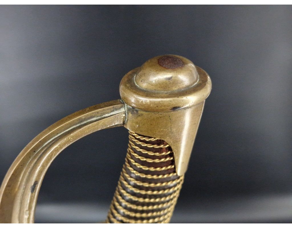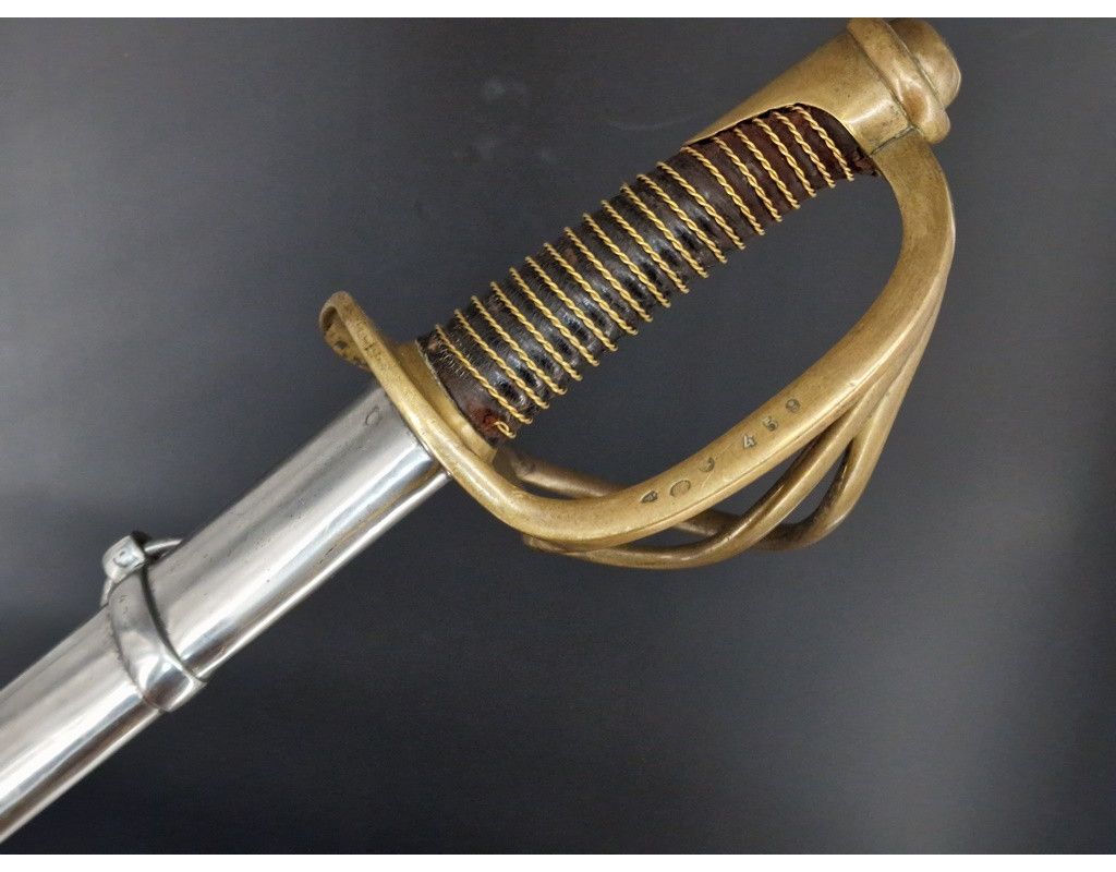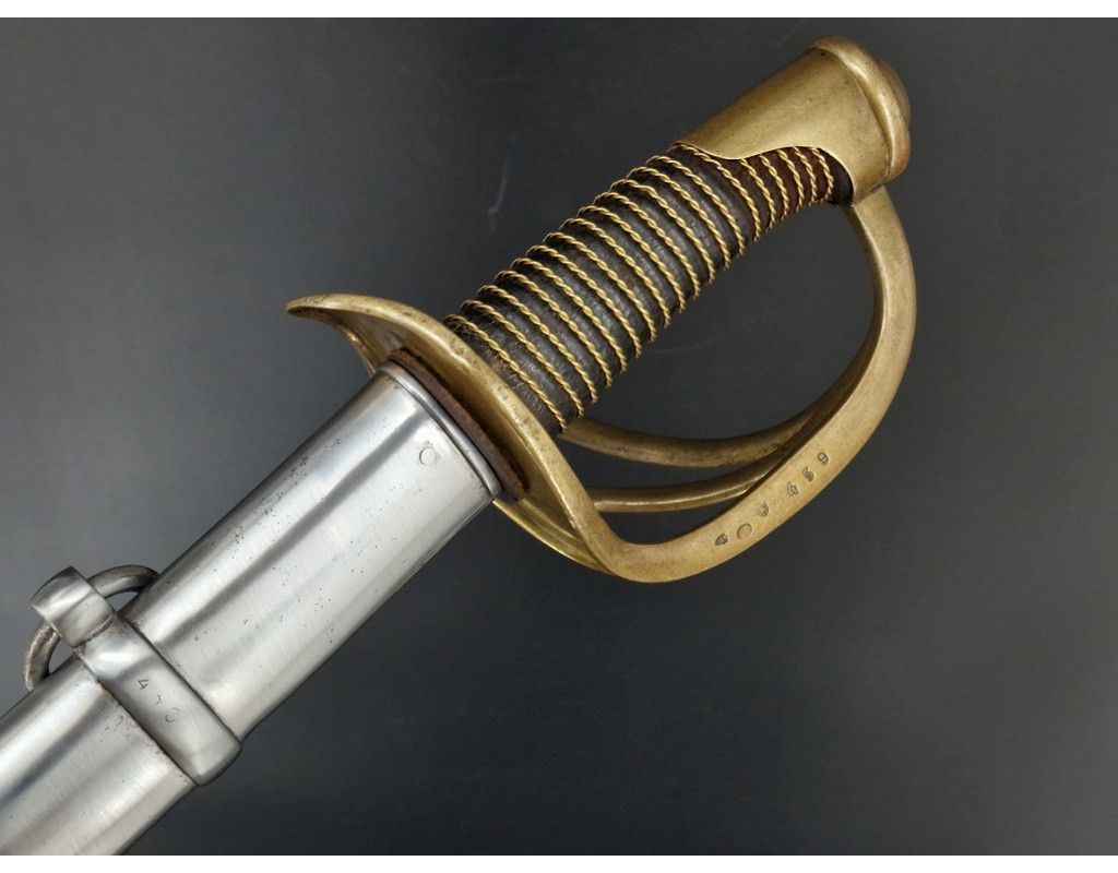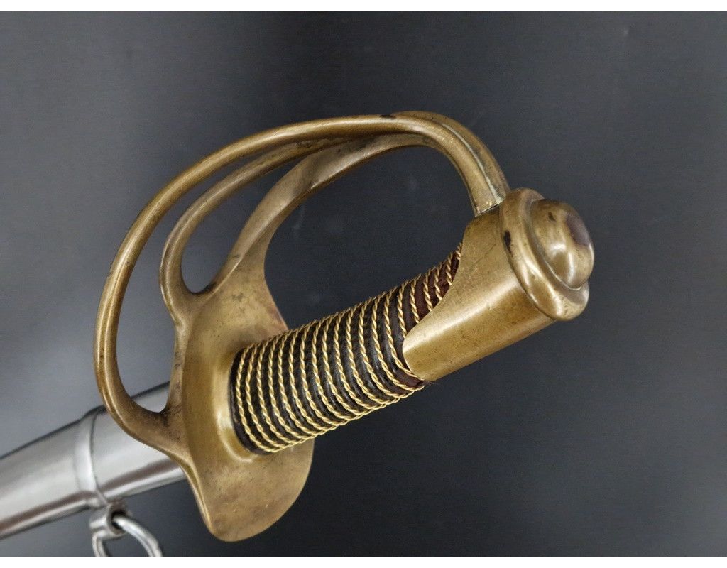 Sabre troupe de cavalerie légère modèle 1822, marquage de "Manufacture Nationale de Châtellerault Mai 1851" époque Seconde République (24 février 1848 - 2 décembre 1851) avant proclamation de Napoléon III comme empereur. Monture en laiton à trois branches de garde, calotte à dôme de rivure intact et sans jeu, poignée gainée de cuir filigrané de laiton torsadé. Lame courbe de 918mm polie blanche sans aucune oxydation dans sa finition d'origine comme neuve, bien réceptionnée au talon et bien marquée au dos sans atténuation "Manufacture Nationale de Châtellerault Mai 1851". Fourreau à deux anneaux de bélières poli blanc sans oxydation ni choc, numéro identique à la branche de garde légèrement atténué par le polissage. France 2è République, TBE lame comme neuve, belle patine du laiton et finition du fourreau.