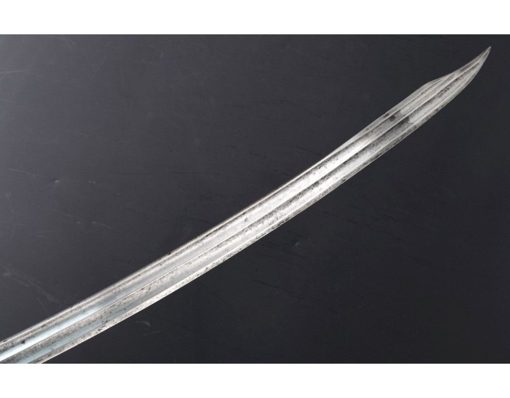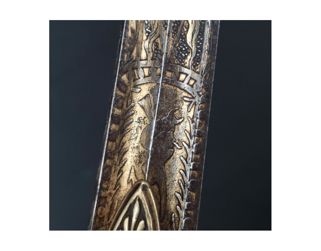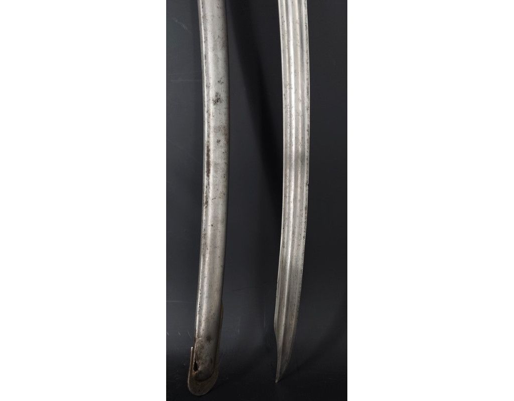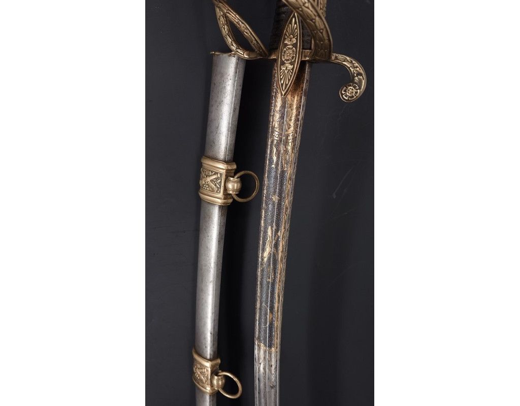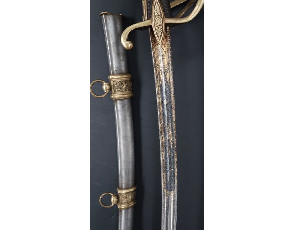 Sabre des officiers supérieurs d'artillerie à cheval de la garde royale, monture à la chasseur modèle 1813 en usage sous la restauration et poursuit sa carrière malgré le nouveau modèle de 1816. Monture de laiton à trois branches, arc de jointure et deux branches secondaires ciselée de feuillage stylisé, oreillons en navette à fleurette centrale flanquée de deux palmettes, quillon courbé et calotte à queue richement ciselés, médaillon à trois fleurs de lys encadré de feuilles de lauriers partant d'un rameau médian et d'une grande palmette au dos de la calotte en partie effacé en 1815 pendant les 100 Jours, fusée bois encordée recouverte de basane non filigranée. Lame courbe de 82,5cm à pans creux gravée à l'acide de têtes de turc, étoiles, lunes et trousseaux de flèches, pointe terminée en langue de carpe. Fourreau fer à entrée de cuvette et deux fort bracelets de laiton ciselés de canons entrecroisés et au dos de bombes flamme rayonnantes. Belle patine, fines taches d'oxydation.
