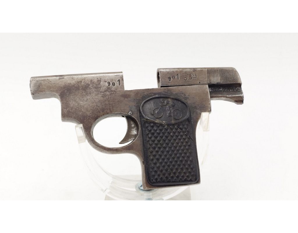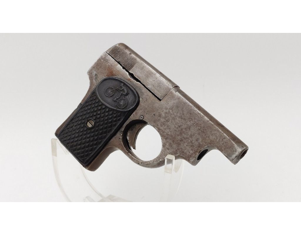 Peu commun pistolet à un coup calibre 6mm annulaire, plaquettes de crosse moulée au motif de cycliste, arrêtoir de culasse pour chambré la cartouche, canon lisse. Longueur 11cm