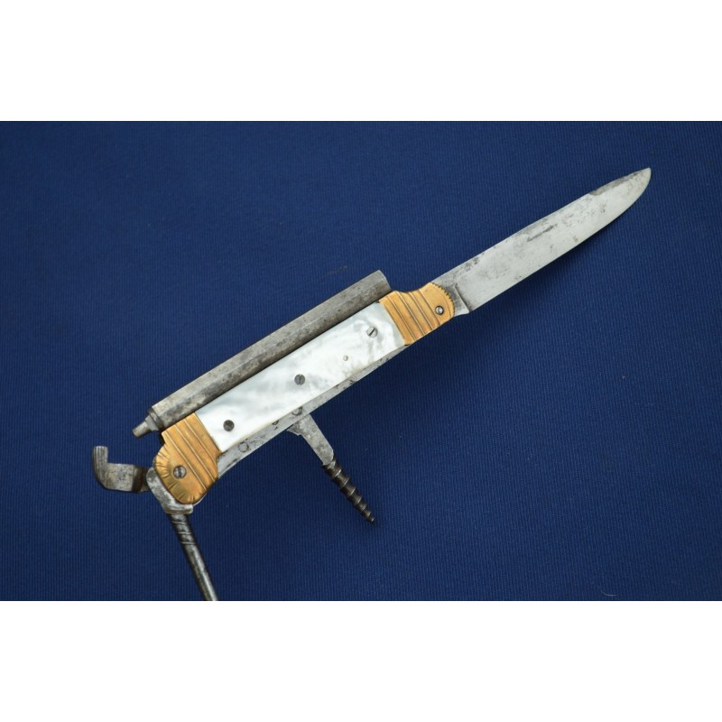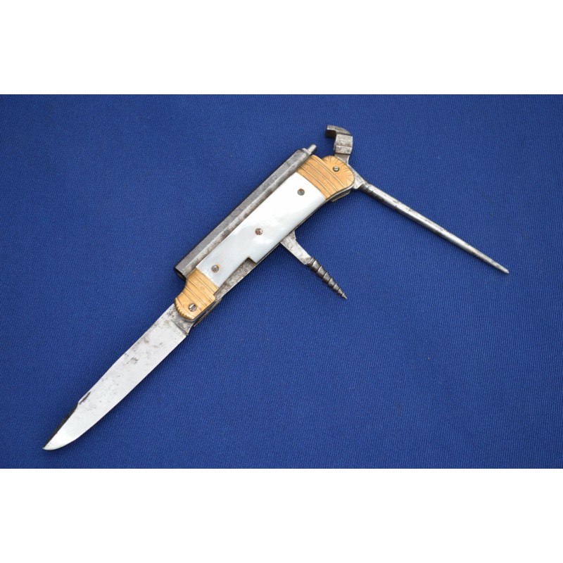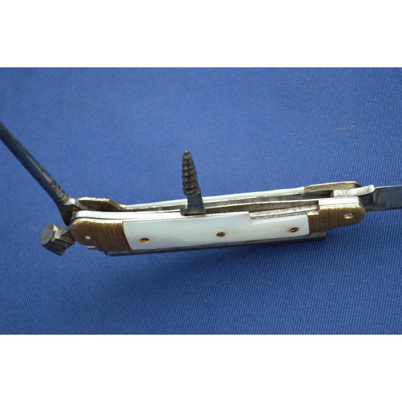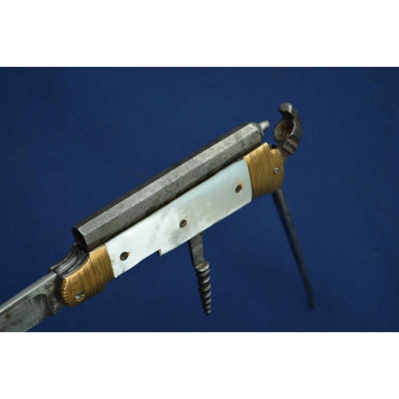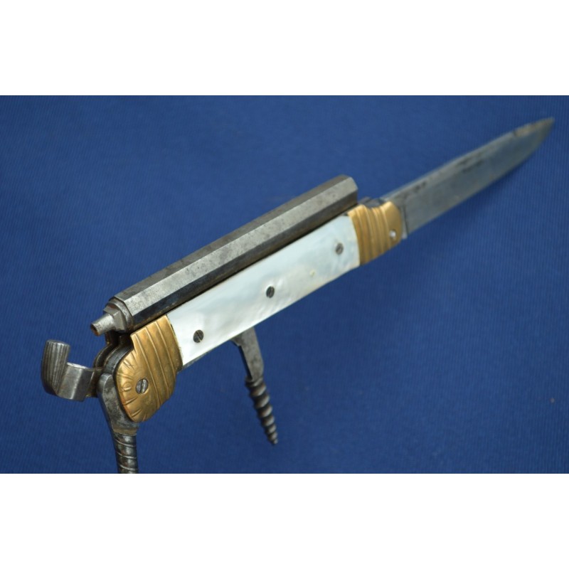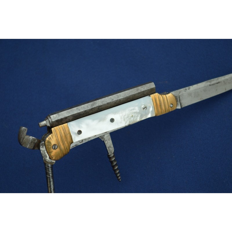 Pistolet couteau à un coup à piston en calibre 9mm, exécuté et marqué de l armurier Boden à Namur sous les plaquettes. Mécanisme complet et fonctionnel avec toutes pièces d origine. Chiens et canon en fer, mise à feu par une détente tire bouchon repliable. Canon à pans, lisse, long de 10cm, sans oxydation. Lame en fer de 10cm, à contre tranchant, aucune oxydation ou diminution. Mitres en laiton travaillé, plaquettes en nacre non accidentées. Tire lacet qui sert de poignée lors du tir auquel il manque le crochet à l extrémité. Rare objet en excellent état de conservation, avec une très bonne mécanique sans jeu et des ressorts bien fermes. Il satisfera une collectionneur d armes atypiques Européenne du XIXè.