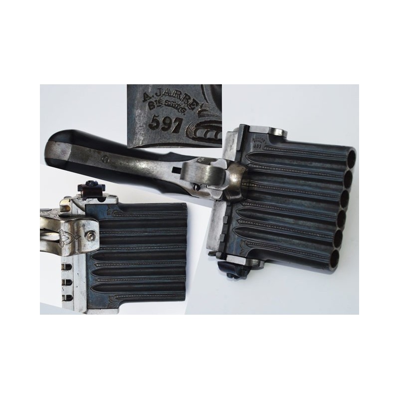 Rarissime petit pistolet Jarre en calibre 8mm à broche, bien poinçonné A Jarre Breveté SGDC et numéroté 597, système à répétition dit Harmonica à 6 canons rayés, ciselés et bronzés. Mécanique irréprochable avec toutes pièces d origine. Carcasse poinçonnée également, finition polie blanc avec belles gravures de feuilles de vignes sans aucune oxydation. Plaquettes en ébène avec une réparation sur celle de droite.