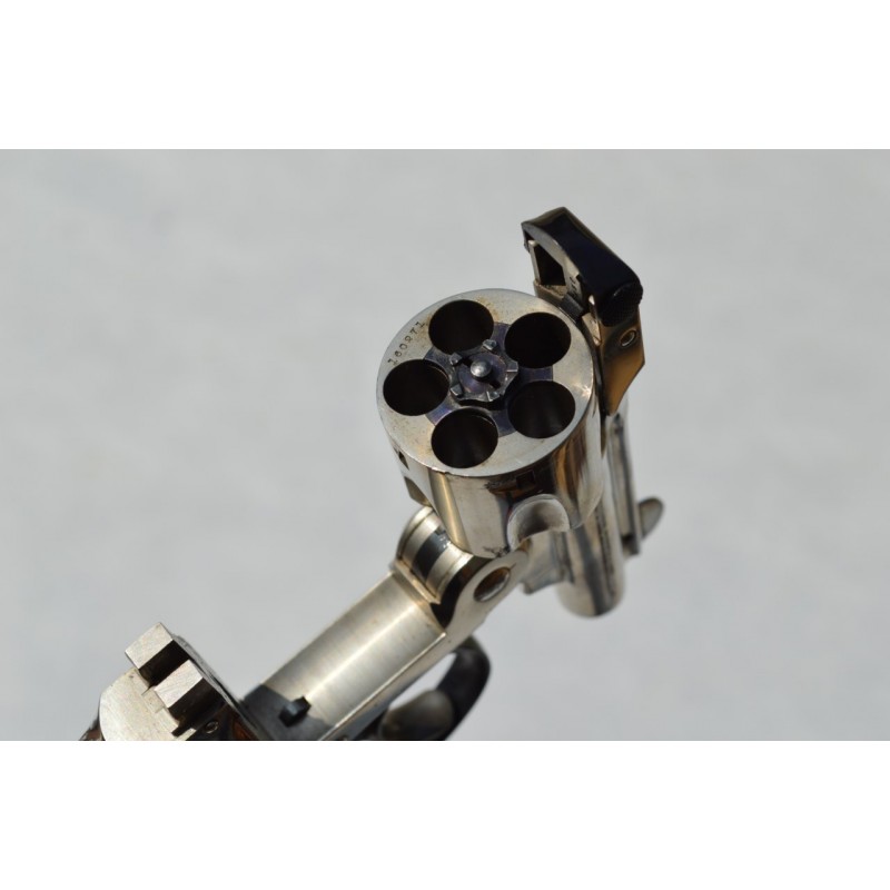Revolver Smith & Wesson Bicycle, capacité 5 coups en double action, calibre 32 S&W court. Nickelage d'origine bien brillant avec deux infimes taches d'oxydation sur le barillet surement du à son repos dans l'écrin velours. Beaux marquages non atténués. Pontet bronzé d'origine à 99%, détente dans son jaspage