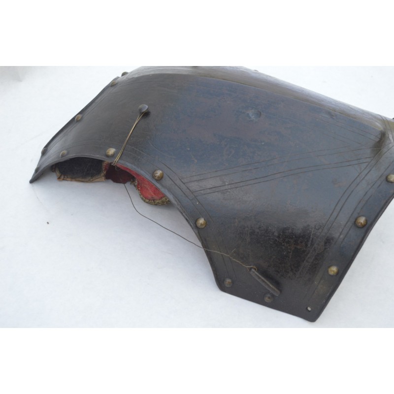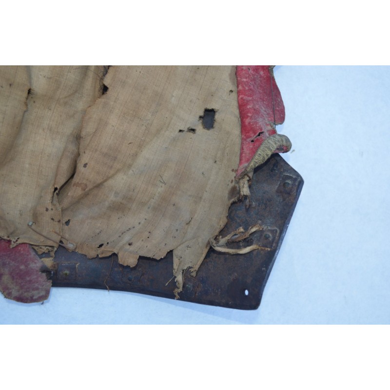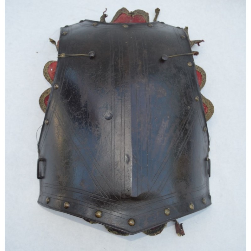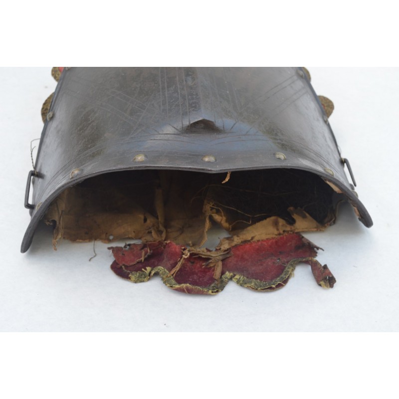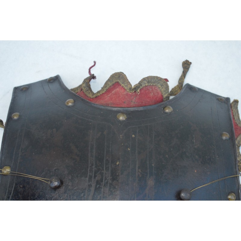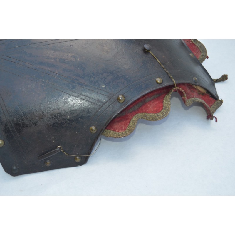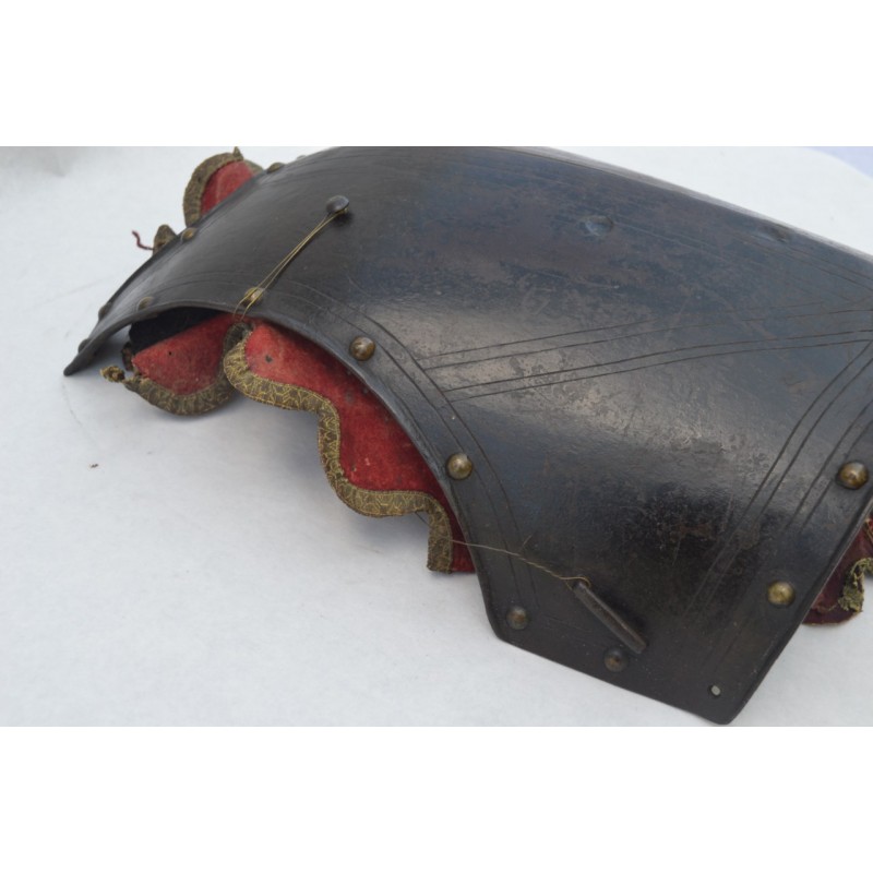 Cuirasse bronzée au noir, ornée de 28 rivets de laiton (un manquant), deux pitons de bretelles en fer, passant de ceinture à pontet et crochet rivés. Busc bien marqué, peu saillant indique une production tardive, poinçon N timbré de la couronne à trois pointe que nous savons être la marque de Besançon haut lieu de la production des armes blanches défensives, décorée de filets gravés contrairement aux cuirasses d'officier plus luxueuses qui délimitent des bandes de métal poli. Particularité intéressante de cette cuirasse qui a conservée sa matelassure en toile de chanvre rembourrée de crins avec fraise de drap rouge découpée en feston et bordée d'un galon d'argent très caractéristique de la Gendarmerie de France. Trace d'épreuve sur le devant. Protection très peu utilisée par la Troupe de part son lourd encombrement contrairement aux officiers plus obligés par les ordonnances du Roi, le plus souvent portées que le devant en présence des inspecteurs Généraux. On ne peut parler de modèle précis du fait que la prescription des ordonnances concerne les épreuves que doivent subir toutes cuirasse ou demi cuirasse.