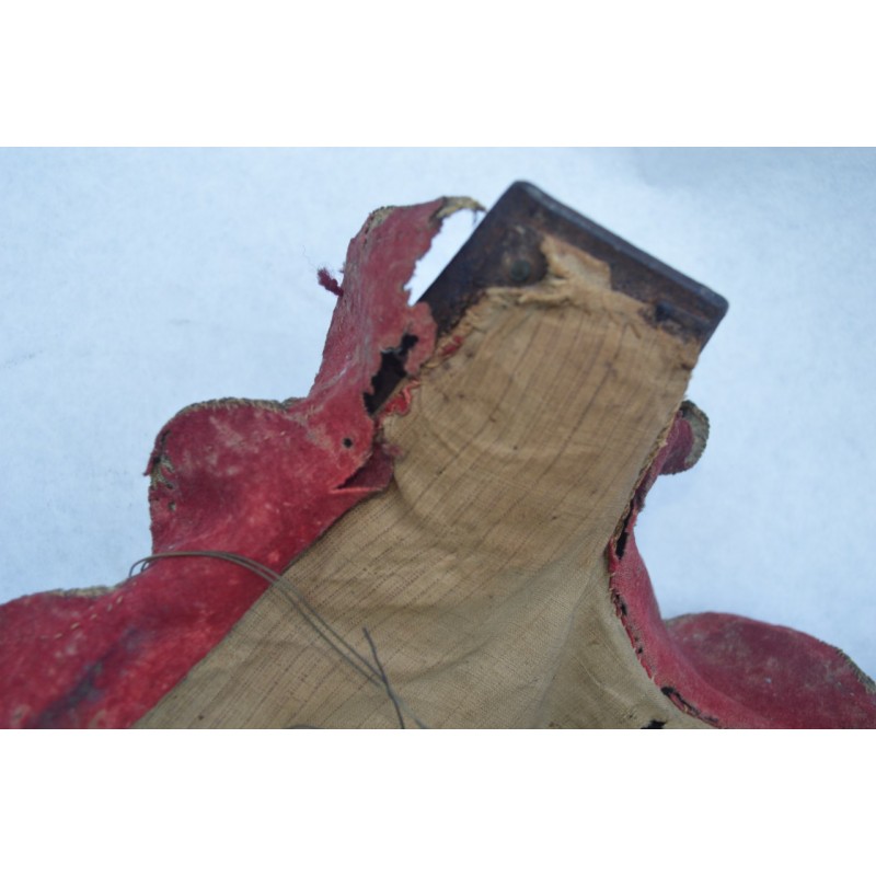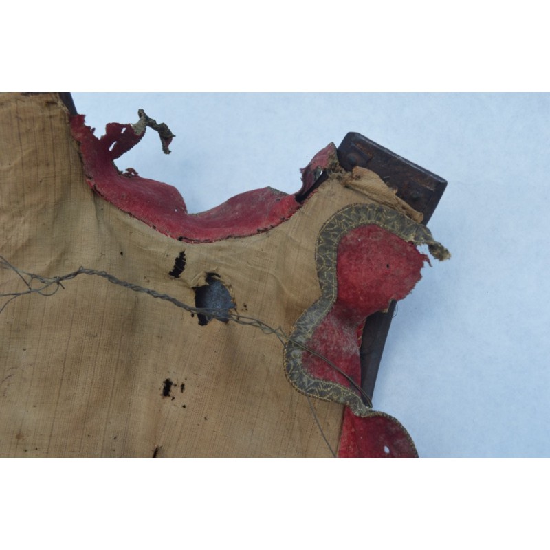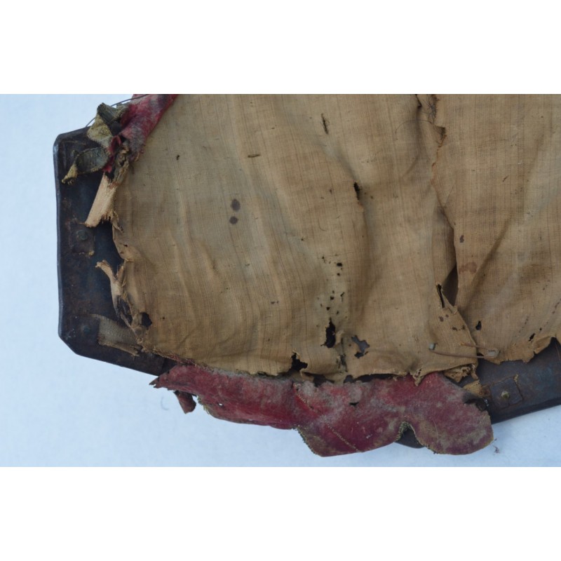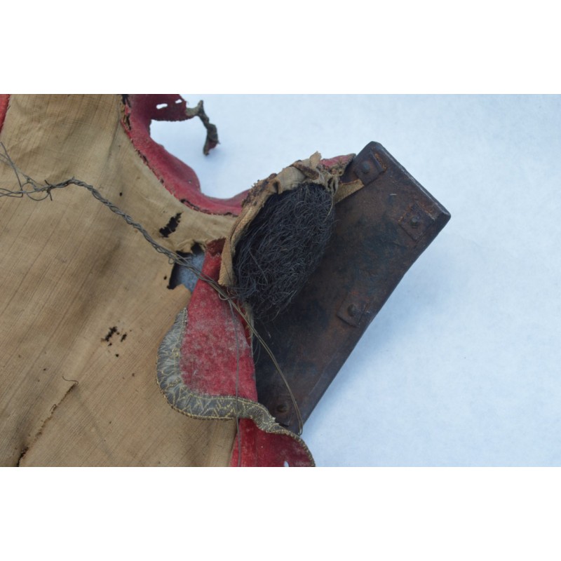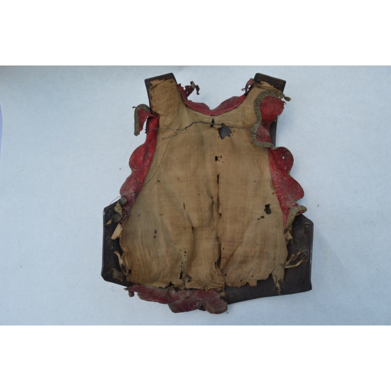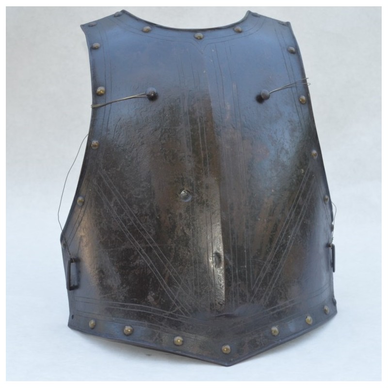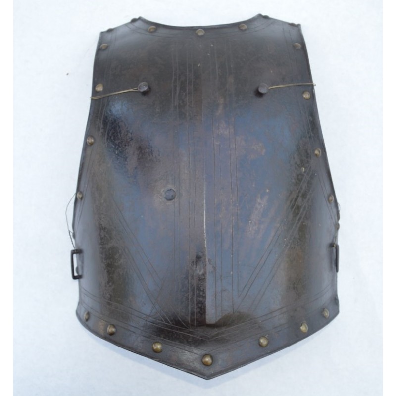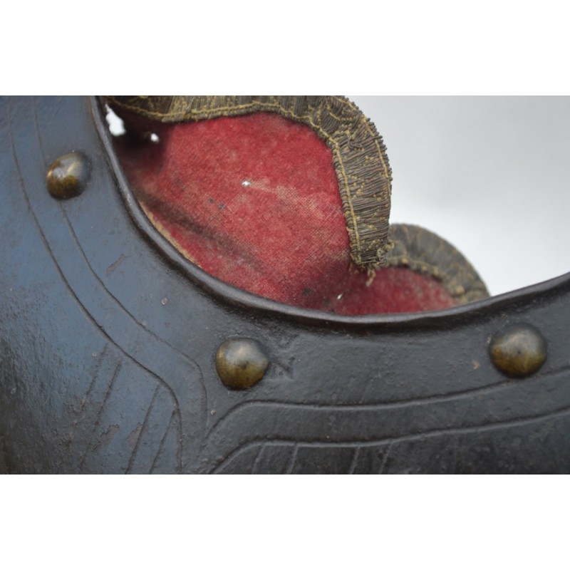 Cuirasse bronzée au noir, ornée de 28 rivets de laiton (un manquant), deux pitons de bretelles en fer, passant de ceinture à pontet et crochet rivés. Busc bien marqué, peu saillant indique une production tardive, poinçon N timbré de la couronne à trois pointe que nous savons être la marque de Besançon haut lieu de la production des armes blanches défensives, décorée de filets gravés contrairement aux cuirasses d'officier plus luxueuses qui délimitent des bandes de métal poli. Particularité intéressante de cette cuirasse qui a conservée sa matelassure en toile de chanvre rembourrée de crins avec fraise de drap rouge découpée en feston et bordée d'un galon d'argent très caractéristique de la Gendarmerie de France. Trace d'épreuve sur le devant. Protection très peu utilisée par la Troupe de part son lourd encombrement contrairement aux officiers plus obligés par les ordonnances du Roi, le plus souvent portées que le devant en présence des inspecteurs Généraux. On ne peut parler de modèle précis du fait que la prescription des ordonnances concerne les épreuves que doivent subir toutes cuirasse ou demi cuirasse.