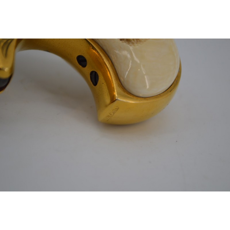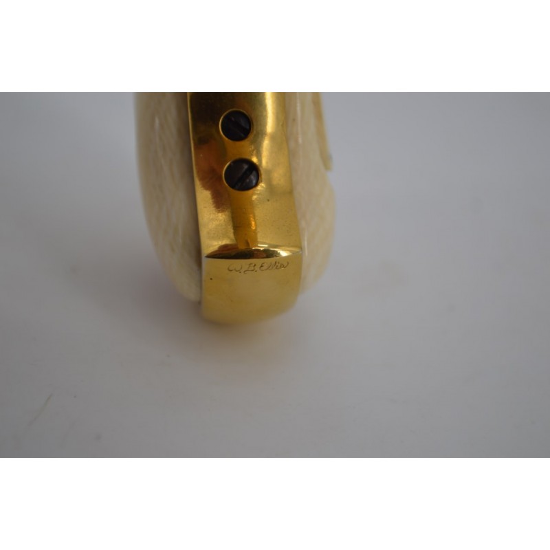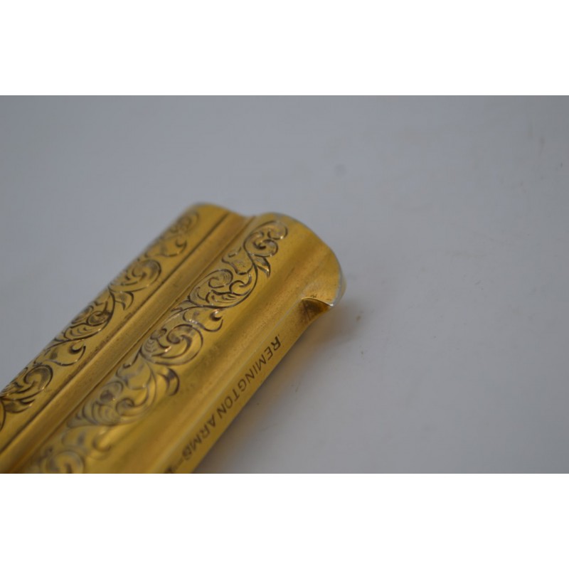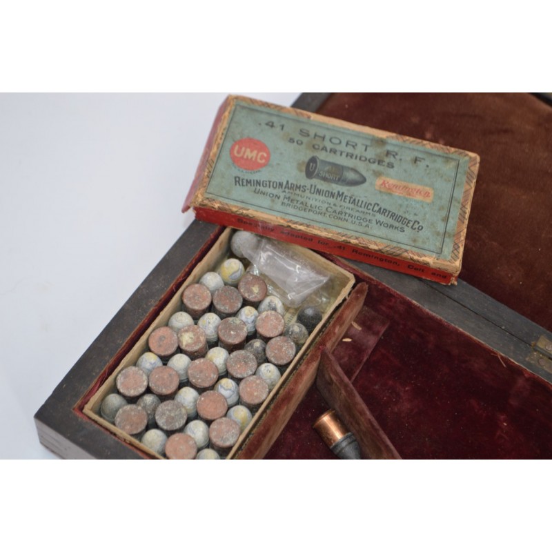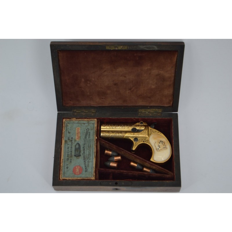 Pistolet Remington Derringer 41 RF percussion annulaire version luxueuse présentée dans son bon coffret US d'époque à intérieur velours bordeaux molletonné sur le couvercle et à compartiments sur le fond avec rare boite à munitions d'époque quasi pleine. Arme entièrement dorée sur fond d'une élégante gravure signé par W.B.ELLIS, marquage bien nette sans usure, fonctionnement mécanique parfait sans jeu. Canon à rayures peu usagées et finement tachées. Superbe plaquettes de crosse en ivoire patinée et sculptée de cartes de jeux.