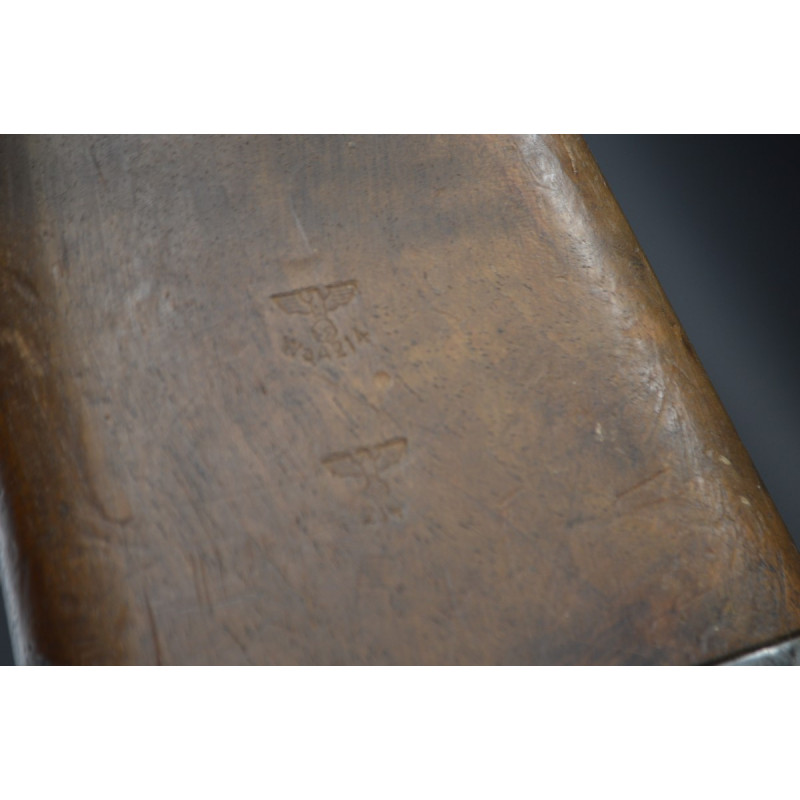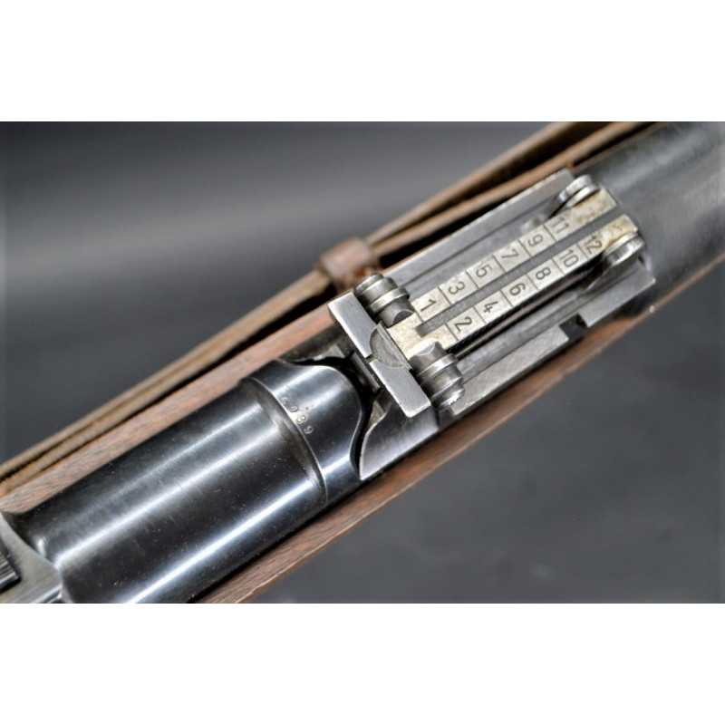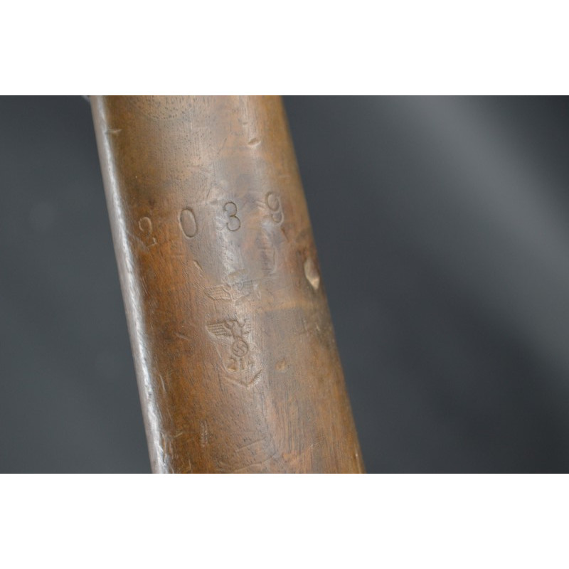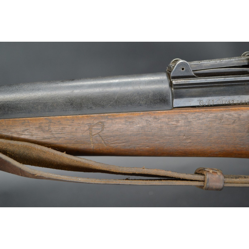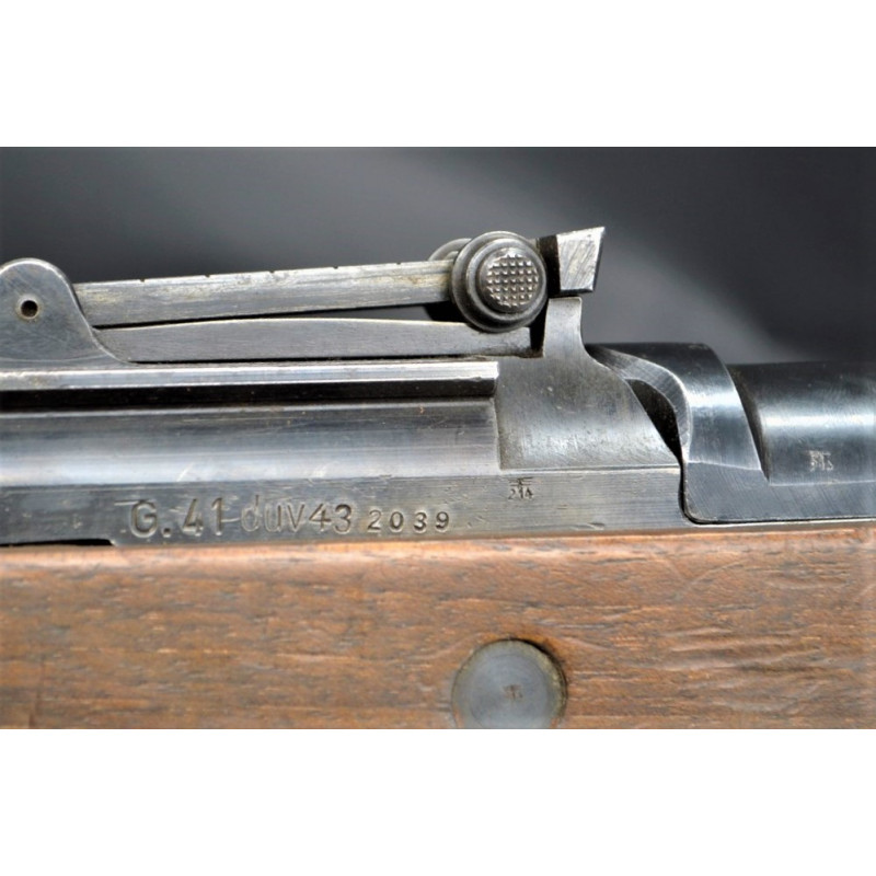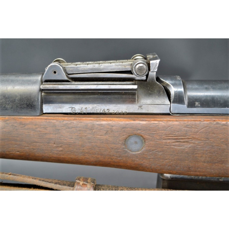 Mécanisme fonctionnel avec toutes pièces d'origine au même numéro 2039 sans exception, marquages du modèle G41 DUV43 et poinçons waffenamt 214 de l'usine Mauser parfait sans atténuation. Canon avec de très belles rayures sans usure particulière d'aspect brillantes miroir sans tache. Crosse en noyer en parfait état, garde main en bakélite noir sans usure ni accident, poinçons de réception militaire waffenamt code 214 bien nettes sur la crosse et sous la poignée. Bonne bretelle cuir marron montée d'origine en très bel état.