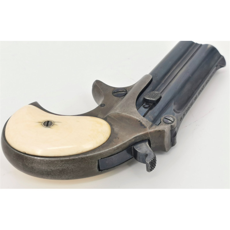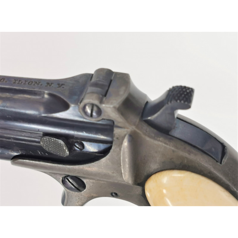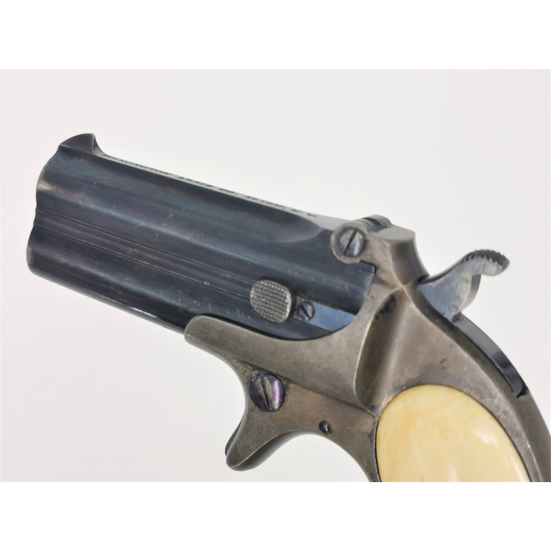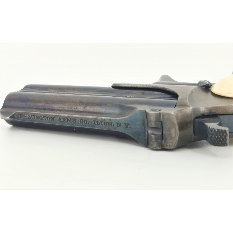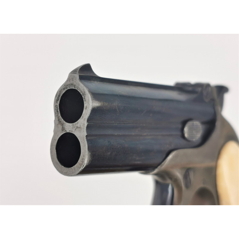 Pistolet Remington Derringer 41 rimfire, 2 coups à percussion annulaire dans son bon bronzage bleu glacé d'origine, les canon ont conservé la majorité du bronzage, la carcasse d'une nature d'acier différent a virée couleur gris marron, aucun trace d'oxydation, marquage bien nette sans usure, fonctionnement mécanique parfait sans jeu. Canon à rayures d'aspect brillantes miroir sans usure particulières, superficielles taches sans corrosion. Plaquettes de crosse en ivoire montées d'origine, belle patine.