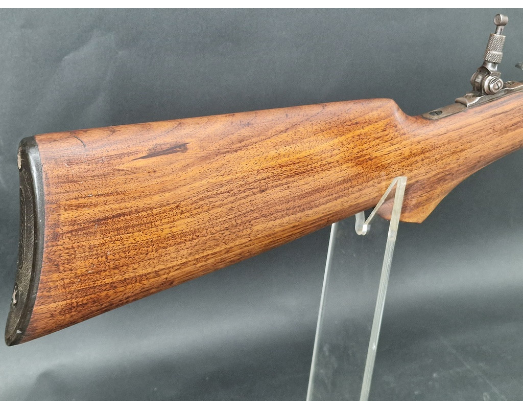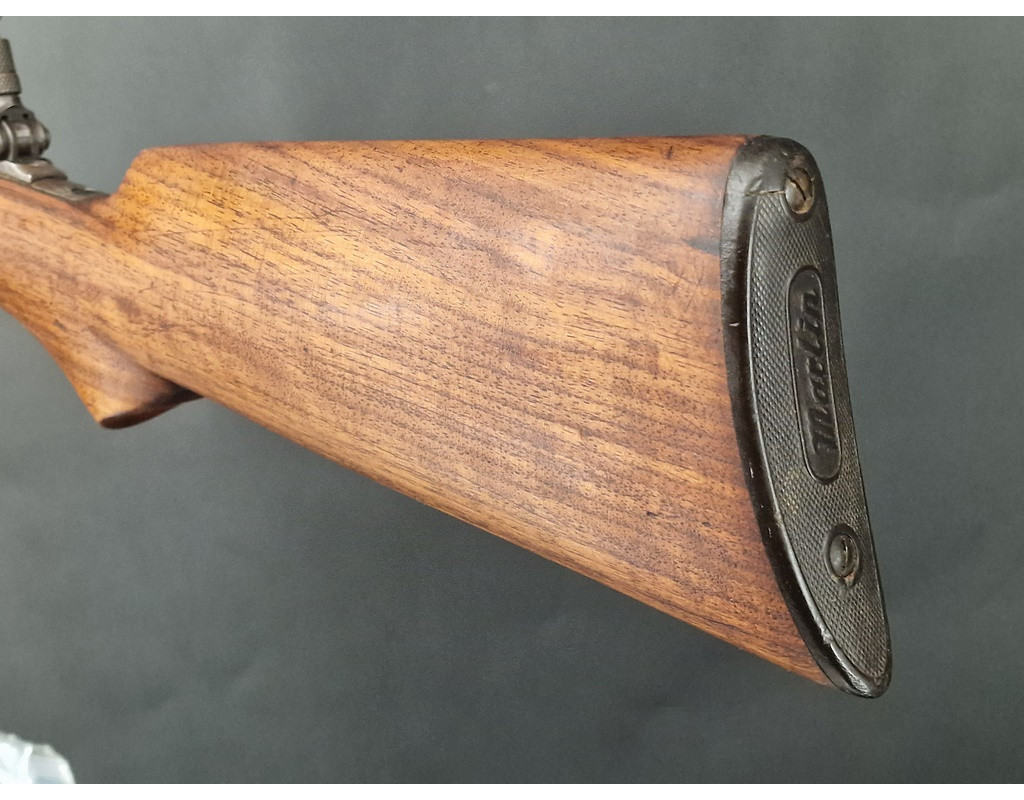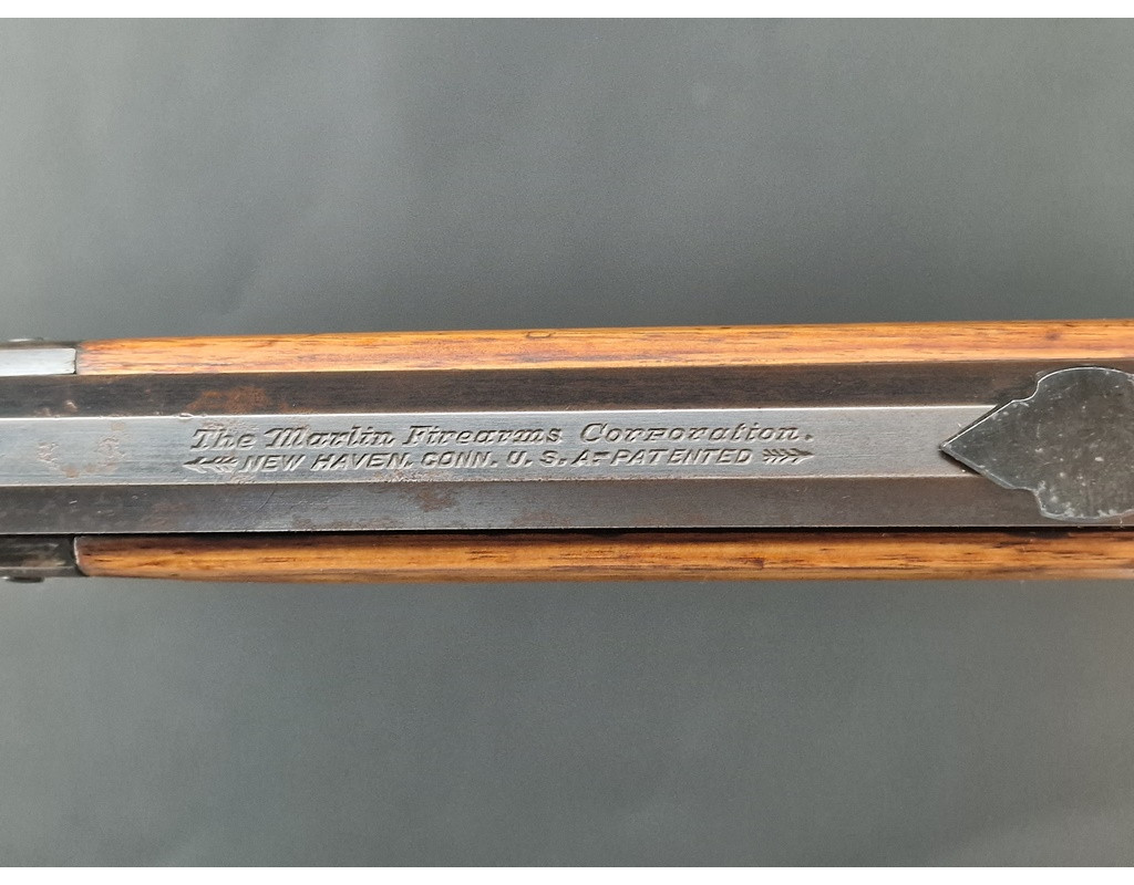 Carabine Marlin modèle 1897 calibre 22LR Take Down N°4619, facilement démontable à l'aide de la vis sur le boitier . Bronzage d'origine sans aucune oxydation, reste de jaspage sur le boitier, beaux marquages non atténués. Mécanisme complet et fonctionnel avec toutes pièces d'origine. Canon à pans, long de 61cm, rayures d'aspect miroir dans usure particulière ni aucune tache, dioptre de visée et hausse classique réglables . Crosse et garde main en noyer sans usure ni accident. Plaque de couche en gutta percha estampillée Marlin. Peu courante Marlin dans un calibre idéale pour un tireur sportif