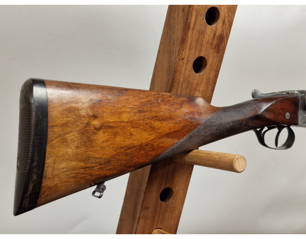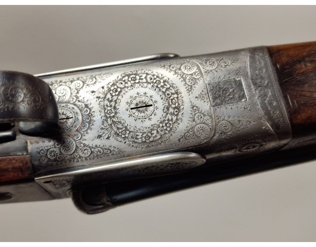 Fusil de chasse juxtaposé de luxe produit par R. Tochi Lugo pour la Fabriques d'Armes Belges de Luxe Pierre Gilbert gravé sur une des paires de canons, numéroté 1022 chambré en calibre 12/70 extra full , bascule triple verrous greener gravée et jaspé sans usure, paire de canons: Toledo de 715mm à âmes lisses miroir sans usure ni tache, Whitworth de 700mm Full/Lisse, bronzage sans usure, larges bandes de visée, aucun jeu de fermeture, mécanisme sans usure avec réserve de clef, sureté latéral, monogramme incrusté or sur le clé. Monture en noyer crosse anglaise à joue 36cm, quadrillage non usagé, talon en plastique noir, tampon derrière le repose joue V.Pizzocri Armi à Varese. Poids 3.4kg et 3.2Kg avec canon anglais, Mallettes disponibles