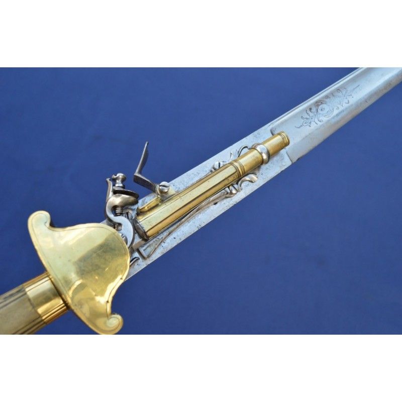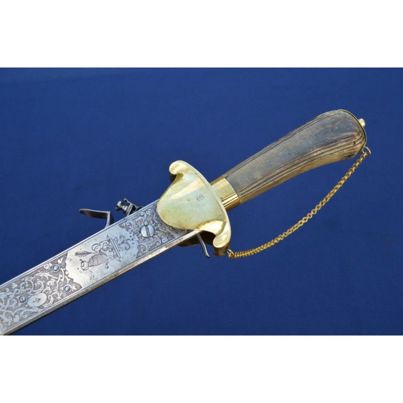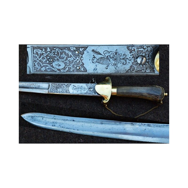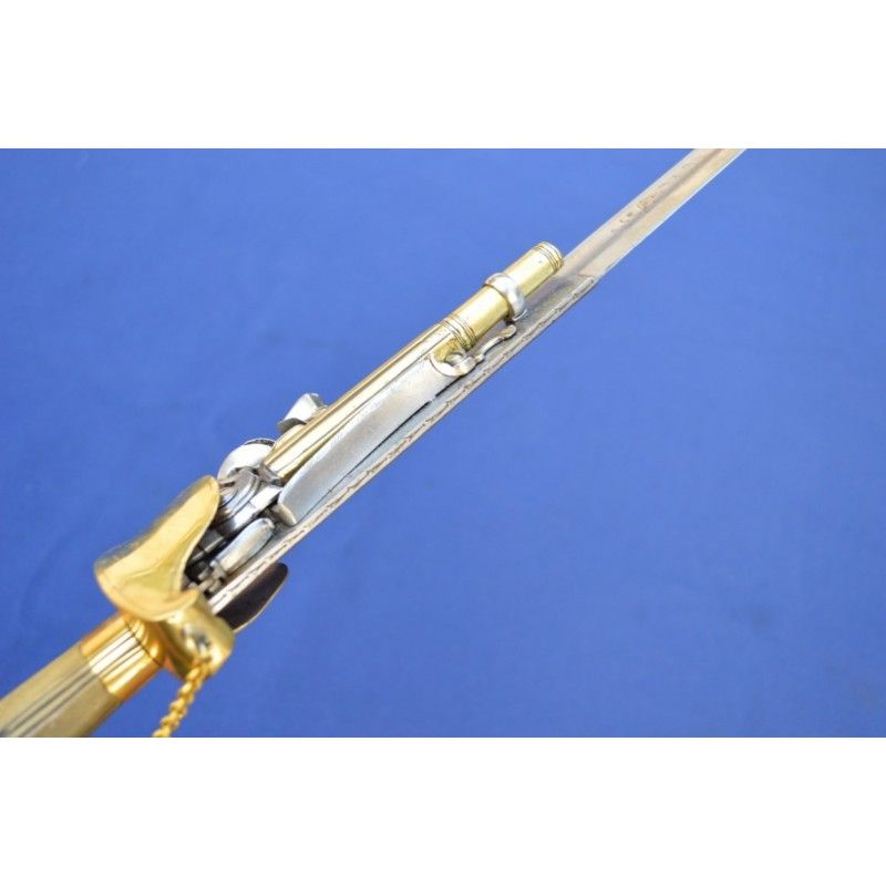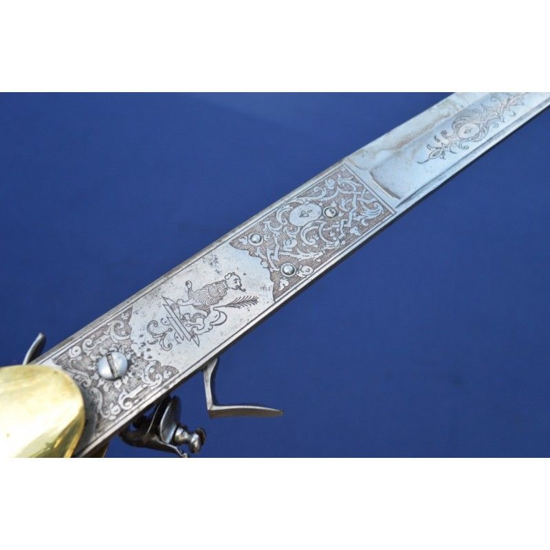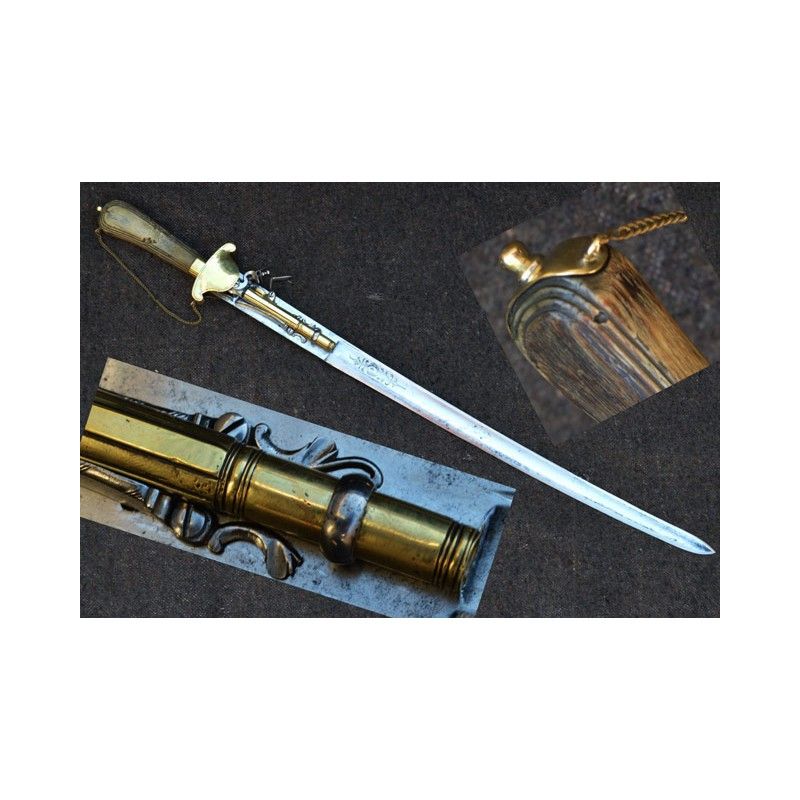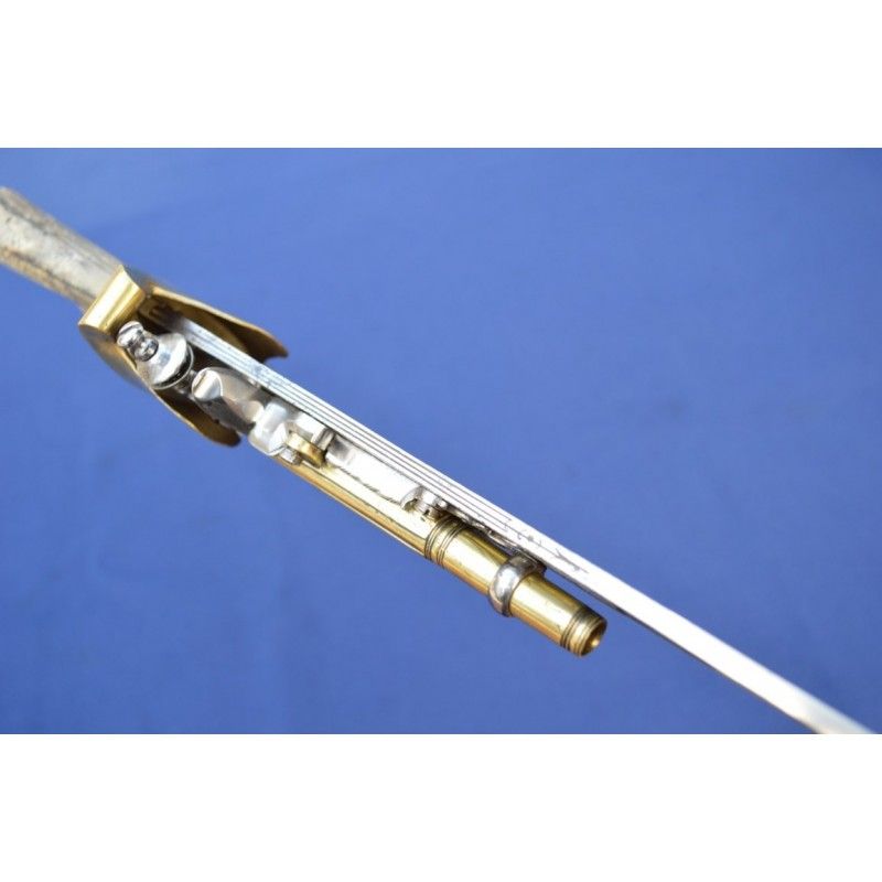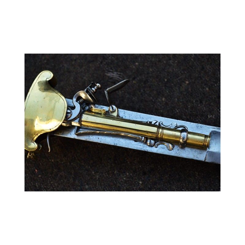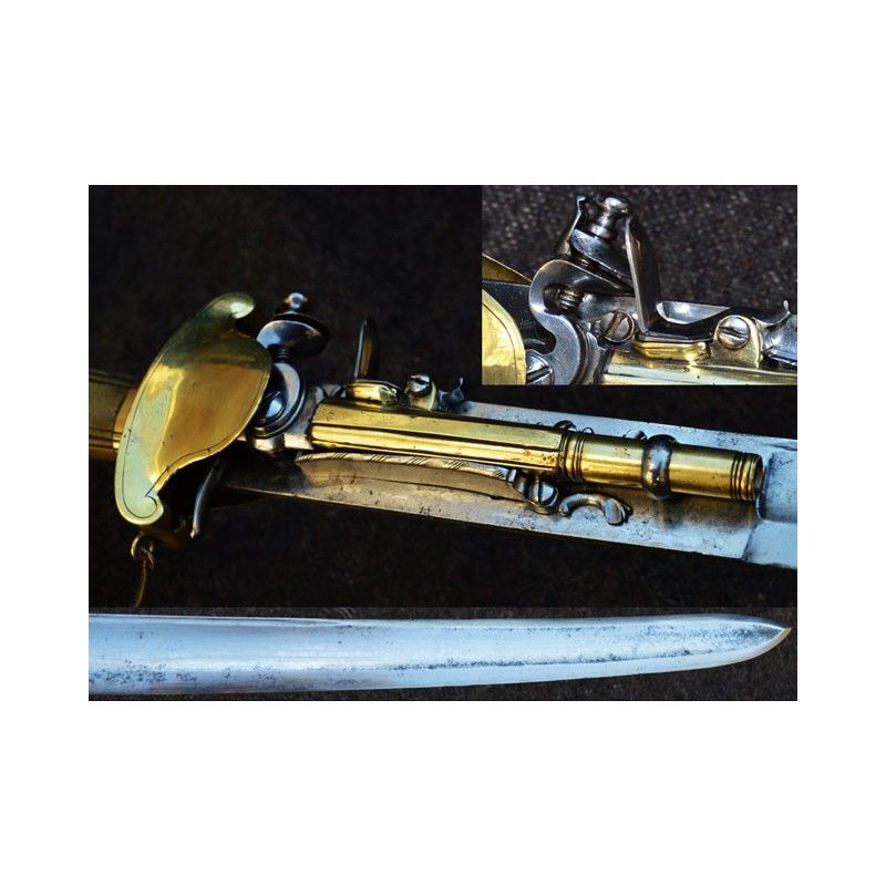 Rare dague de chasse française équipée d'un pistolet à silex. Mécanique complète et fonctionnelle avec toutes pièces d'origine en superbe état de conservation. Poignée en corne de Buffle à garniture laiton. Lame longue de 58cm, gravée au tiers et marquée de la devise Rien Ne m'Arrète au talon sous la garde, aucune oxydation. Objet de caractère qui mérite une bonne place dans une collection darmes blanches françaises du XVIIIè. Sans fourreau.