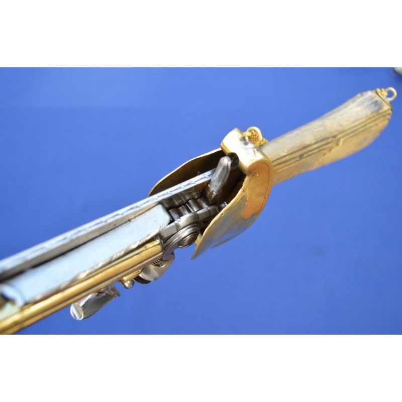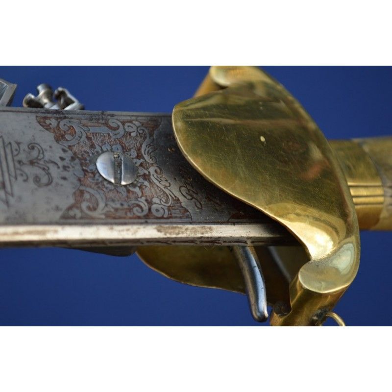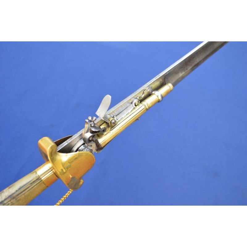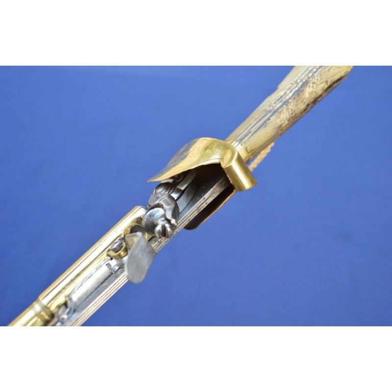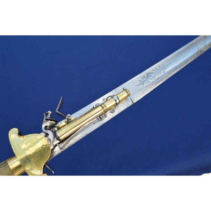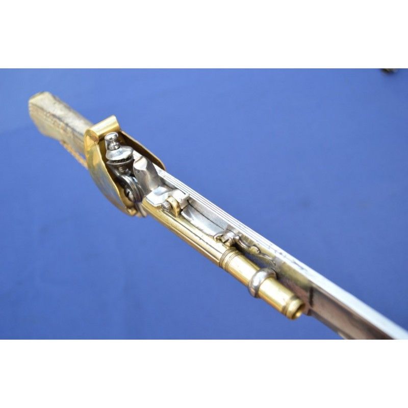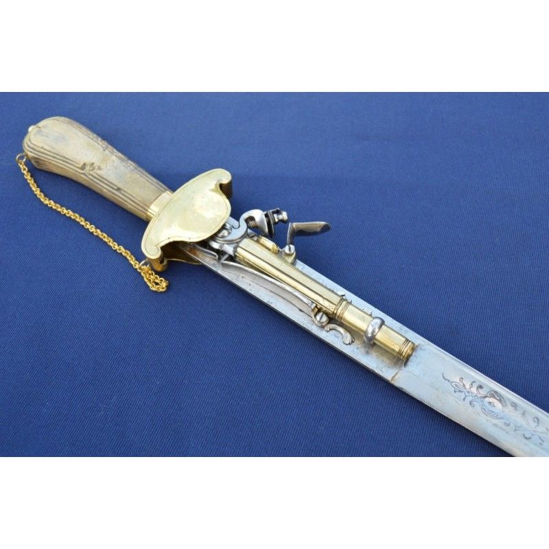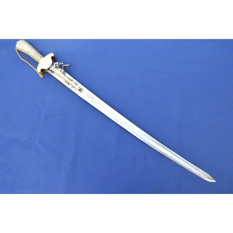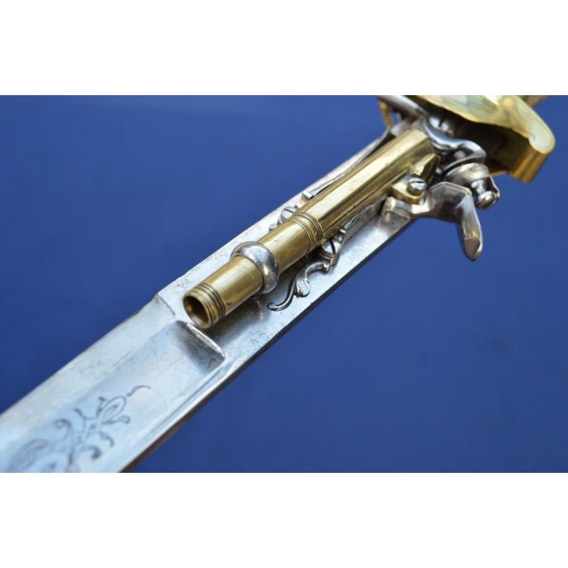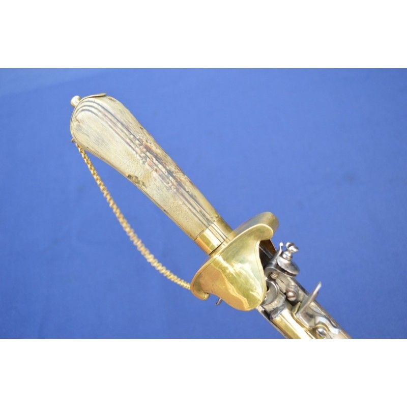 Rare dague de chasse française équipée d'un pistolet à silex. Mécanique complète et fonctionnelle avec toutes pièces d'origine en superbe état de conservation. Poignée en corne de Buffle à garniture laiton. Lame longue de 58cm, gravée au tiers et marquée de la devise Rien Ne m'Arrète au talon sous la garde, aucune oxydation. Objet de caractère qui mérite une bonne place dans une collection darmes blanches françaises du XVIIIè. Sans fourreau.