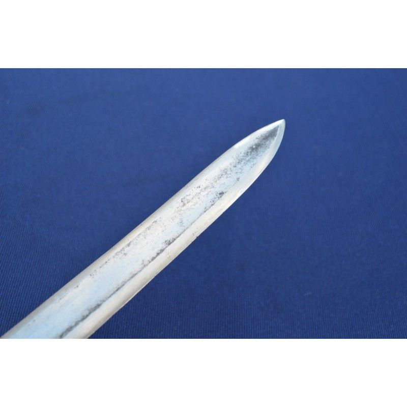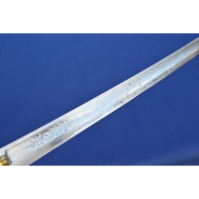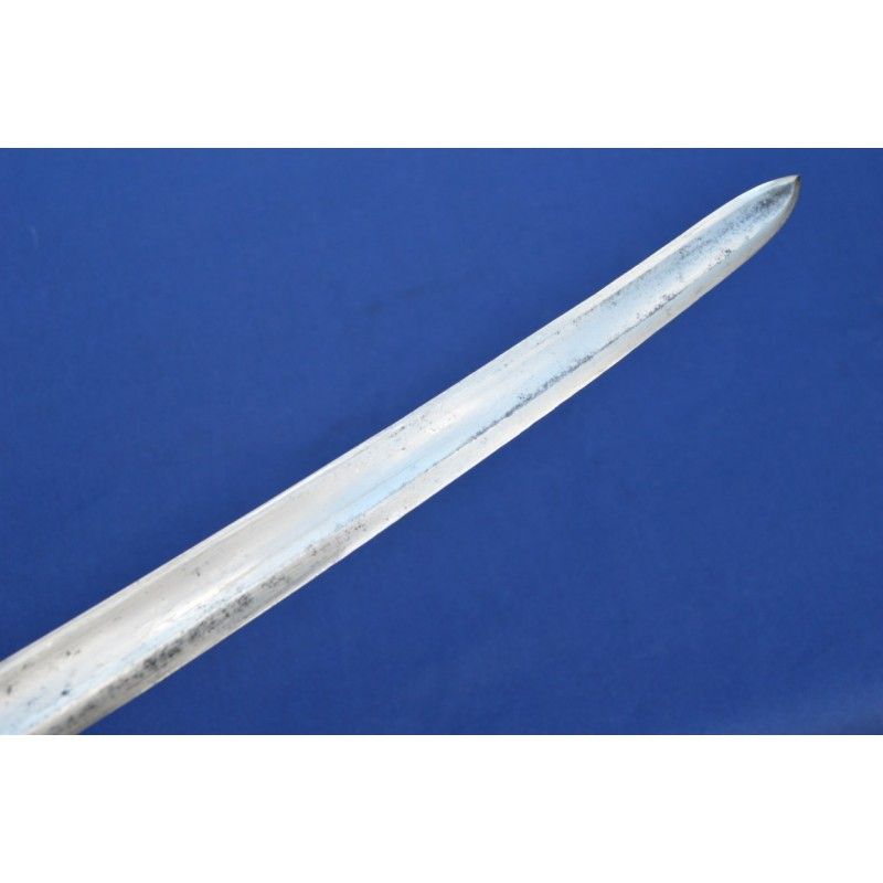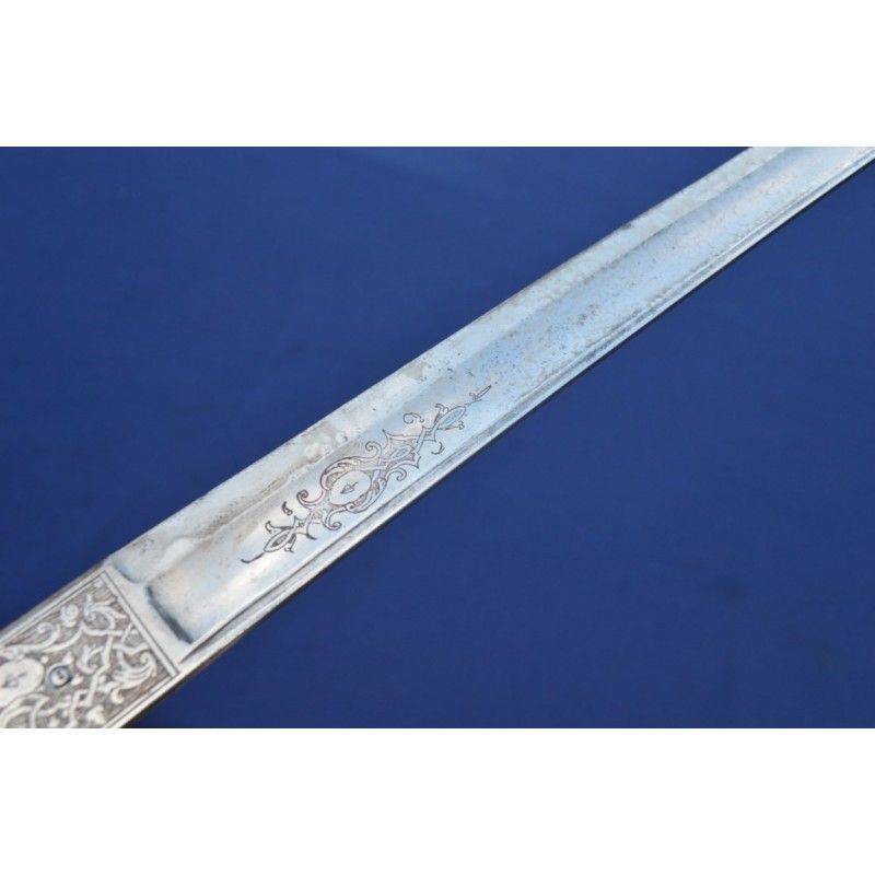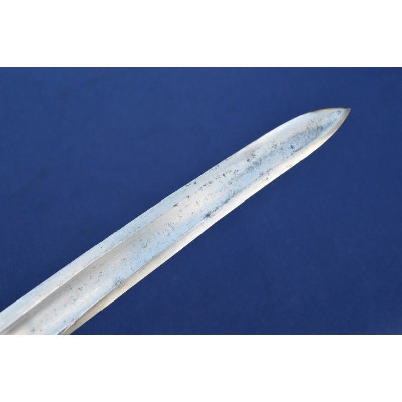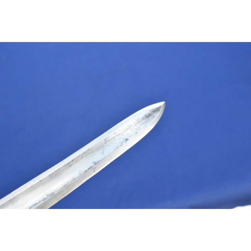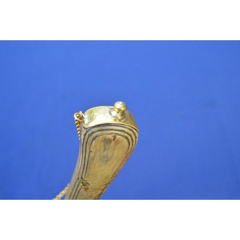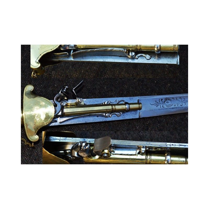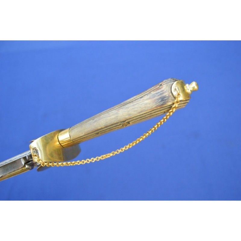 Rare dague de chasse française équipée d'un pistolet à silex. Mécanique complète et fonctionnelle avec toutes pièces d'origine en superbe état de conservation. Poignée en corne de Buffle à garniture laiton. Lame longue de 58cm, gravée au tiers et marquée de la devise Rien Ne m'Arrète au talon sous la garde, aucune oxydation. Objet de caractère qui mérite une bonne place dans une collection darmes blanches françaises du XVIIIè. Sans fourreau.