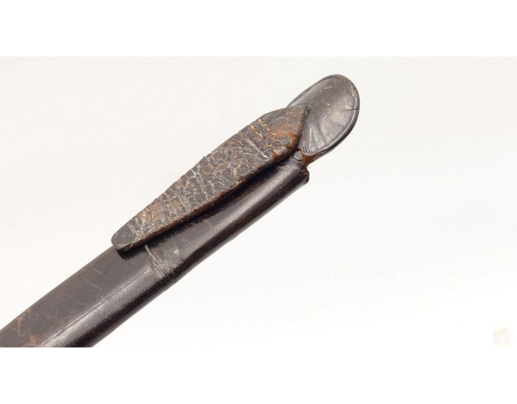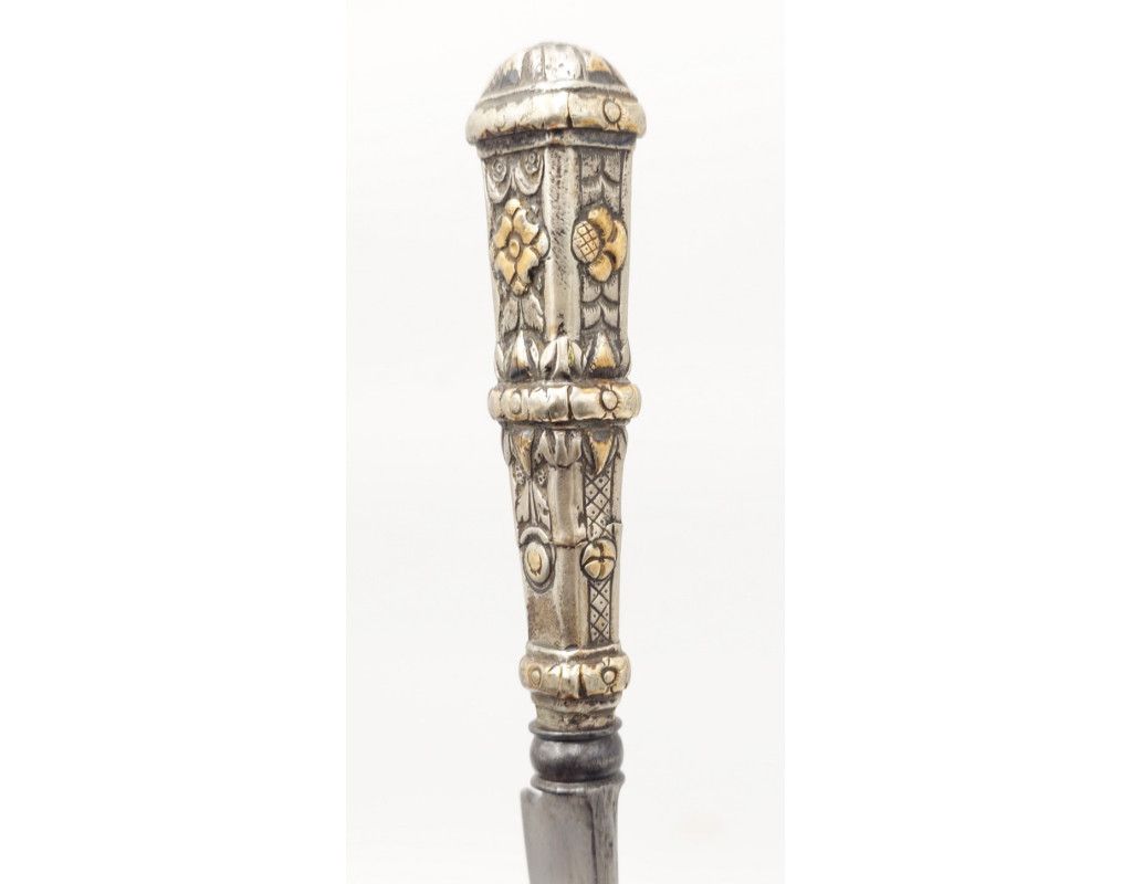 Couteau de Gauchos Argentin transformé en stylet avec fourreau cuir à passant de ceinture. Solide lame en acier forgé longue de 17.5cm. Lourde poignée en argent ciselée de fleurs dorées . Longueur totale 27.5cm. BE