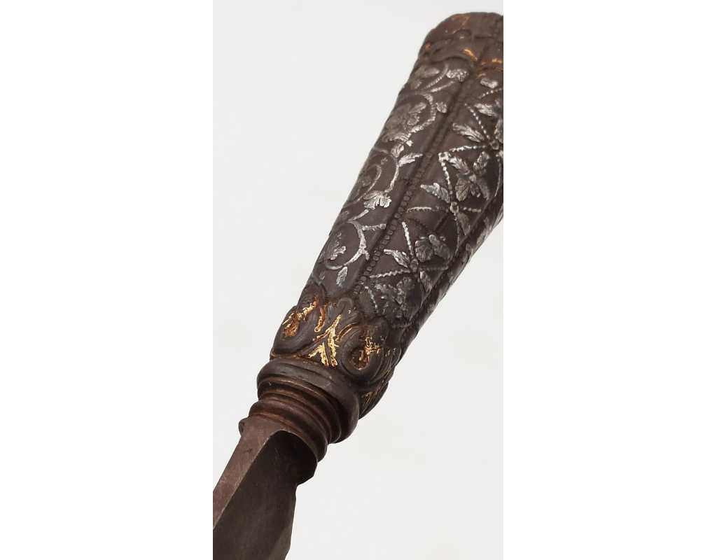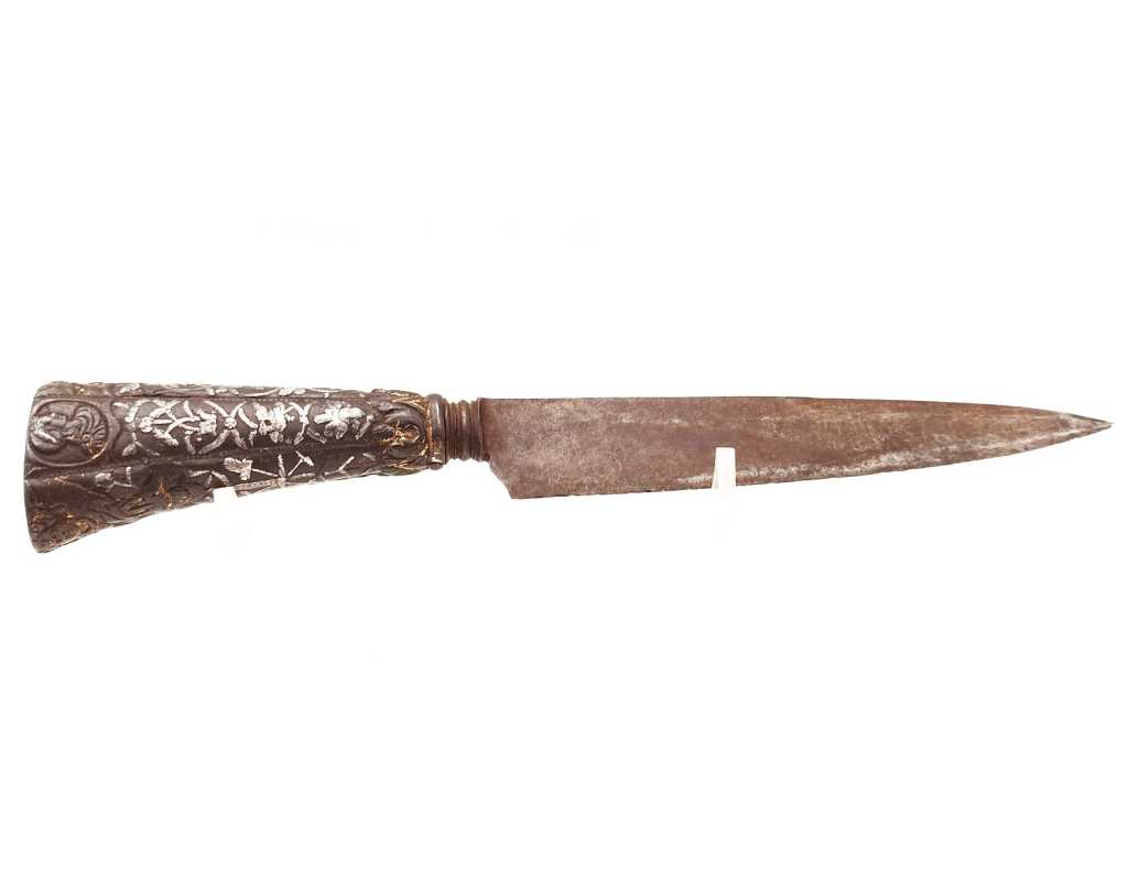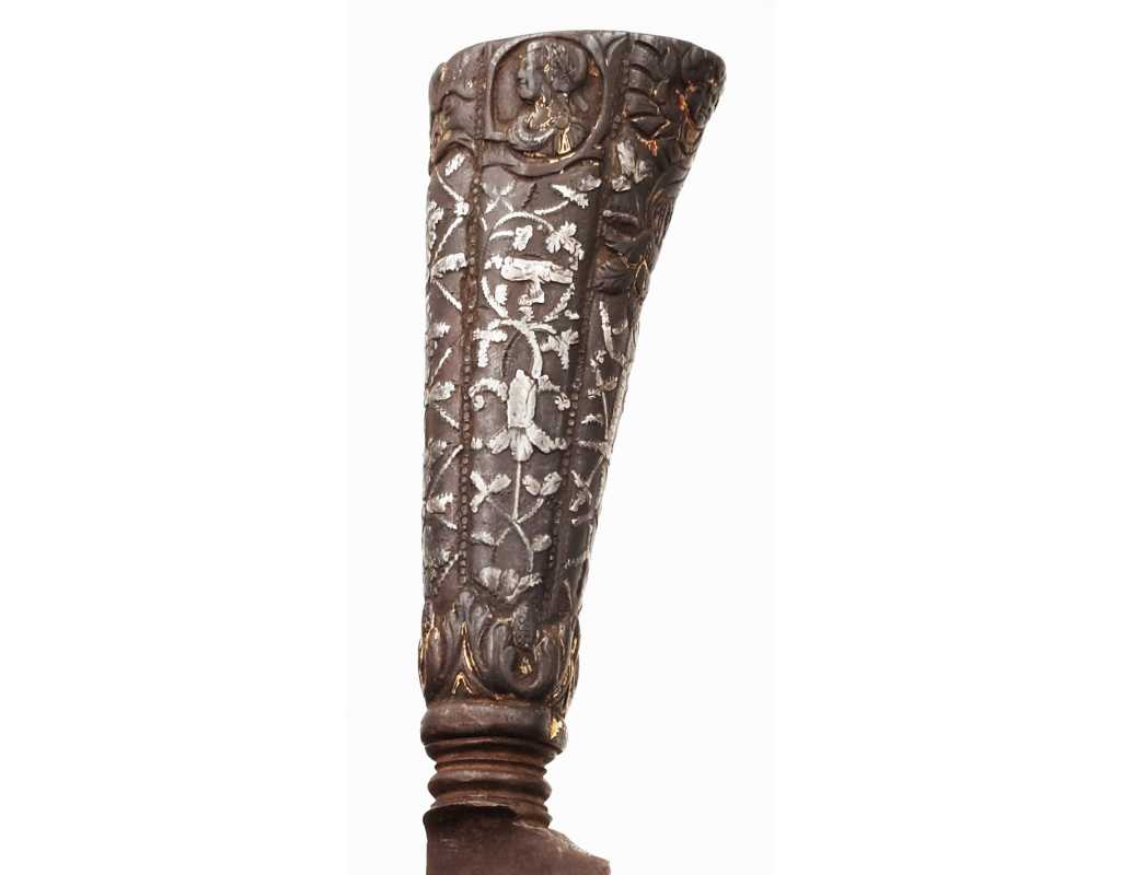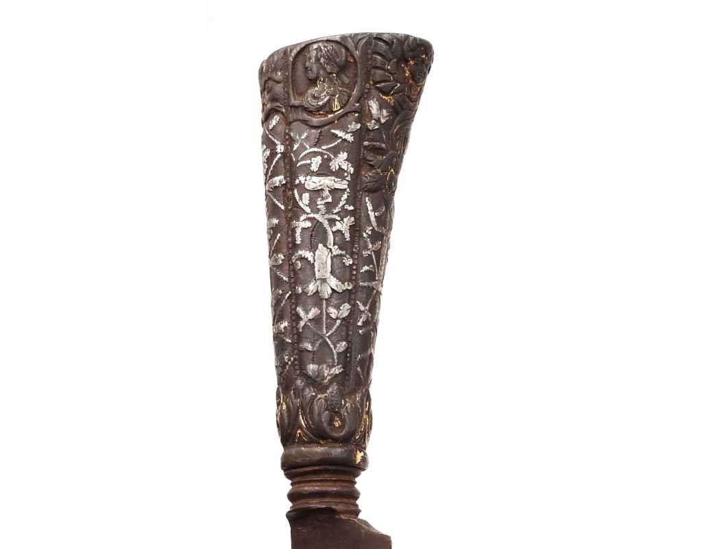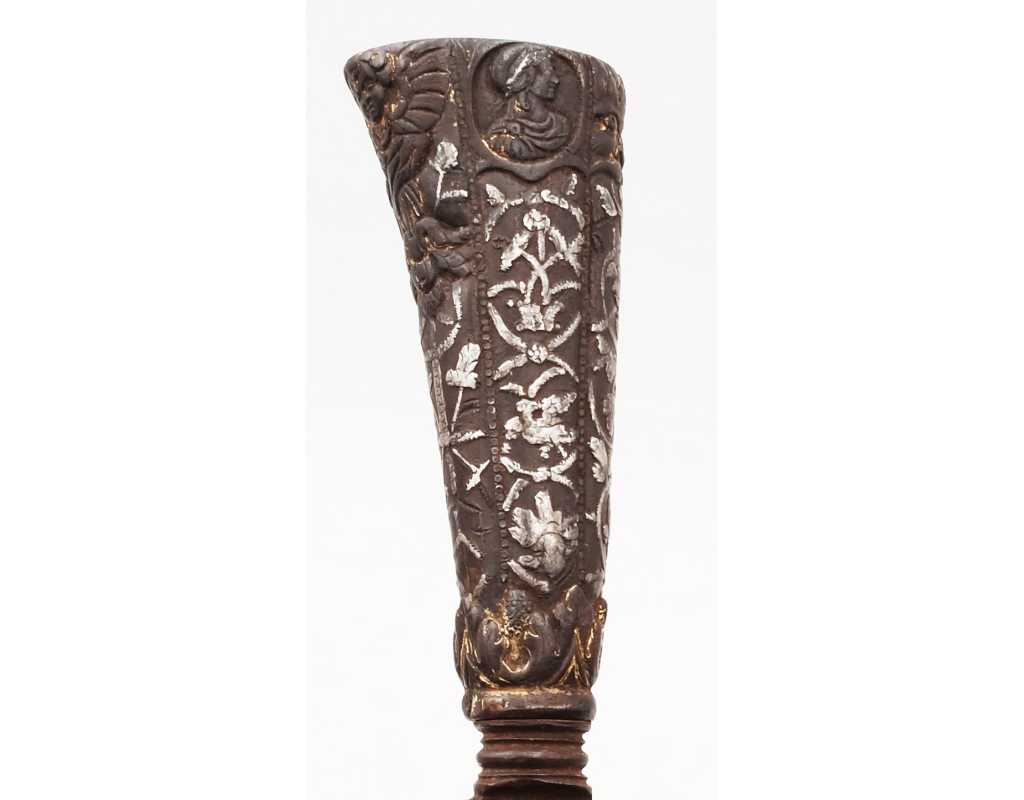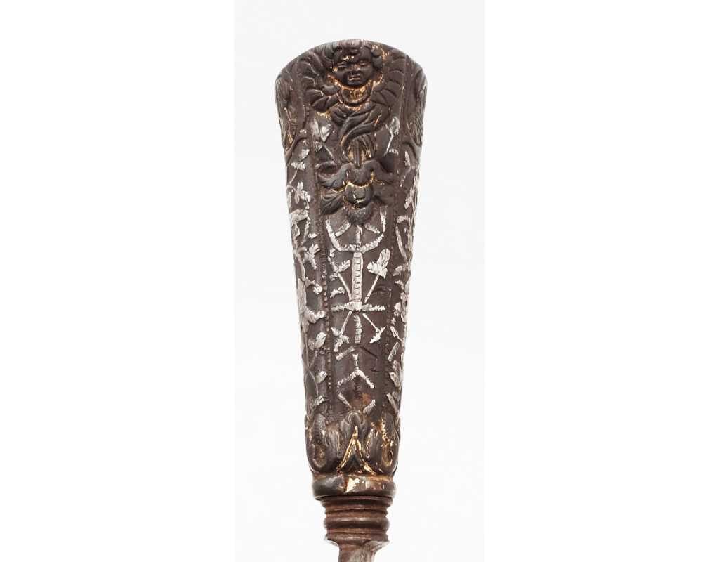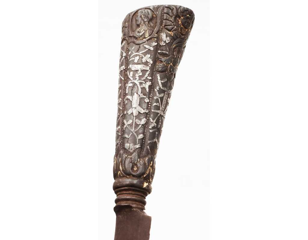 Très ancien couteau de type stylet à lame de type génoise, poignée en fer à décors ciselés en creux de rinceaux, palmettes, mufles de lion, d'un séraphin, d'un profil à l'antique et de cavaliers, incrustation d'argent, traces de dorure d'époque, belle patine. Longueur 27cm