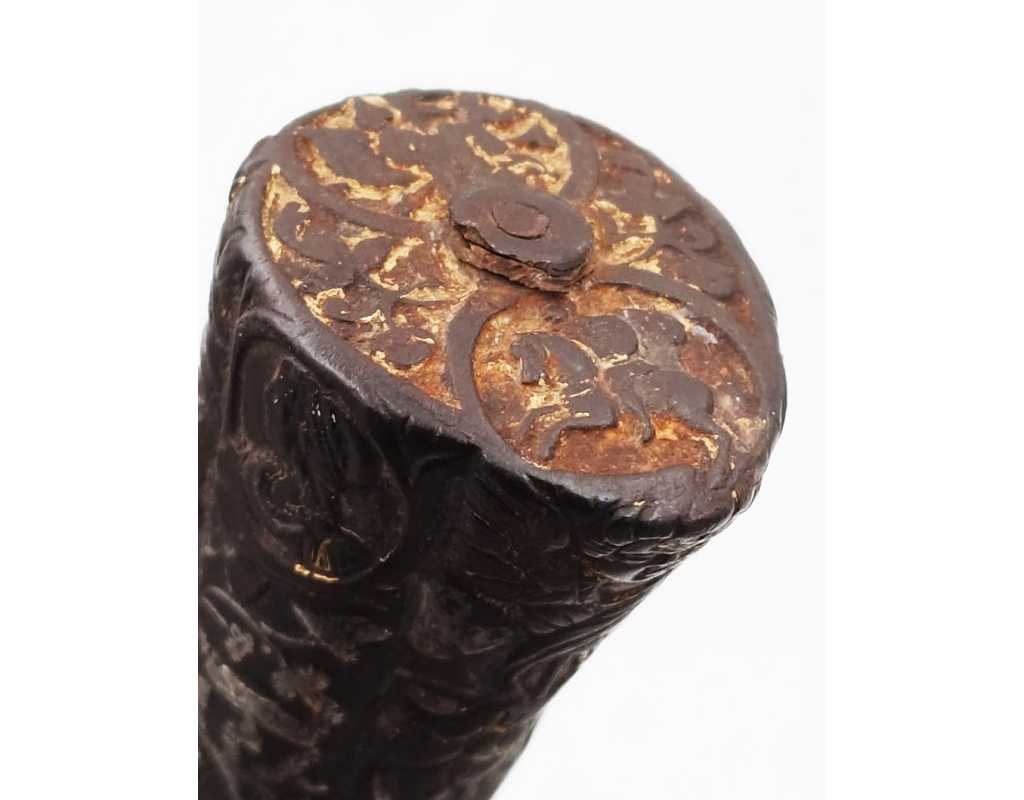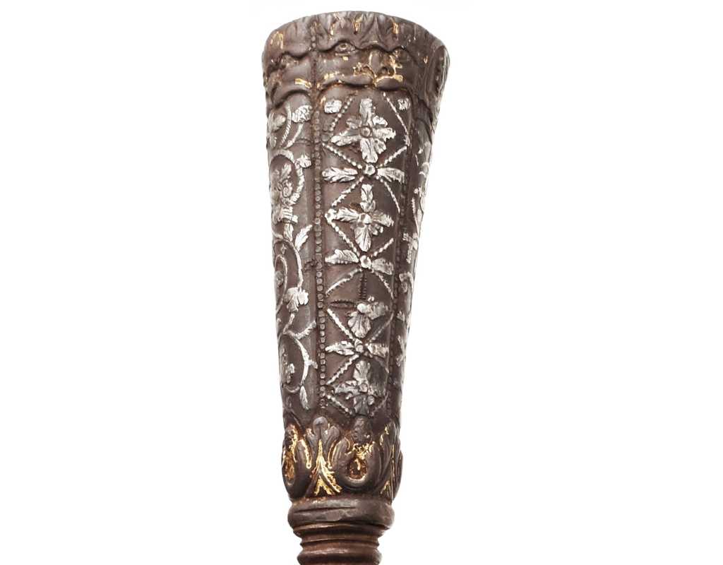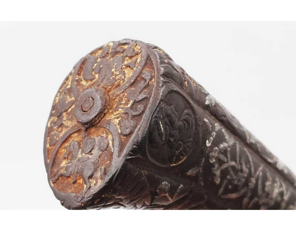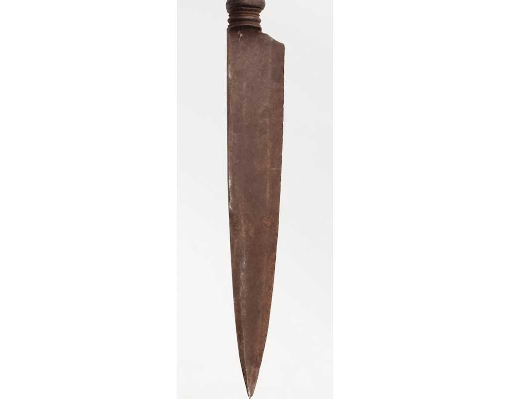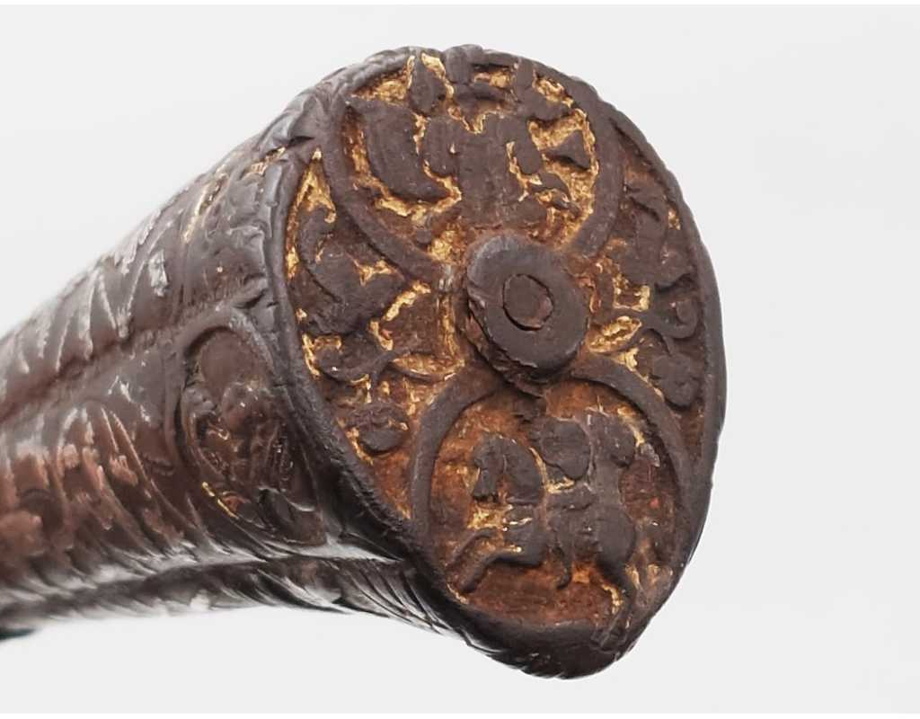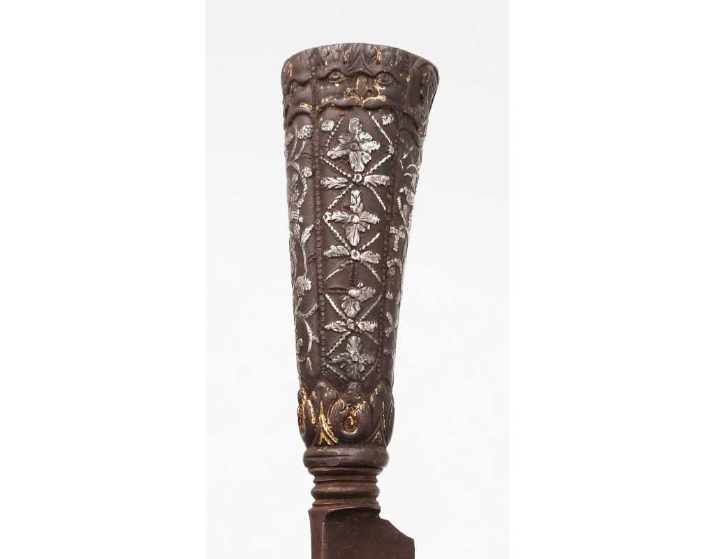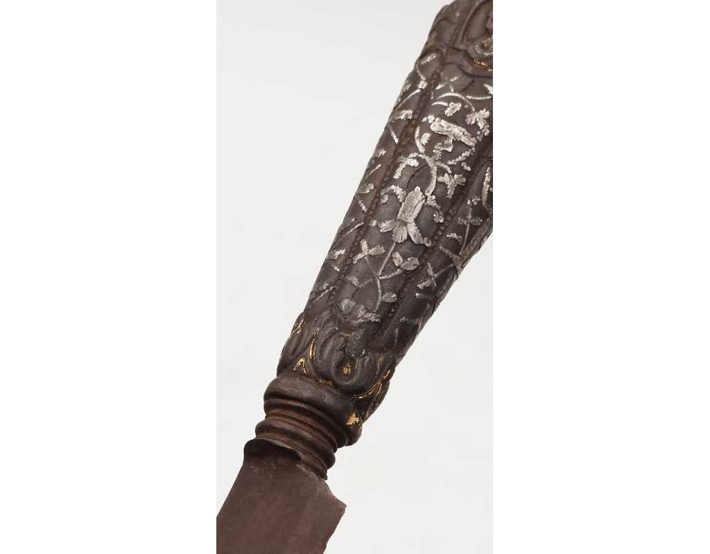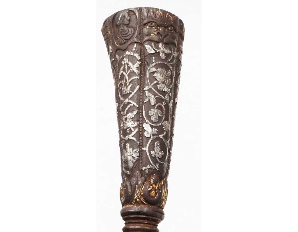 Très ancien couteau de type stylet à lame de type génoise, poignée en fer à décors ciselés en creux de rinceaux, palmettes, mufles de lion, d'un séraphin, d'un profil à l'antique et de cavaliers, incrustation d'argent, traces de dorure d'époque, belle patine. Longueur 27cm