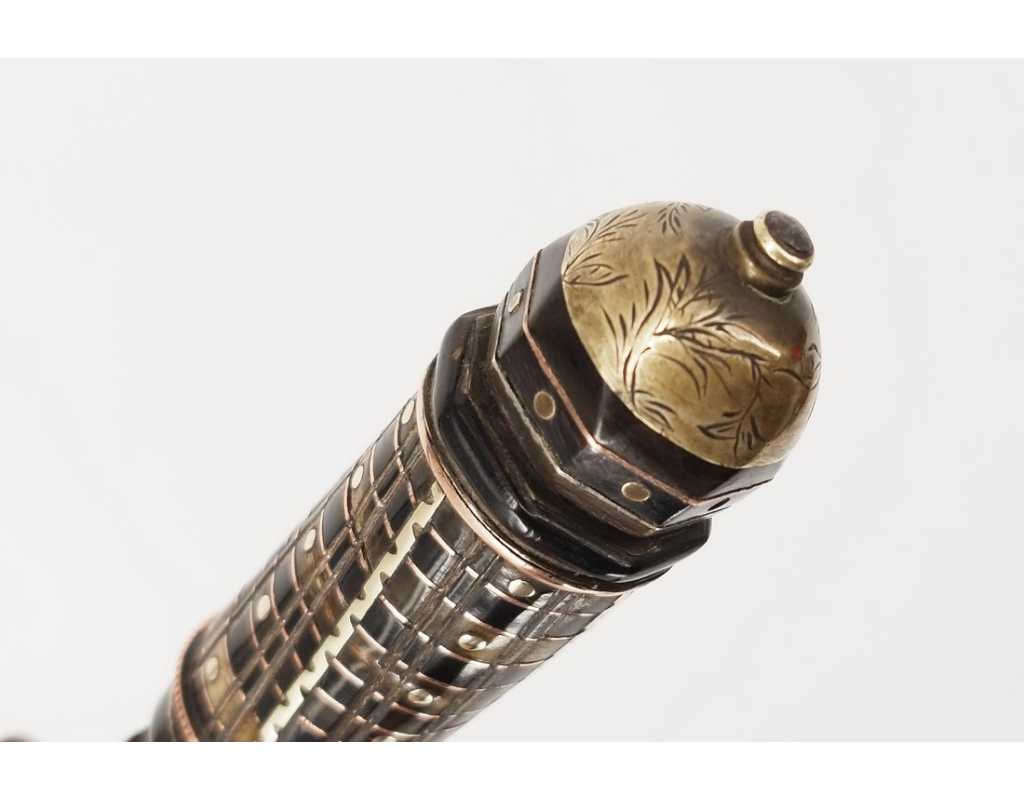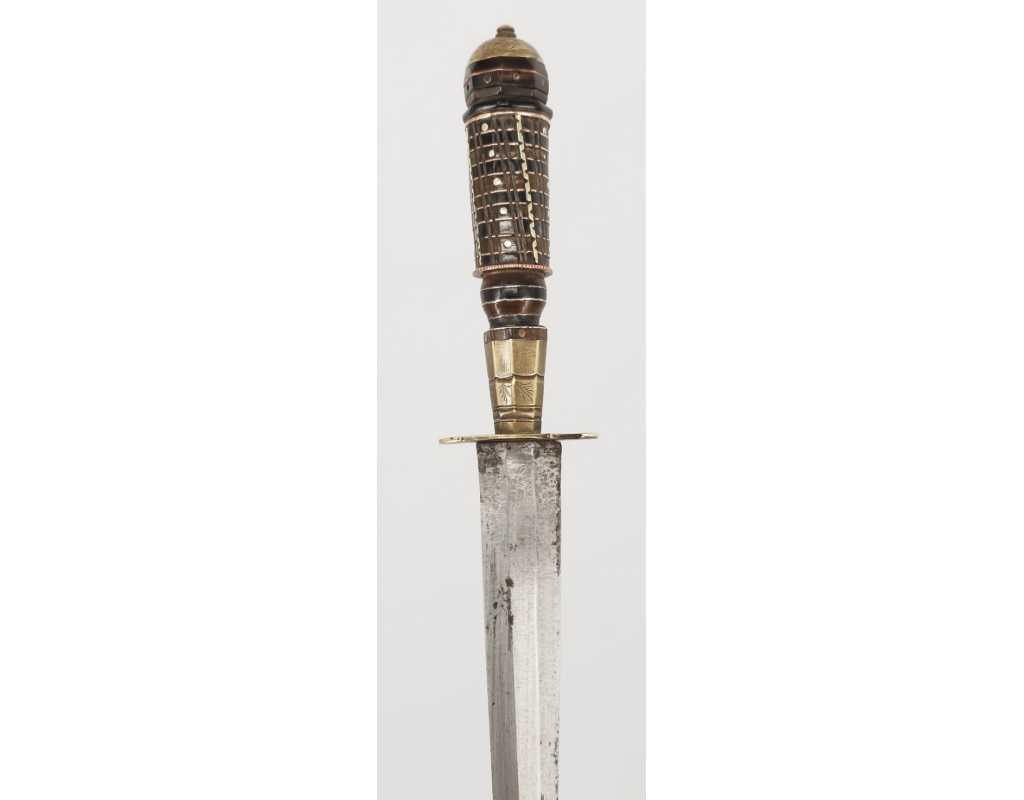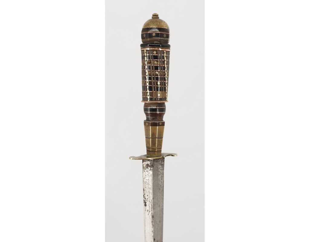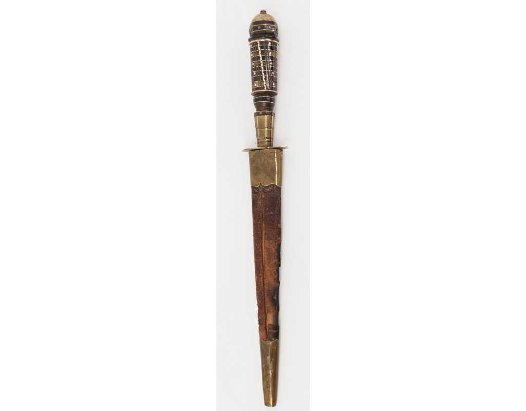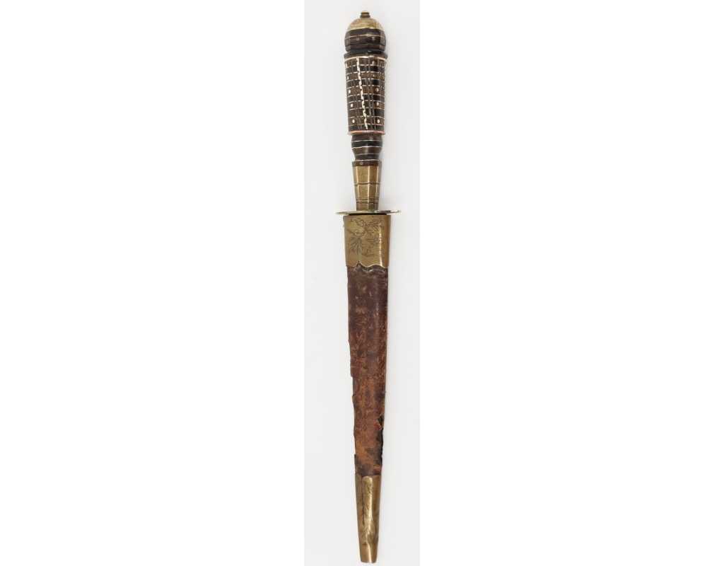 Beau stylet de la Castagniccia. Fusée à empilement de rondelles de corne noire et dix de brune de corne brune, bagues de cuivre et d'étain, clous et fil torsadé formant balustre de laiton, mitre bombée et gravée de feuillages à bouton de rivure, virole à facettes portant de fine gravures de végétaux, fine garde en laiton ouvragée. Fourreau bois recouvert de cuir brun rougeâtre à deux garniture de laiton, chape sans anneau, bouterolle décorée en suite dont manque le fond ou le dard. Lame à double tranchant damassée à l'acide et méplat médian longue de 14cm large de2,4cm.
