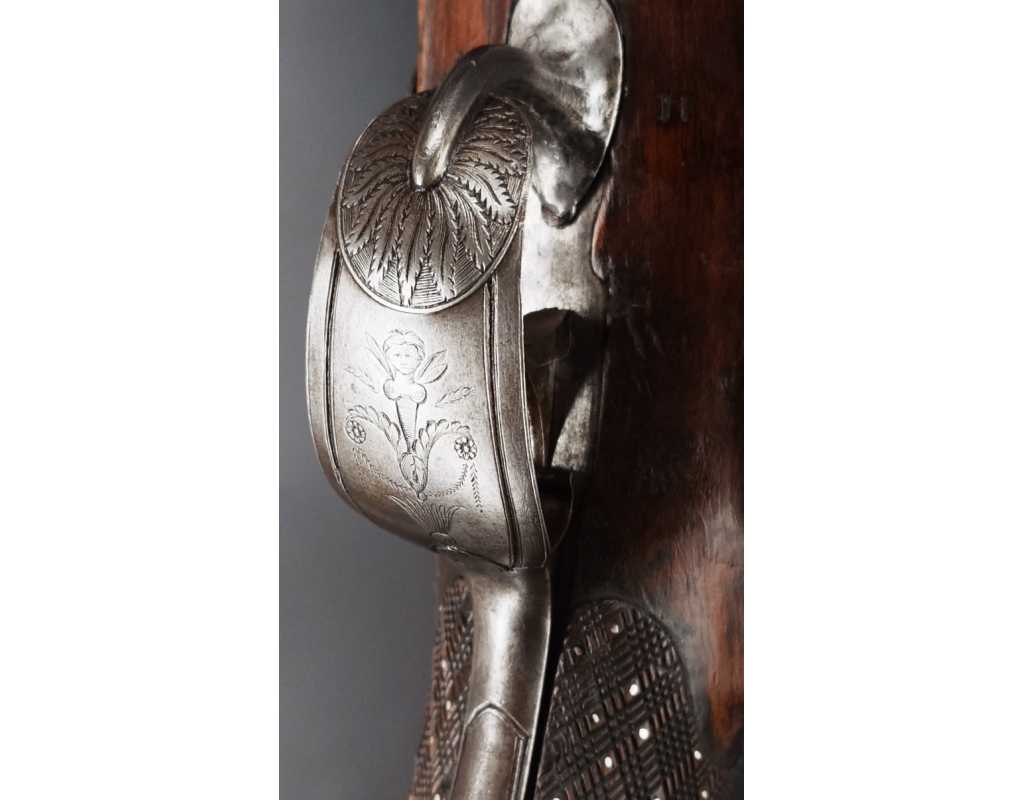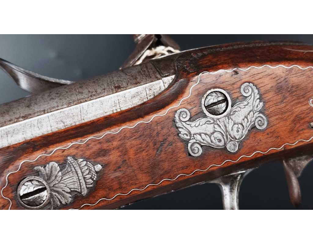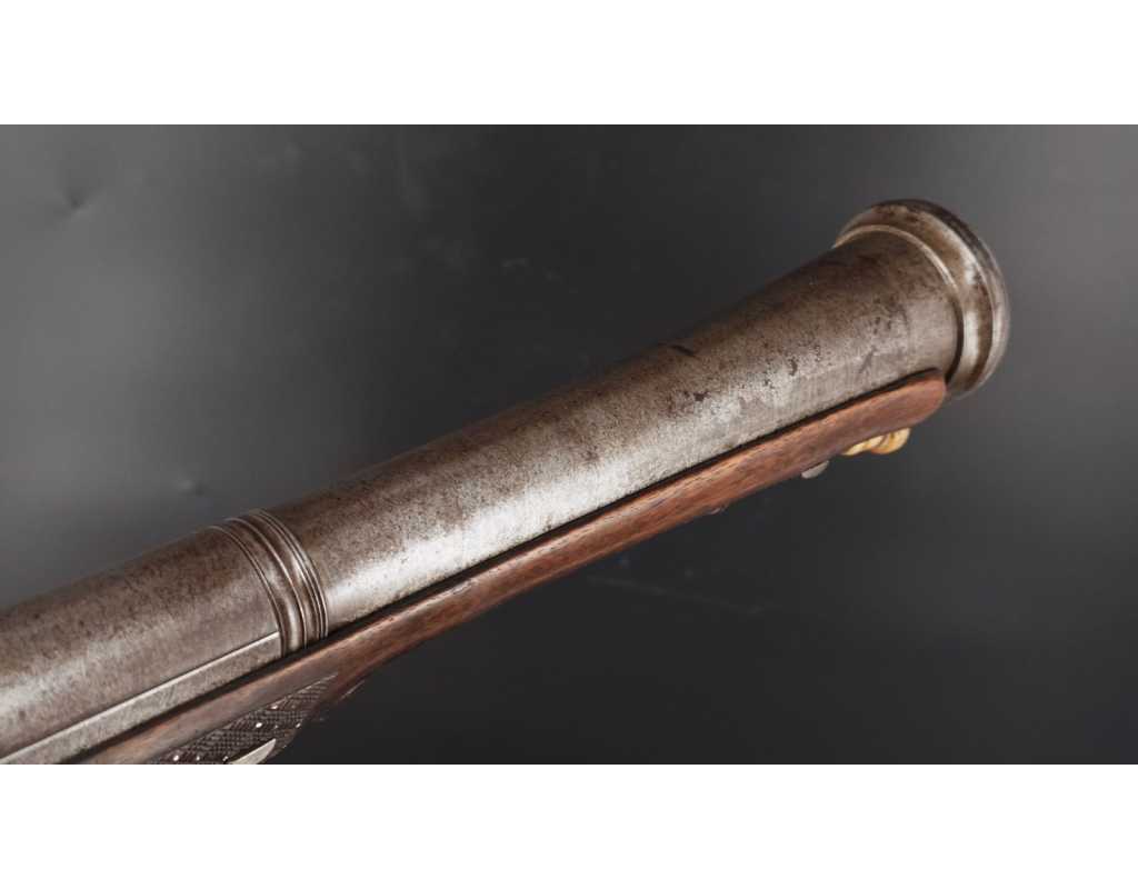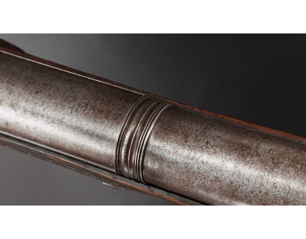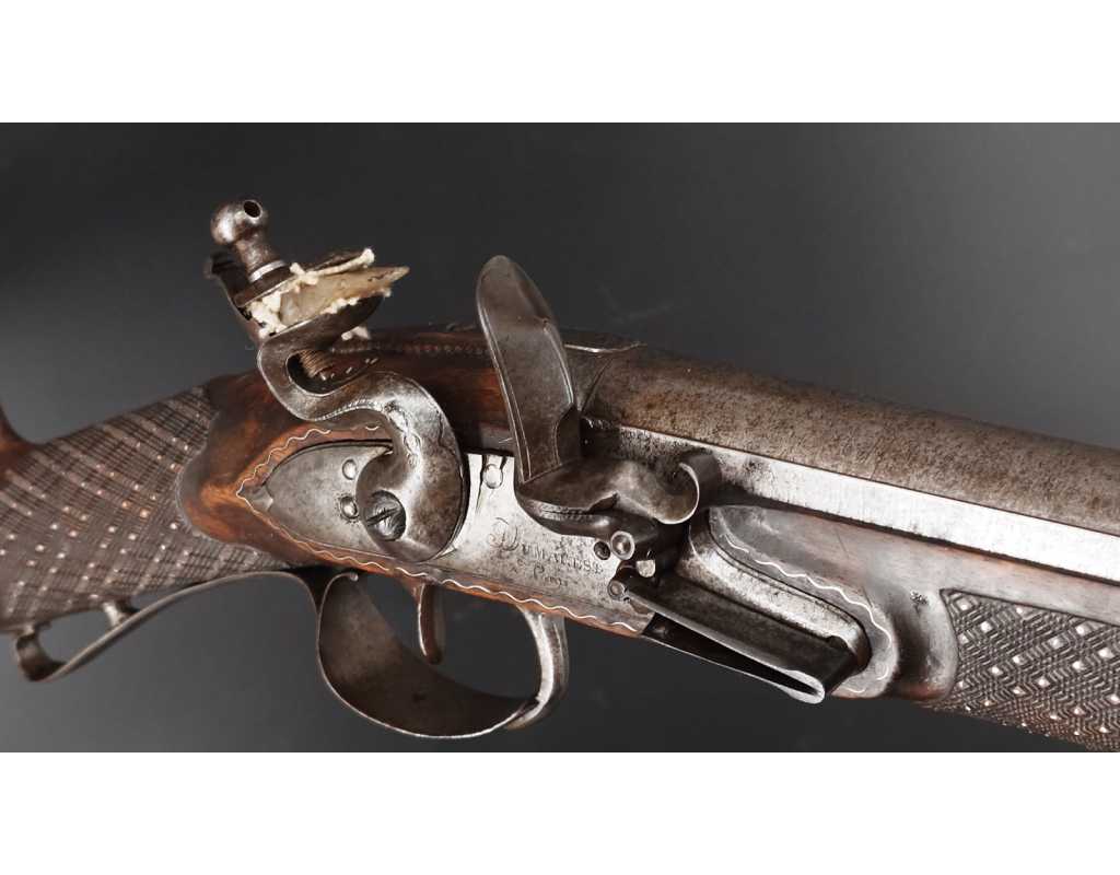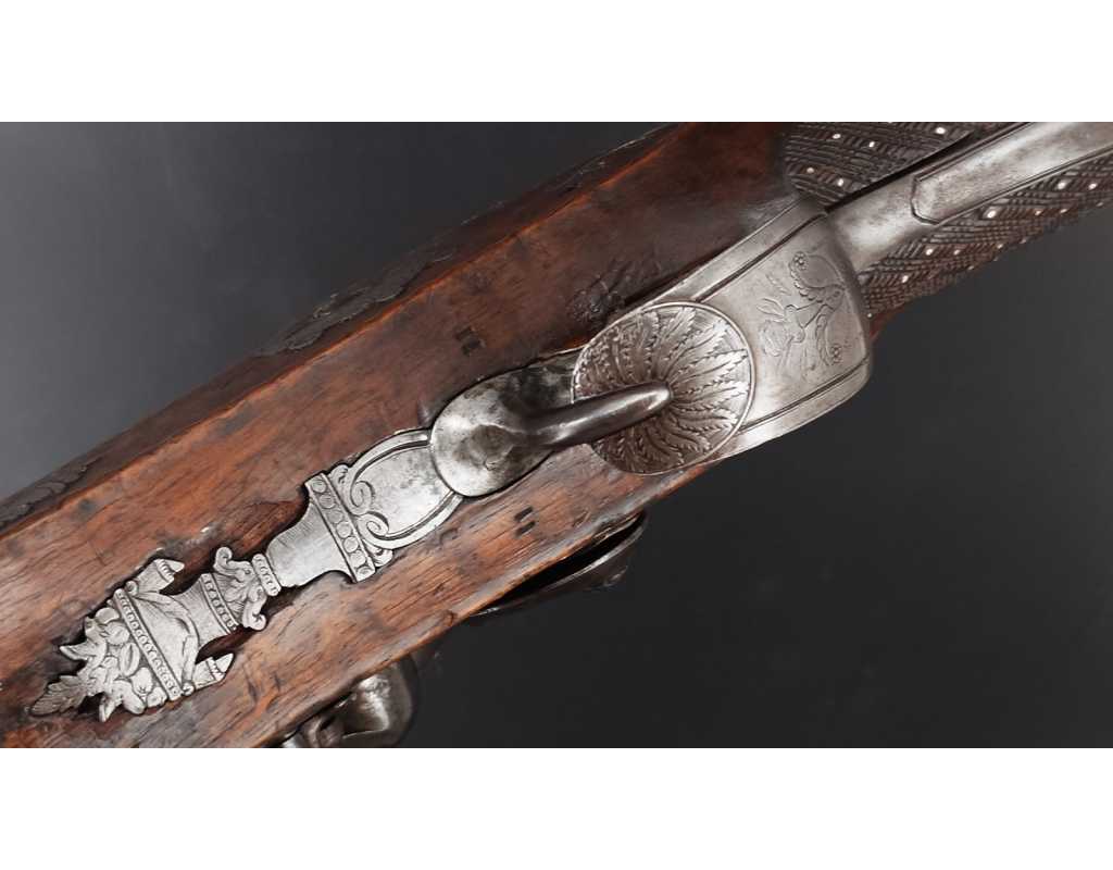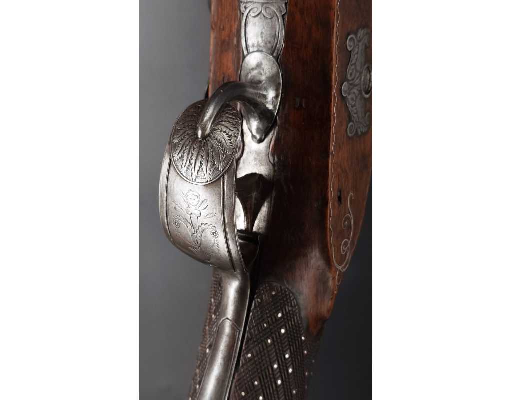 Très beau tromblon de marine à silex signé par Dumarest à Paris actif de 1749 à 1812, superbe état de conservation dans sa patine intouchée. Canon à pans puis rond de 34cm en damas à renfort médian, bouche à fort bourrelet très évasé de 5cm, platine en fer à mécanisme parfaitement fonctionnel entièrement d'origine, manque serre pierre que nous pouvons fournir, gravure de contour au traits et frises sur les angles, queue de culasse, plaque de couche, contre platine, pontet et canal de baguette en fer finement gravés, belle patine sans usure ni oxydation. Belle crosse en noyer sculptée, poignée et garde main à quadrillages losange en relief incrustés de clous d'argent, repose joue à rosaces décorative, incrustation de fil d'argent autour de la platine, la contre platine, queue de culasse à bord perlés et de la plaque de couche, petit manque sans gravité à l'avant du pontet. Baguette d'origine en fanon de baleine et embout corne.