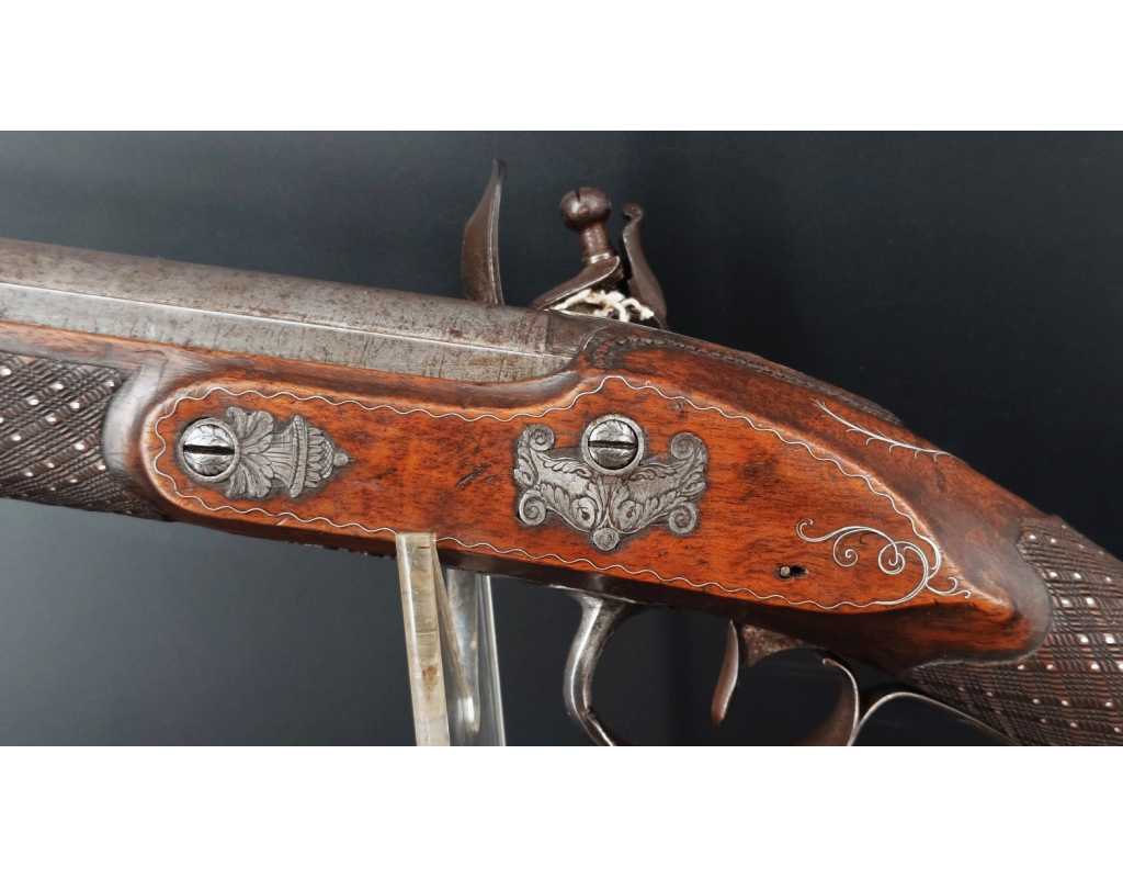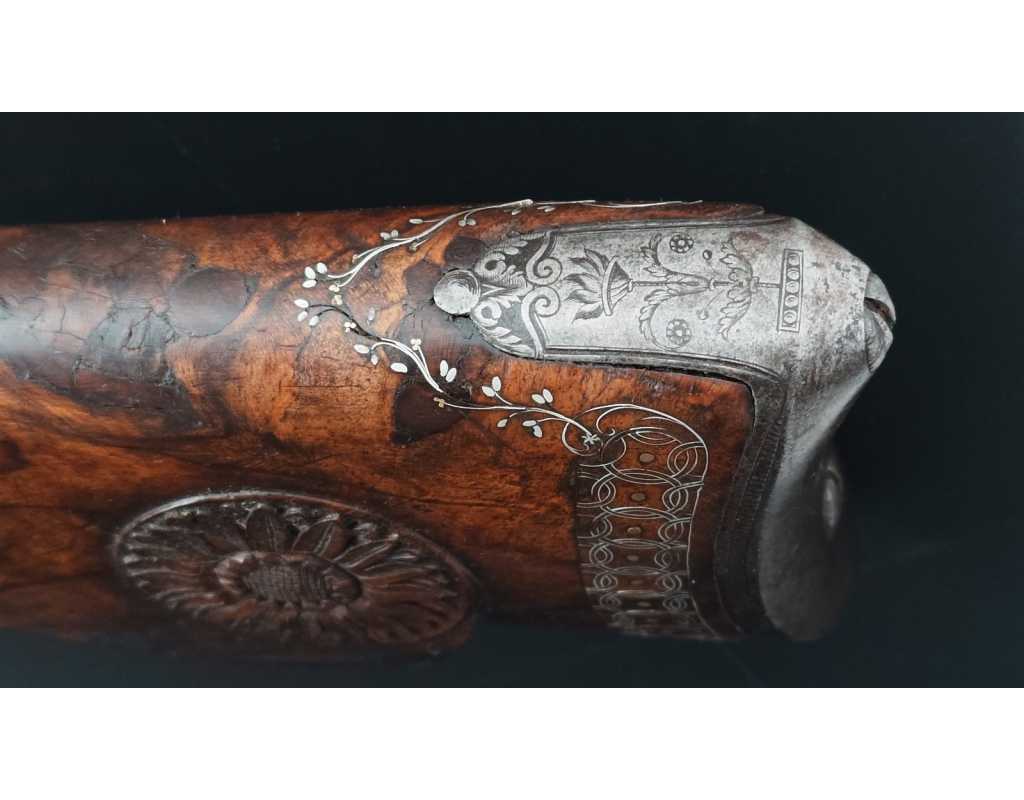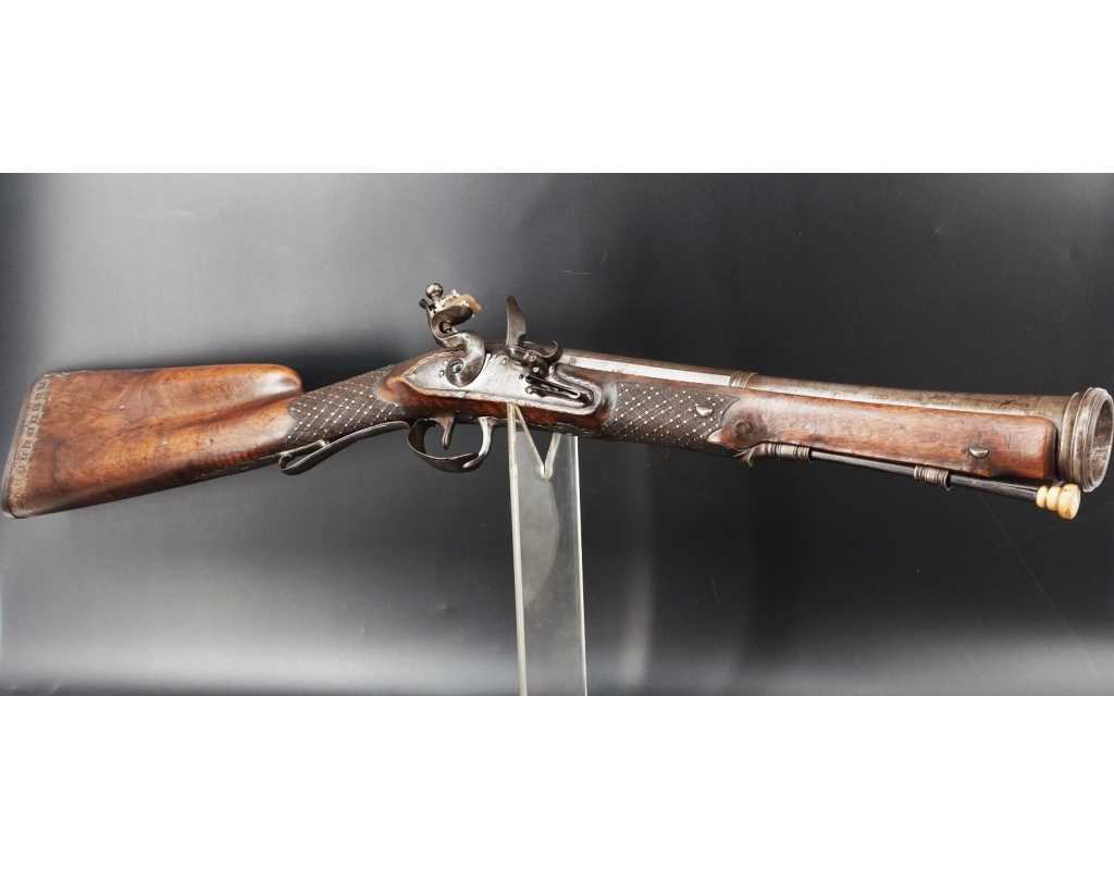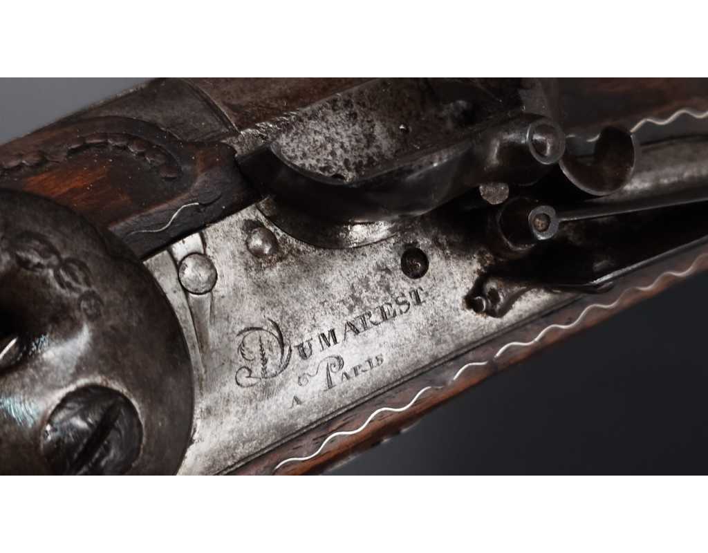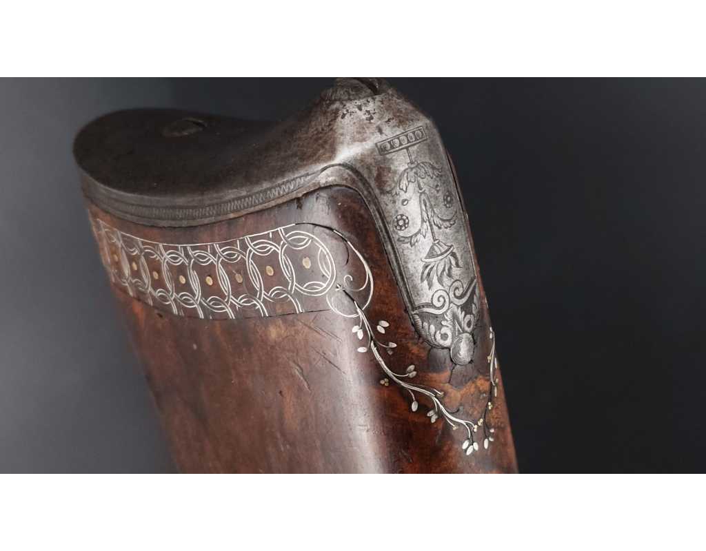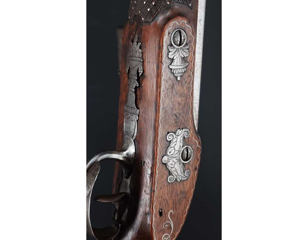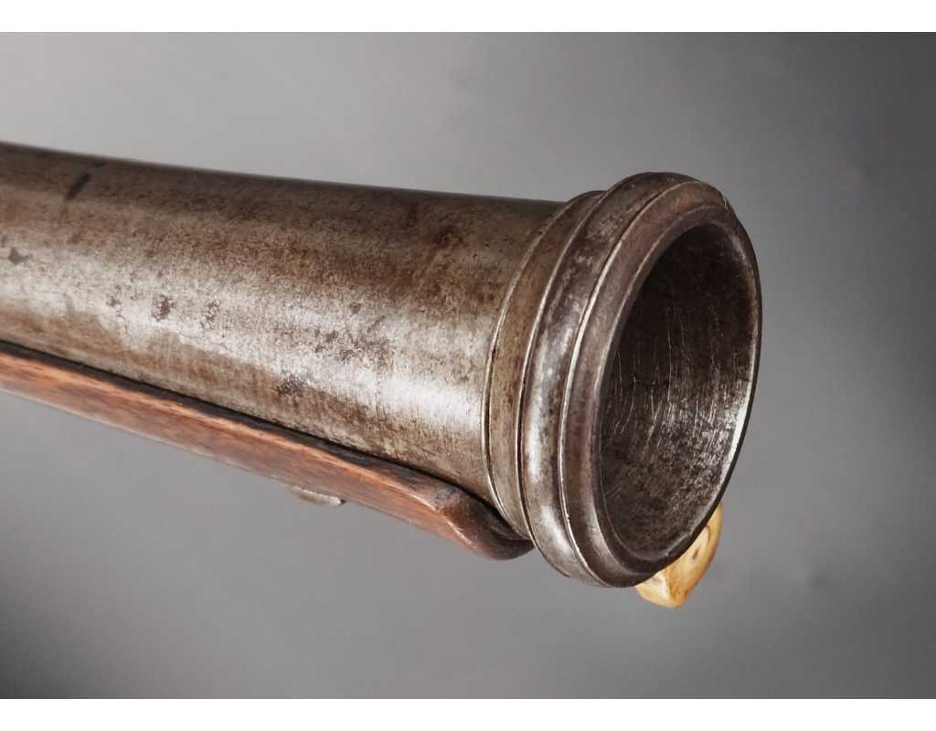 Très beau tromblon de marine à silex signé par Dumarest à Paris actif de 1749 à 1812, superbe état de conservation dans sa patine intouchée. Canon à pans puis rond de 34cm en damas à renfort médian, bouche à fort bourrelet très évasé de 5cm, platine en fer à mécanisme parfaitement fonctionnel entièrement d'origine, manque serre pierre que nous pouvons fournir, gravure de contour au traits et frises sur les angles, queue de culasse, plaque de couche, contre platine, pontet et canal de baguette en fer finement gravés, belle patine sans usure ni oxydation. Belle crosse en noyer sculptée, poignée et garde main à quadrillages losange en relief incrustés de clous d'argent, repose joue à rosaces décorative, incrustation de fil d'argent autour de la platine, la contre platine, queue de culasse à bord perlés et de la plaque de couche, petit manque sans gravité à l'avant du pontet. Baguette d'origine en fanon de baleine et embout corne.