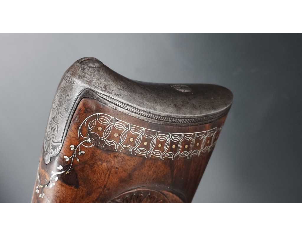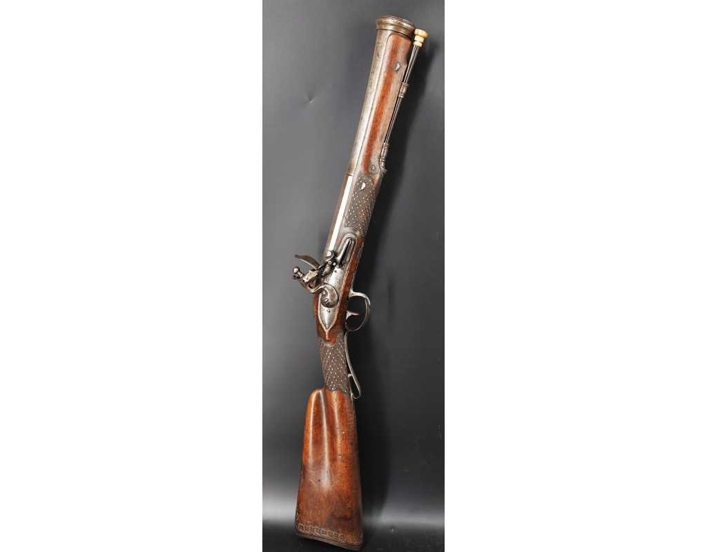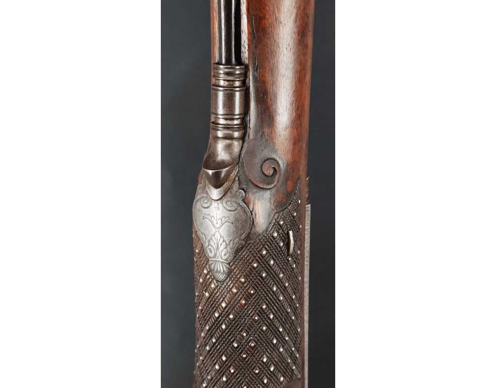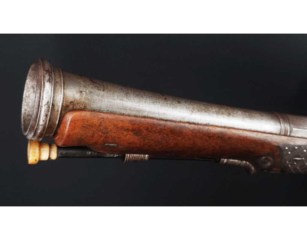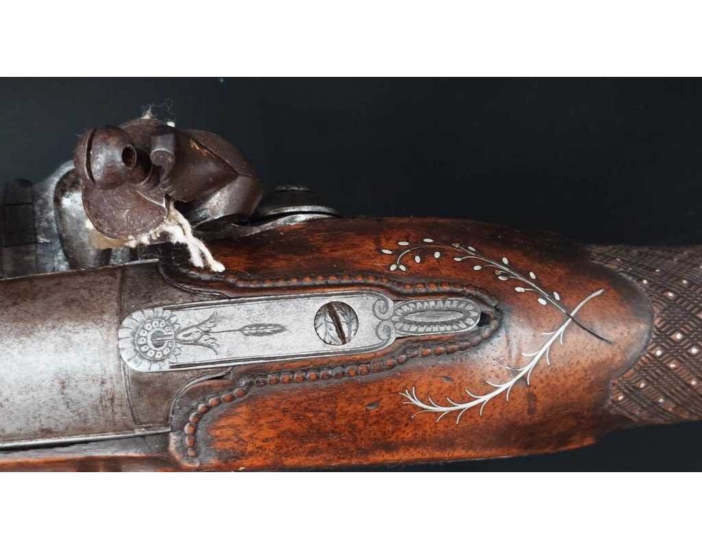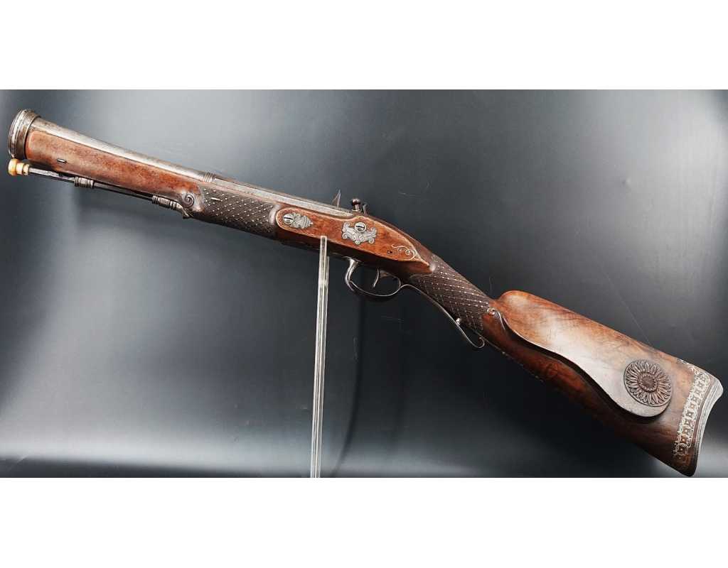 Très beau tromblon de marine à silex signé par Dumarest à Paris actif de 1749 à 1812, superbe état de conservation dans sa patine intouchée. Canon à pans puis rond de 34cm en damas à renfort médian, bouche à fort bourrelet très évasé de 5cm, platine en fer à mécanisme parfaitement fonctionnel entièrement d'origine, manque serre pierre que nous pouvons fournir, gravure de contour au traits et frises sur les angles, queue de culasse, plaque de couche, contre platine, pontet et canal de baguette en fer finement gravés, belle patine sans usure ni oxydation. Belle crosse en noyer sculptée, poignée et garde main à quadrillages losange en relief incrustés de clous d'argent, repose joue à rosaces décorative, incrustation de fil d'argent autour de la platine, la contre platine, queue de culasse à bord perlés et de la plaque de couche, petit manque sans gravité à l'avant du pontet. Baguette d'origine en fanon de baleine et embout corne.