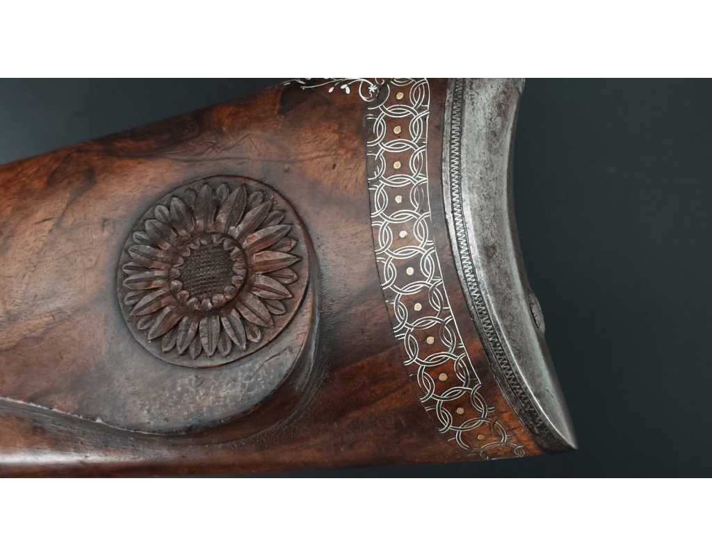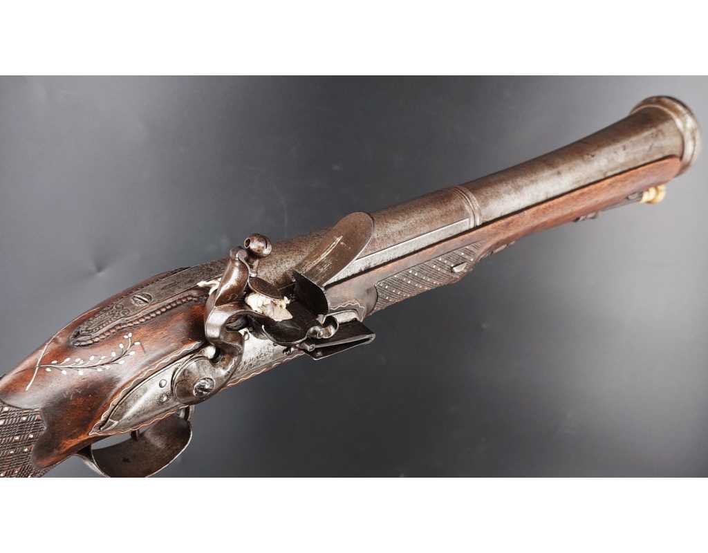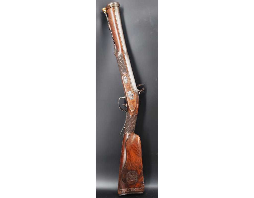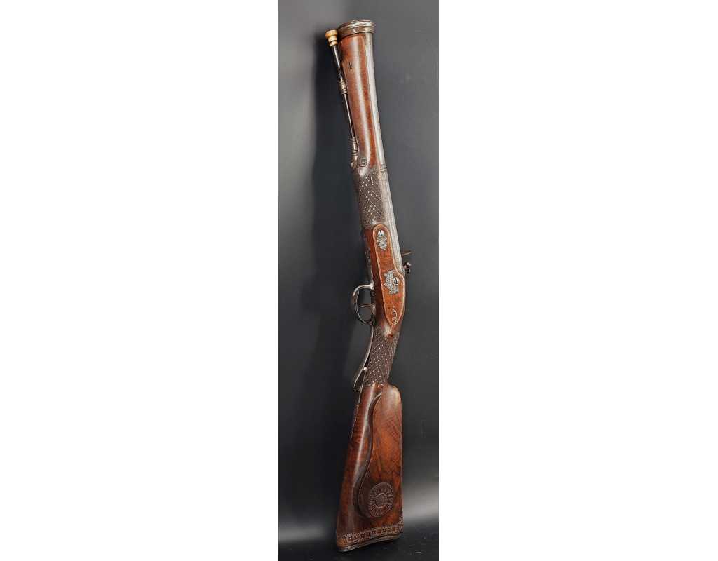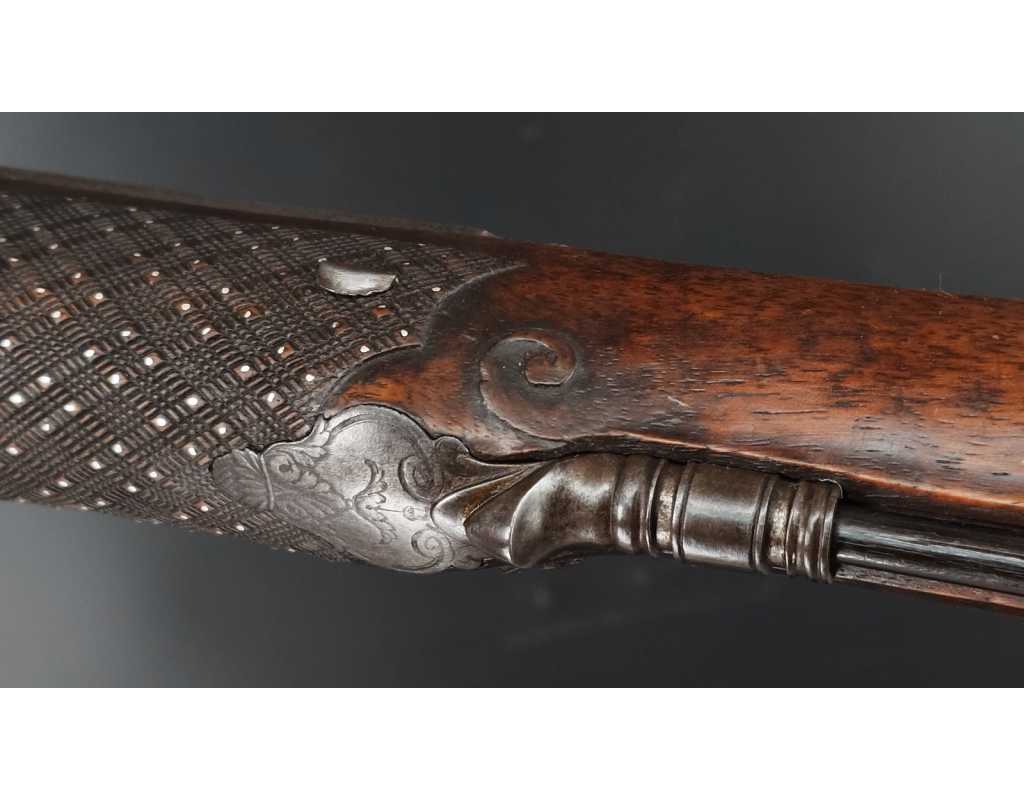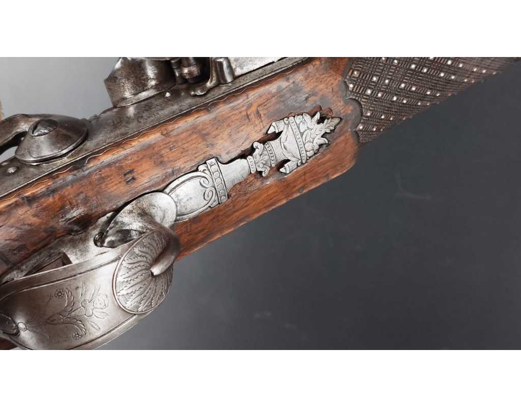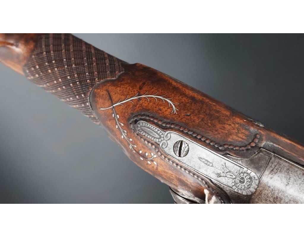 Très beau tromblon de marine à silex signé par Dumarest à Paris actif de 1749 à 1812, superbe état de conservation dans sa patine intouchée. Canon à pans puis rond de 34cm en damas à renfort médian, bouche à fort bourrelet très évasé de 5cm, platine en fer à mécanisme parfaitement fonctionnel entièrement d'origine, manque serre pierre que nous pouvons fournir, gravure de contour au traits et frises sur les angles, queue de culasse, plaque de couche, contre platine, pontet et canal de baguette en fer finement gravés, belle patine sans usure ni oxydation. Belle crosse en noyer sculptée, poignée et garde main à quadrillages losange en relief incrustés de clous d'argent, repose joue à rosaces décorative, incrustation de fil d'argent autour de la platine, la contre platine, queue de culasse à bord perlés et de la plaque de couche, petit manque sans gravité à l'avant du pontet. Baguette d'origine en fanon de baleine et embout corne.