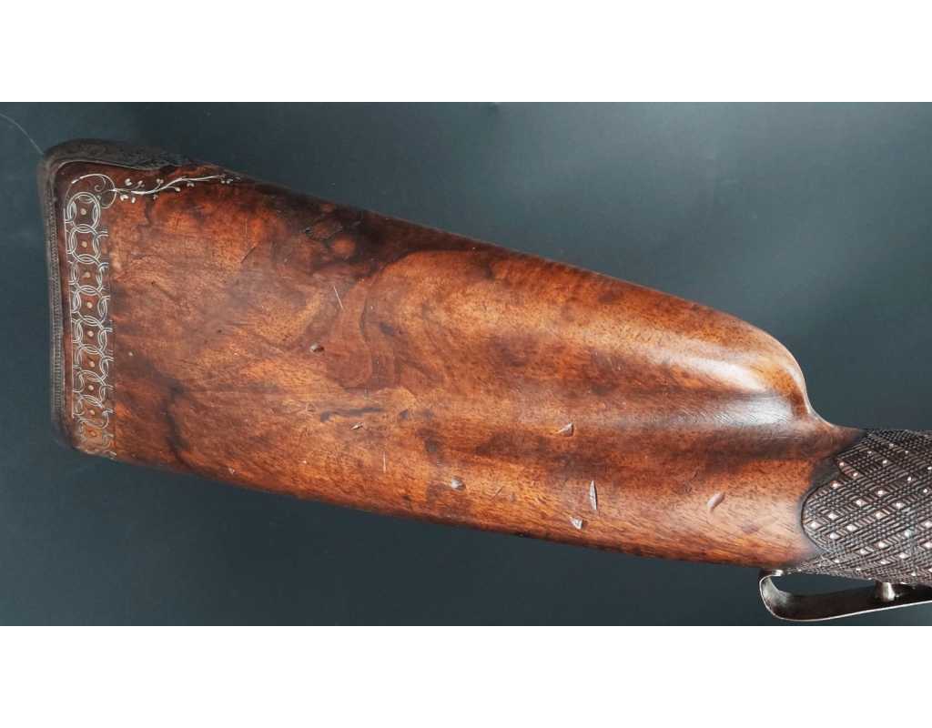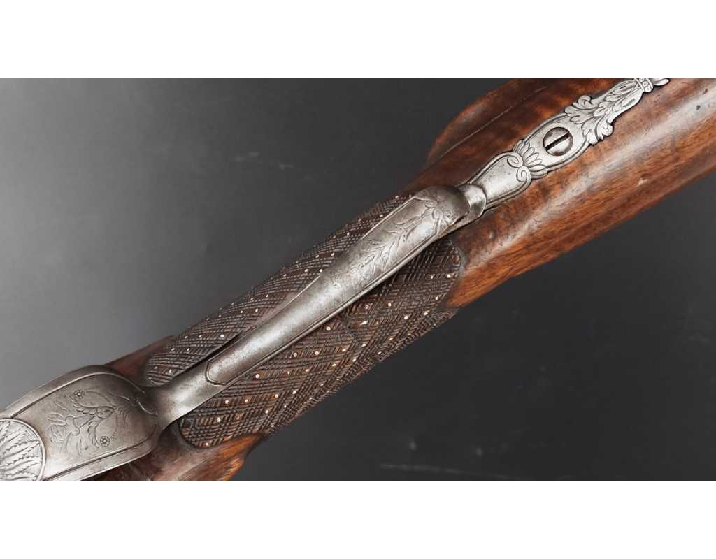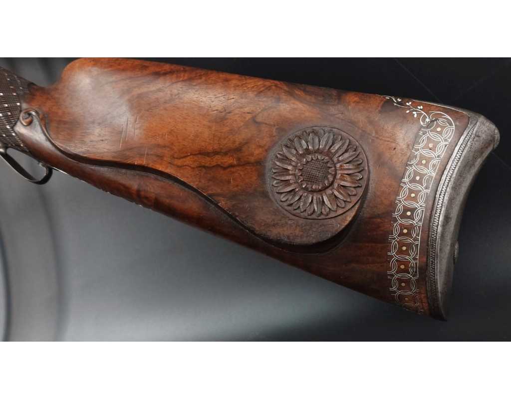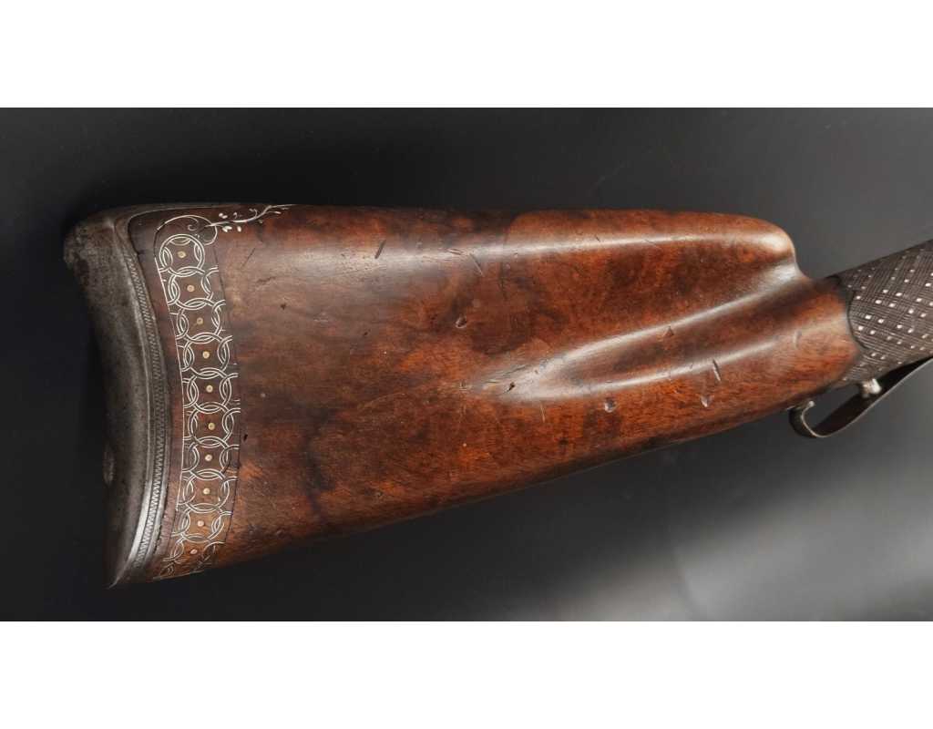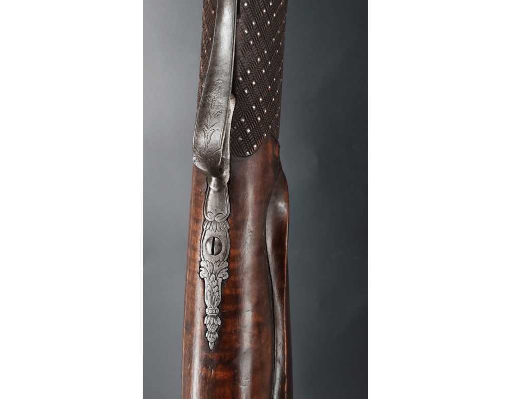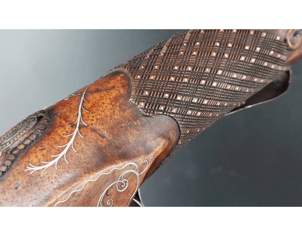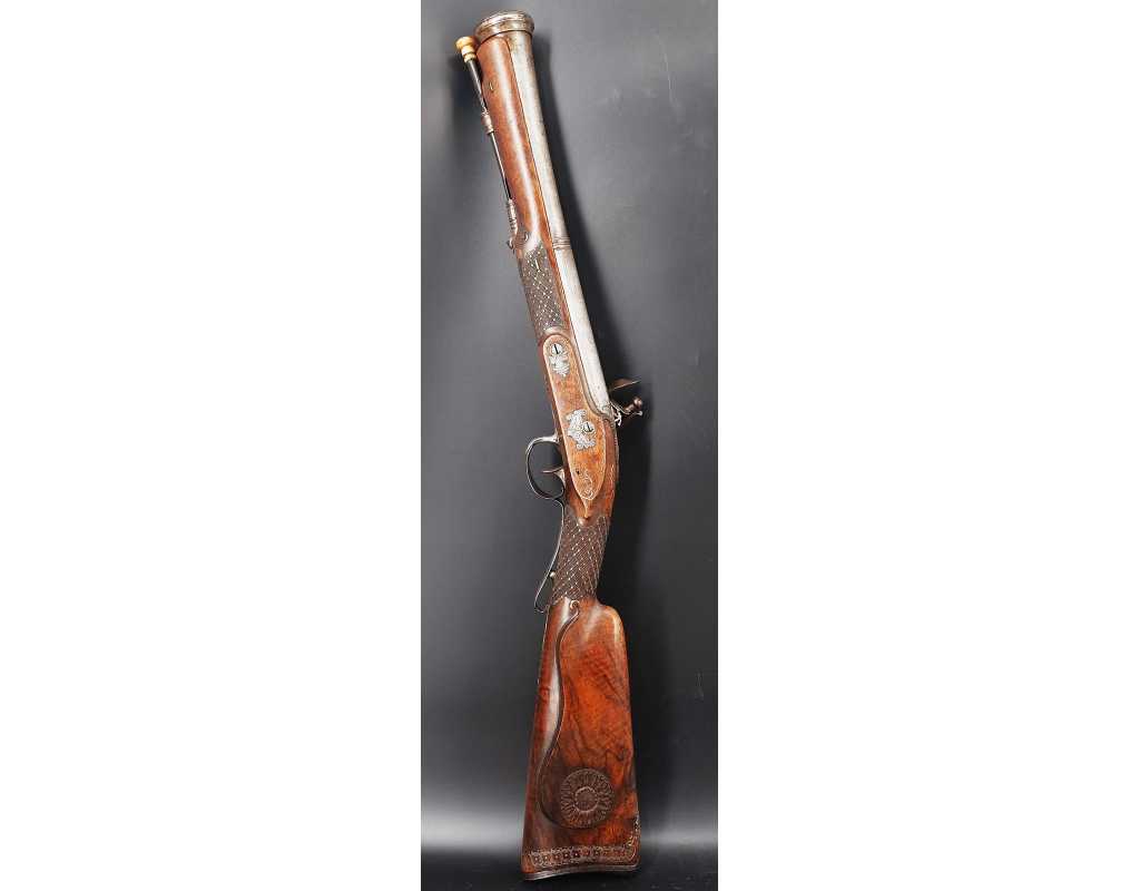 Très beau tromblon de marine à silex signé par Dumarest à Paris actif de 1749 à 1812, superbe état de conservation dans sa patine intouchée. Canon à pans puis rond de 34cm en damas à renfort médian, bouche à fort bourrelet très évasé de 5cm, platine en fer à mécanisme parfaitement fonctionnel entièrement d'origine, manque serre pierre que nous pouvons fournir, gravure de contour au traits et frises sur les angles, queue de culasse, plaque de couche, contre platine, pontet et canal de baguette en fer finement gravés, belle patine sans usure ni oxydation. Belle crosse en noyer sculptée, poignée et garde main à quadrillages losange en relief incrustés de clous d'argent, repose joue à rosaces décorative, incrustation de fil d'argent autour de la platine, la contre platine, queue de culasse à bord perlés et de la plaque de couche, petit manque sans gravité à l'avant du pontet. Baguette d'origine en fanon de baleine et embout corne.