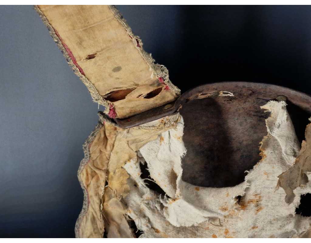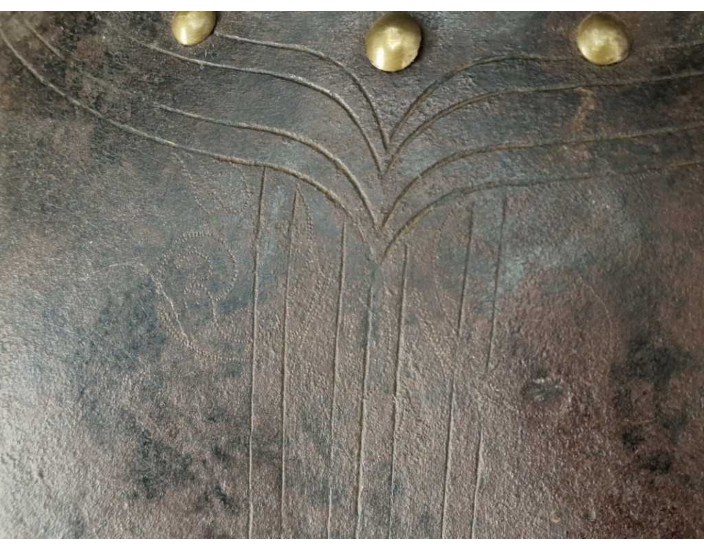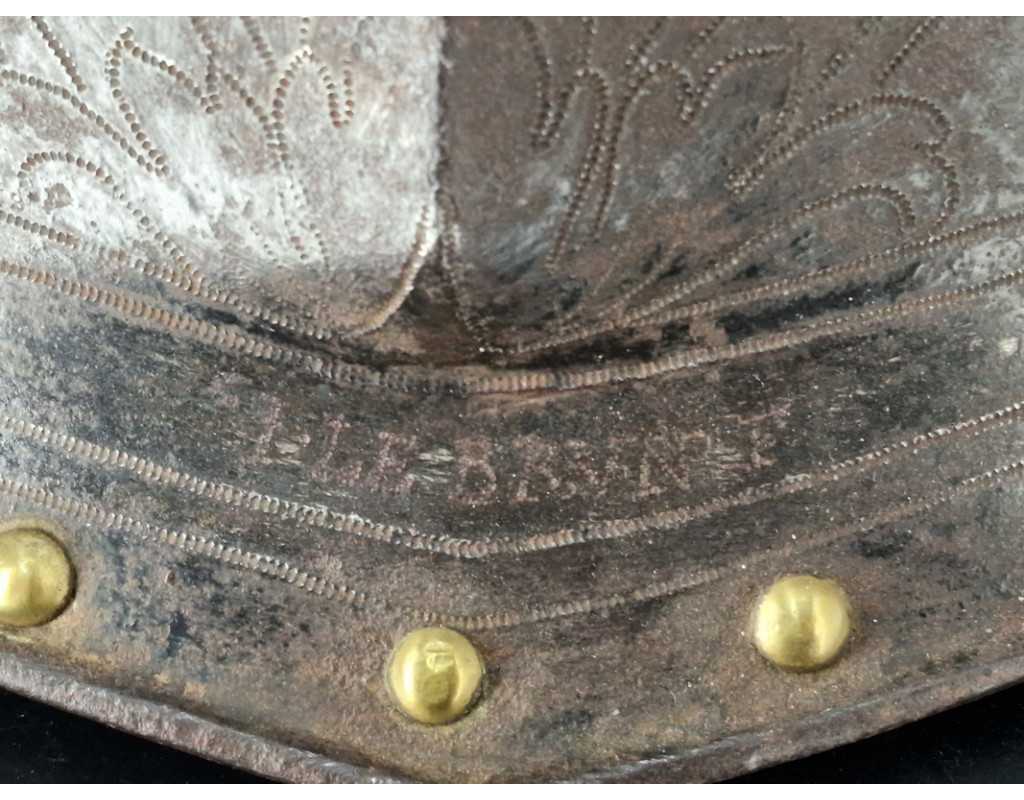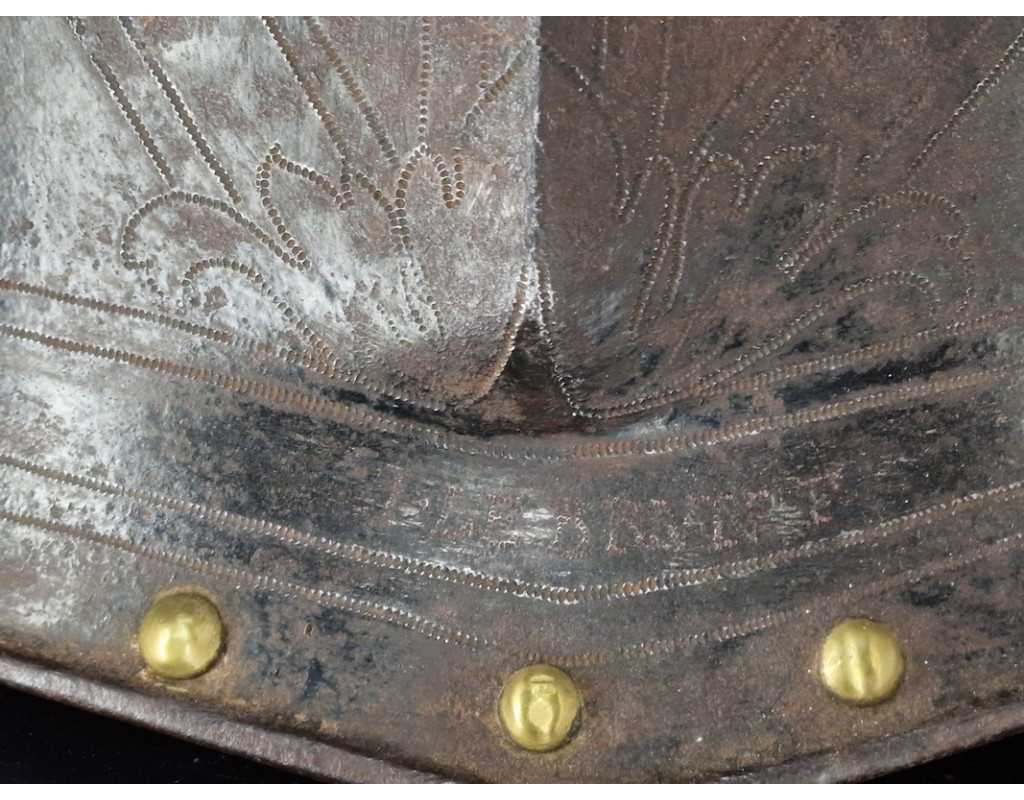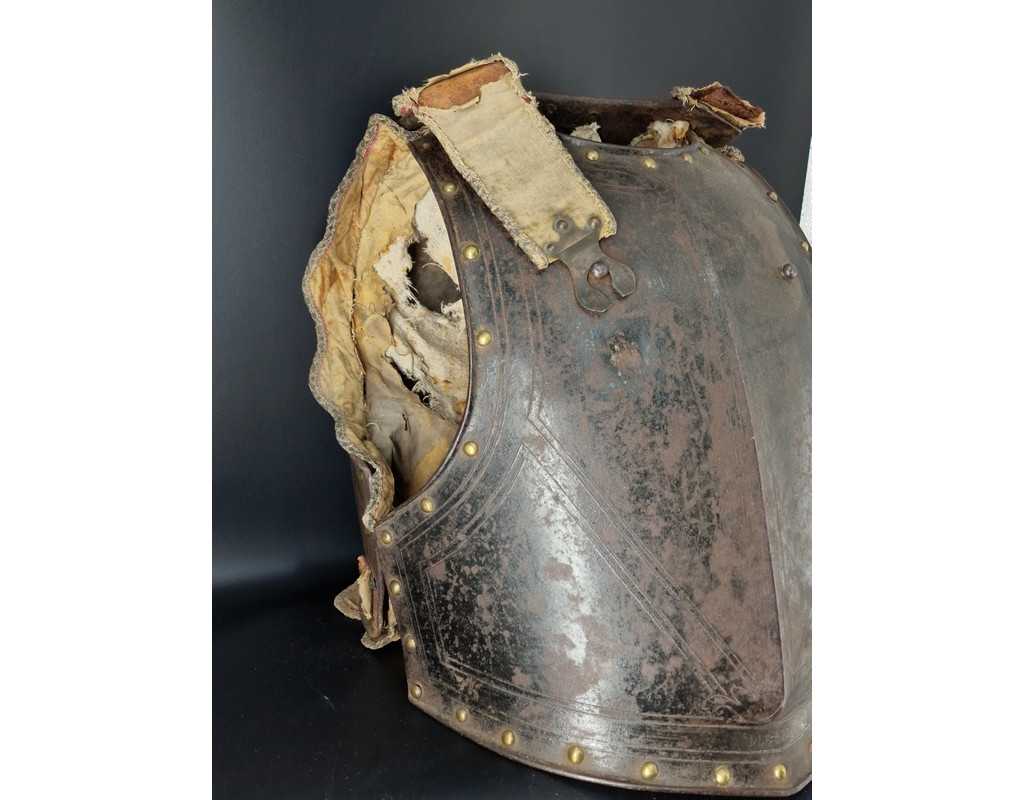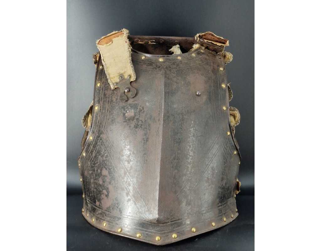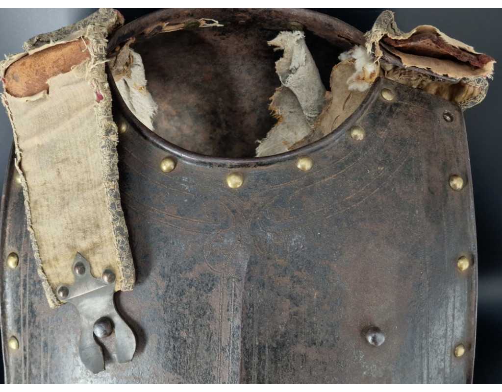 Cuirasse d’officier monté en fer gravée, empreinte de tir d’épreuve sur le plastron. Riche décor de motifs géométriques et floraux en fins pointillés, poinçonnée I-LEBRUN. Restes de matelassure sur la partie dorsale en gros lin recouvert de soie avec des manches en velours jaune et bordure de galon argenté. Une bretelle est en cuir recouvert du même velours à bordure à galon argenté. Reste de peinture noire, manque deux rivets au plastron. Poids total 16 kg. Rare dans cet état. Fabrication de Besançon vers 1680 - France époque Louis XIV