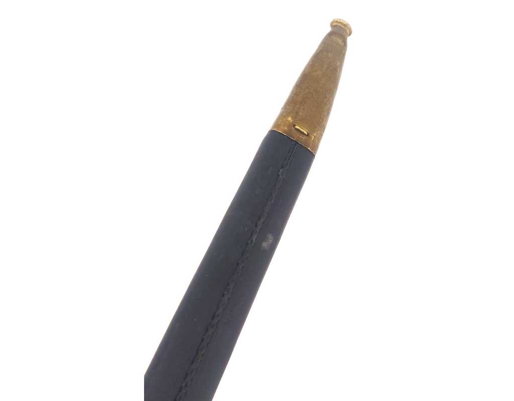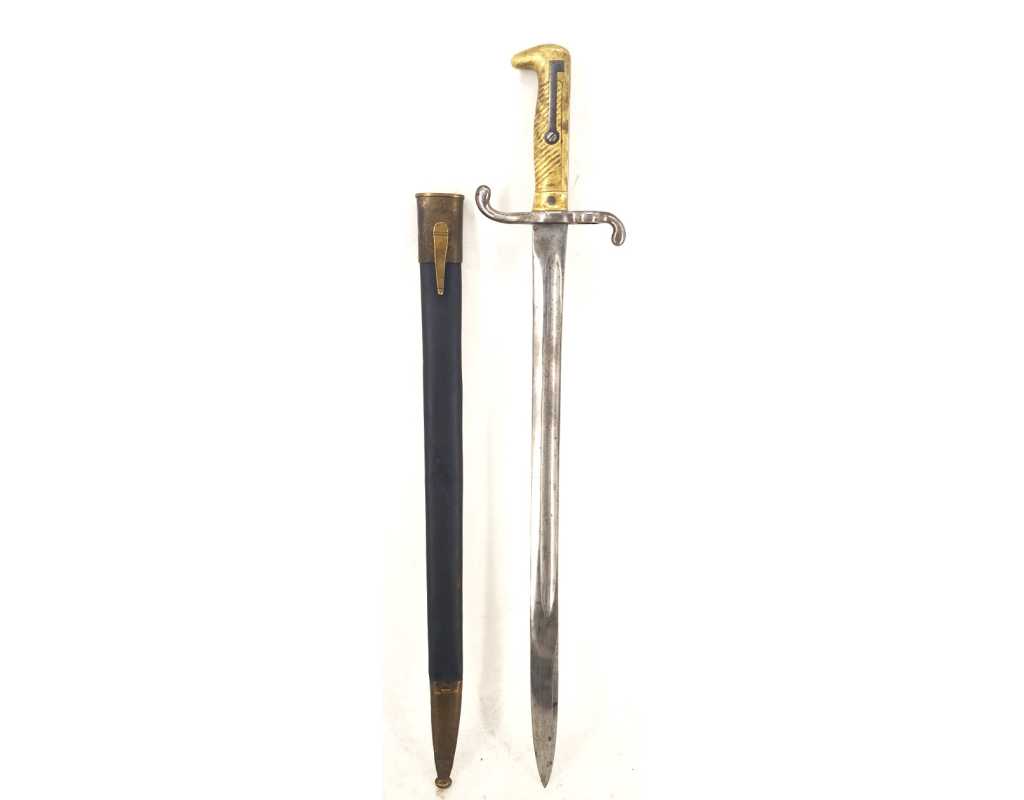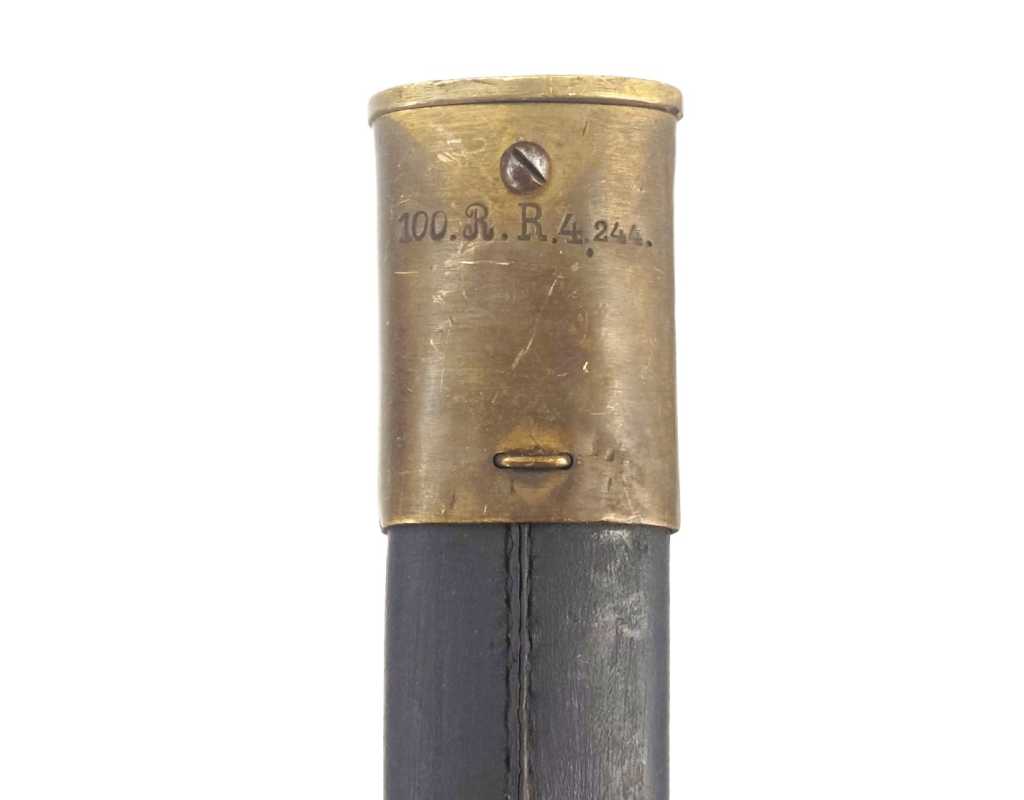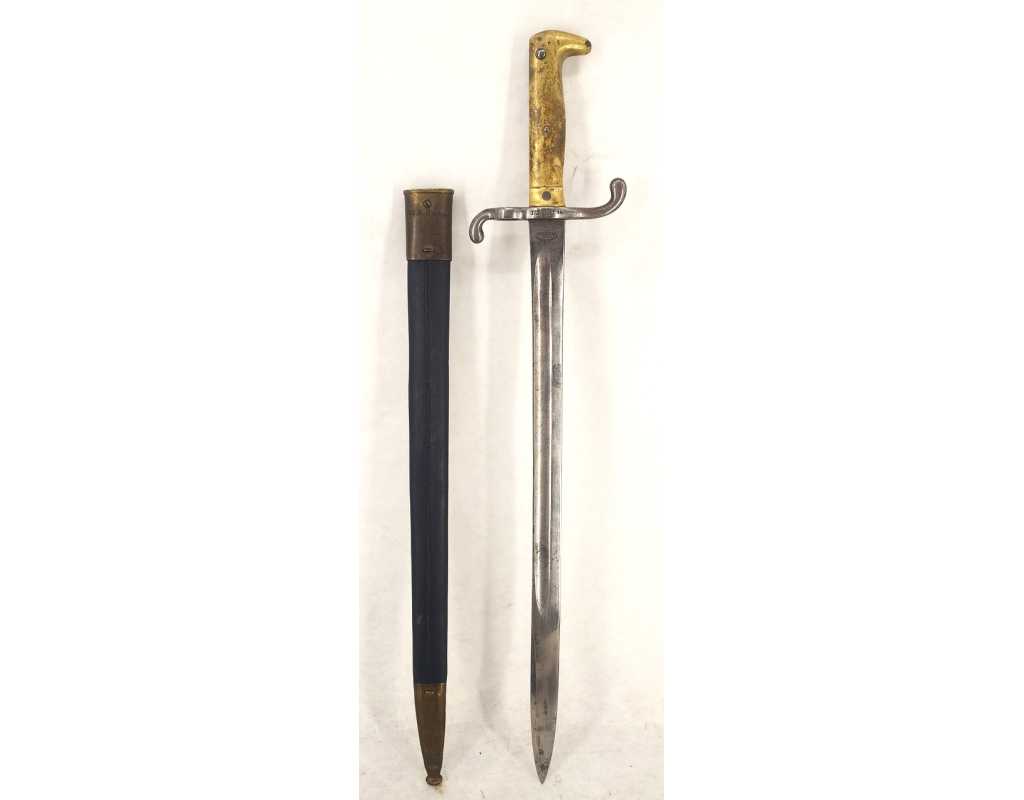 Baïonnette Mauser 1871 datée 1874. Belle patine sans usure particulière, poignée laiton à bouton de verrouillage fonctionnel, croisière régimentée, lame sans usure particulière bien réceptionnée, fourreau cuir en excellent état, régiment différent sur la chape laiton.