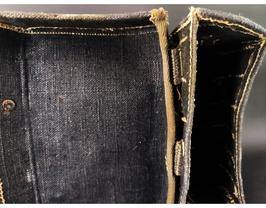 Sacoche porte-cartouches de lance-fusée, en toile bleue, sangles en cuir noir et toile verte. (Intérieur vide d’alvéoles)