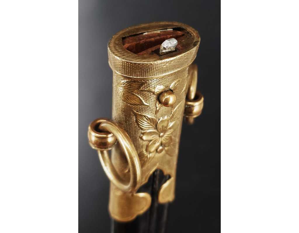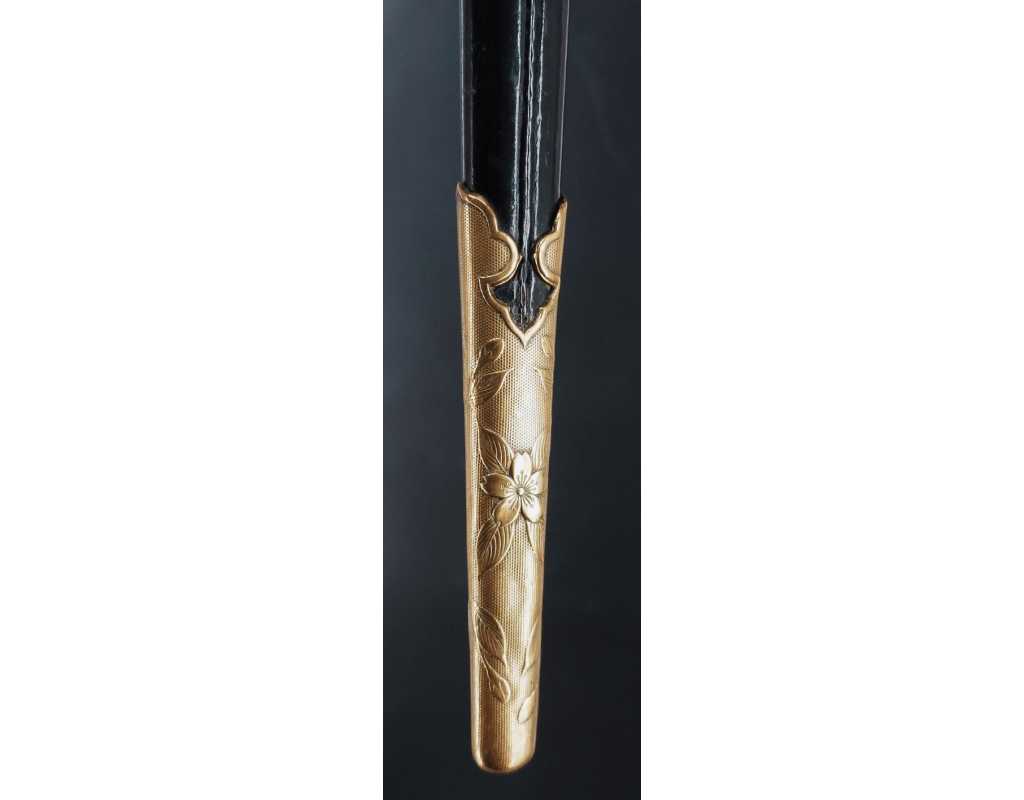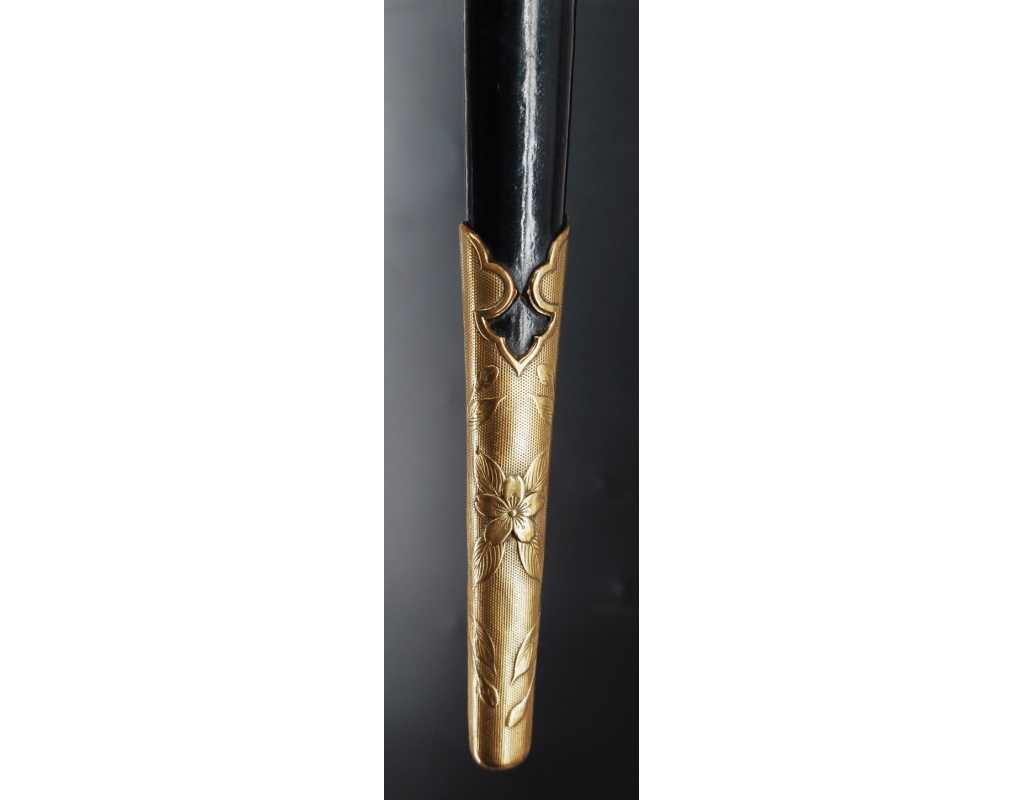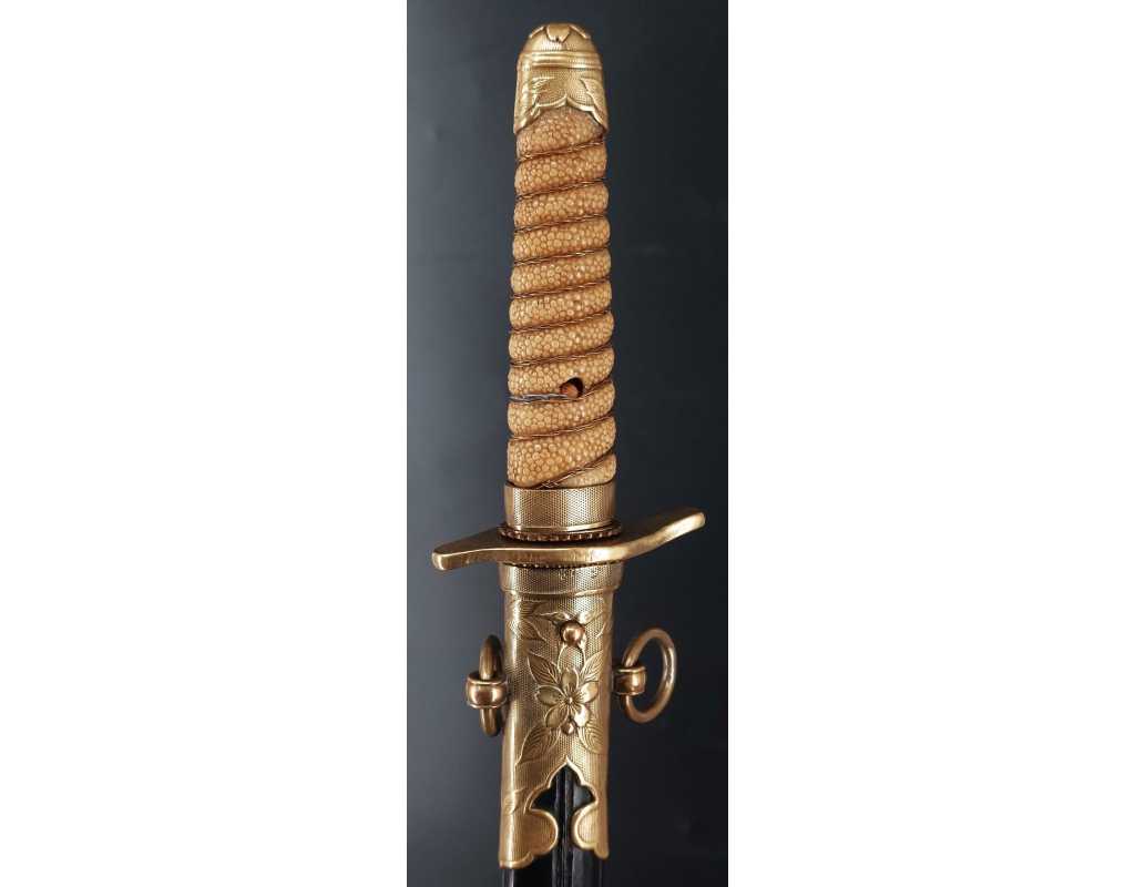 DAGUE D'OFFICIER DE LA MARINE IMPÉRIALE JAPONAISE, modèle 1883 de type tanto à garnitures laiton ciselées de fleurs de lotus, poignée bois recouverte de galuchat filigrané. Lame simple tranchant et gouttières avec trempe discernable, fines taches d'oxydation. fourreau bois gainé de cuir brun à deux garnitures laiton ciselées en suite, chape à verrou et anneau de suspente.