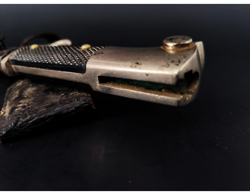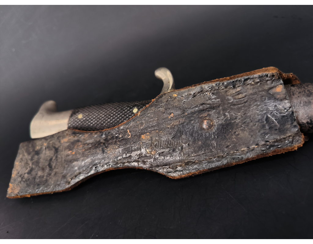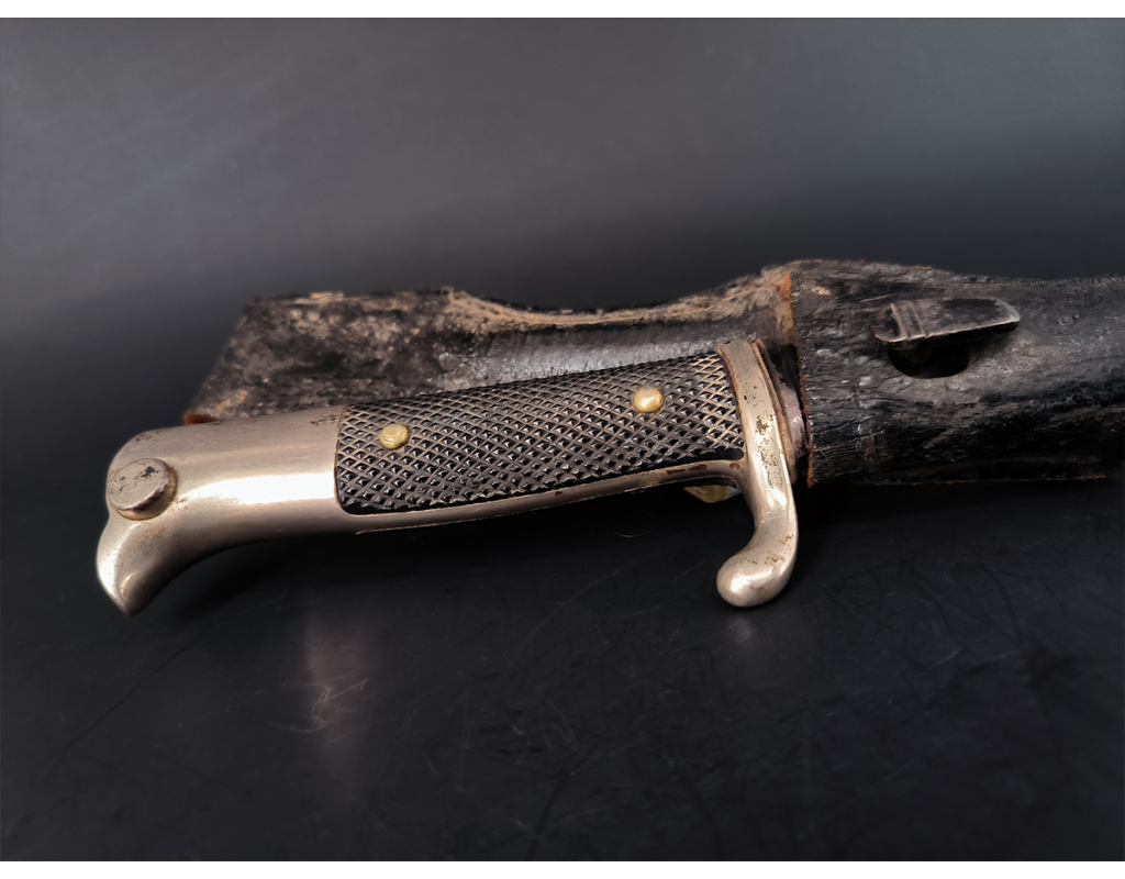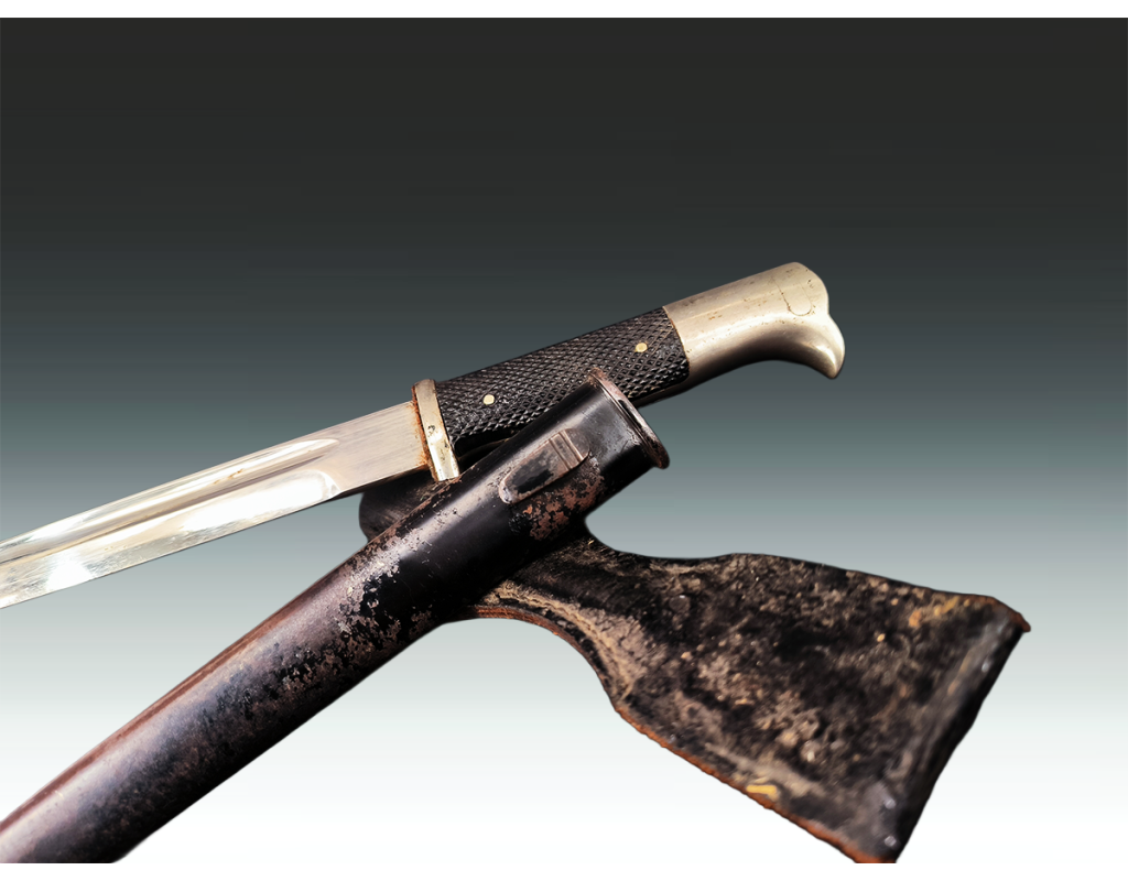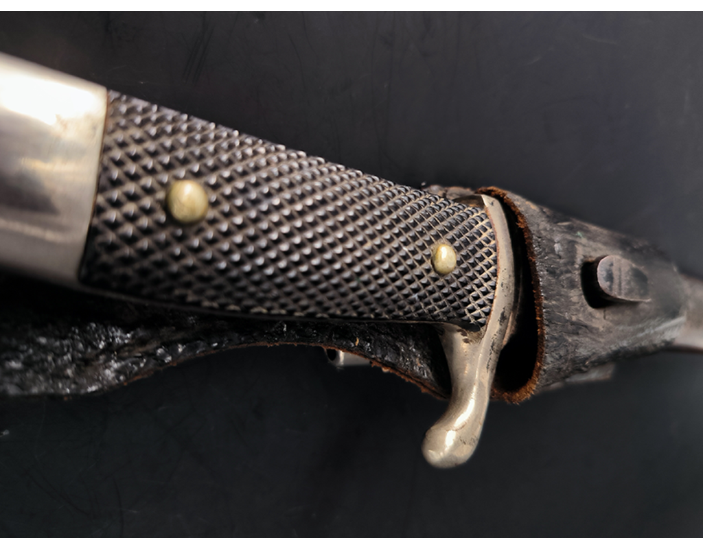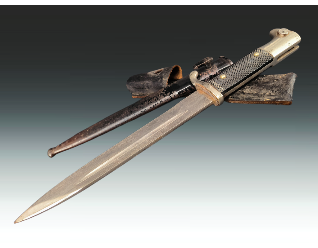 Couteau baïonnette type modèle KS98 dite 'de sortie', poignée fer nickelée à pommeau en forme de tête d'aigle, verrou fonctionnel avec feutrine verte de protection dans le canal. Plaquettes en gutta-percha noire. Lame droite et plate, finition d'origine nickelée, gousset en cuir verni pour le port au ceinturon, monté d'origine. Fourreau fer laqué noir, patiné. L. totale 35cm