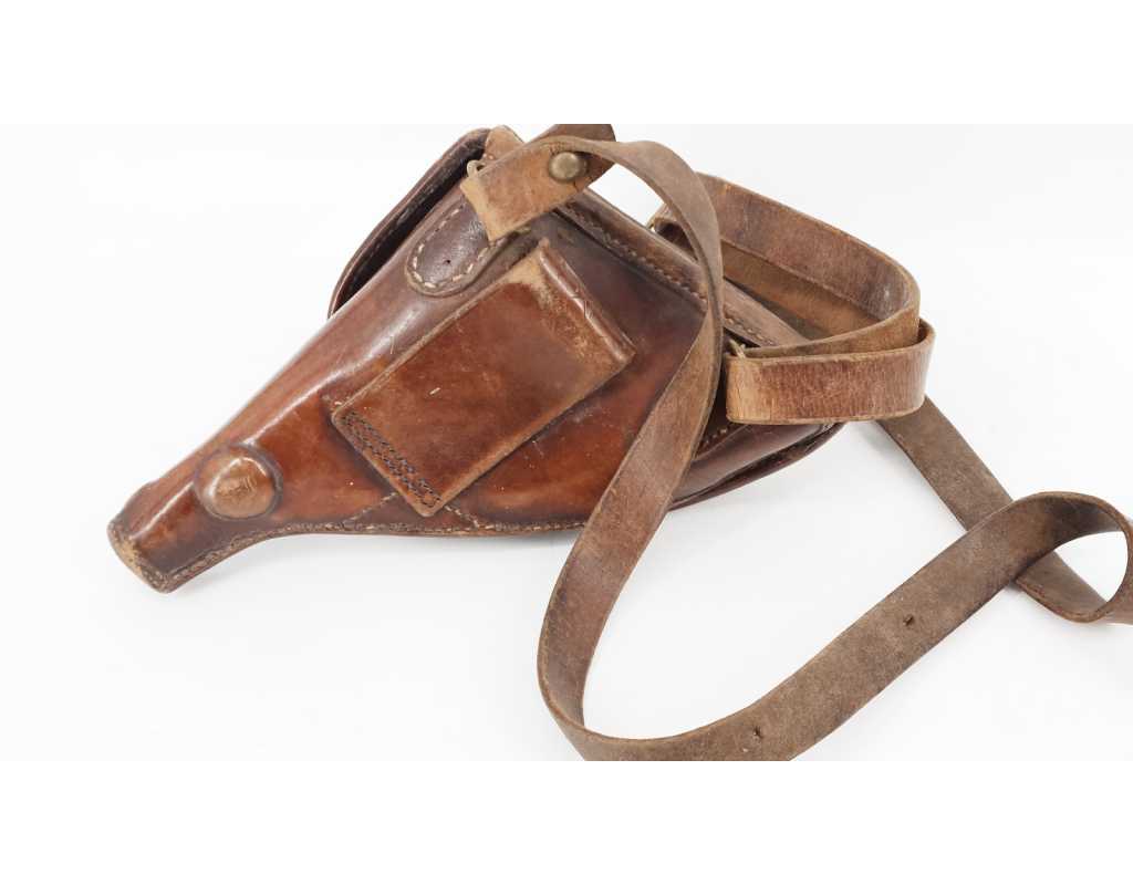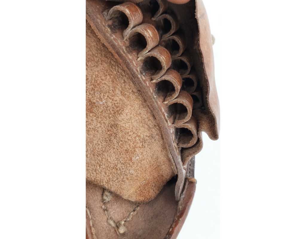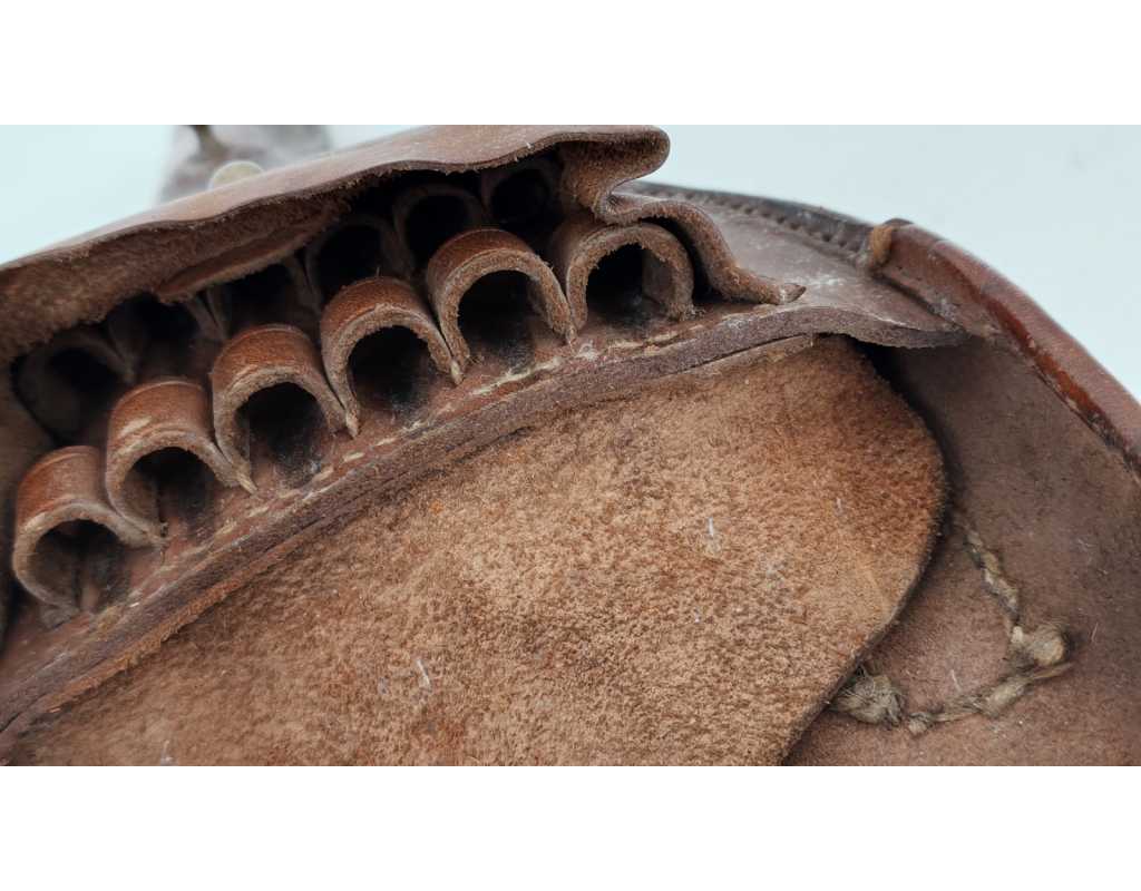 Etui de Revolver 1873 modèle 1876 dit "Jambon" daté janvier 1895 sous tampon de réception République française, pochette à 12 alvéoles de calibre 11mm, cuir brun patiné sans déformation, légère traces d'usures sans déformation, brellage cuir à boucle laiton.