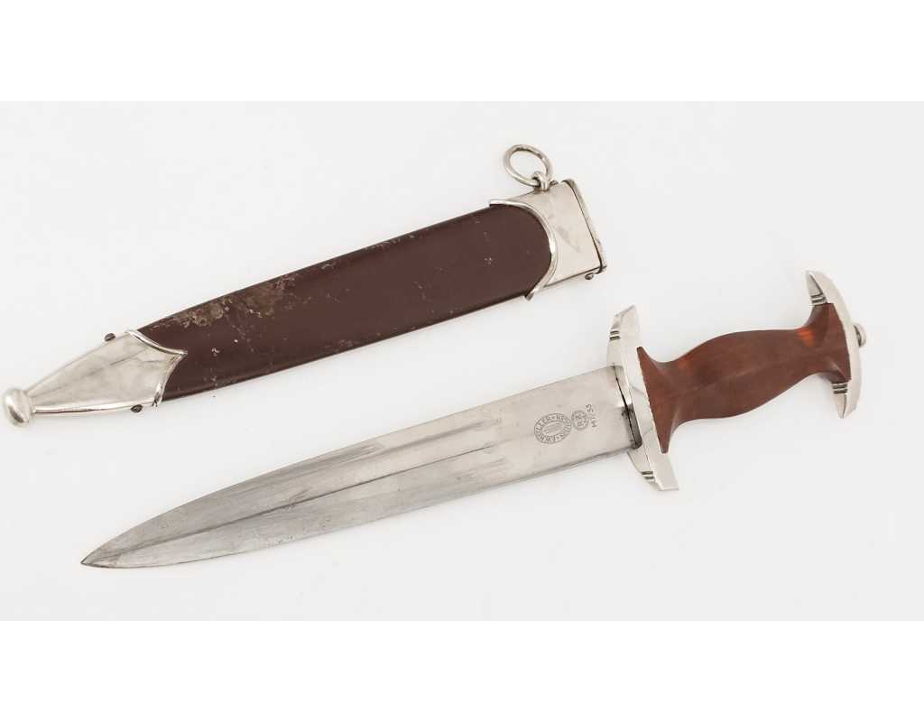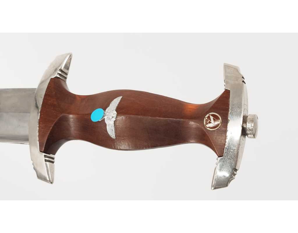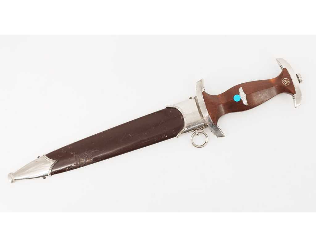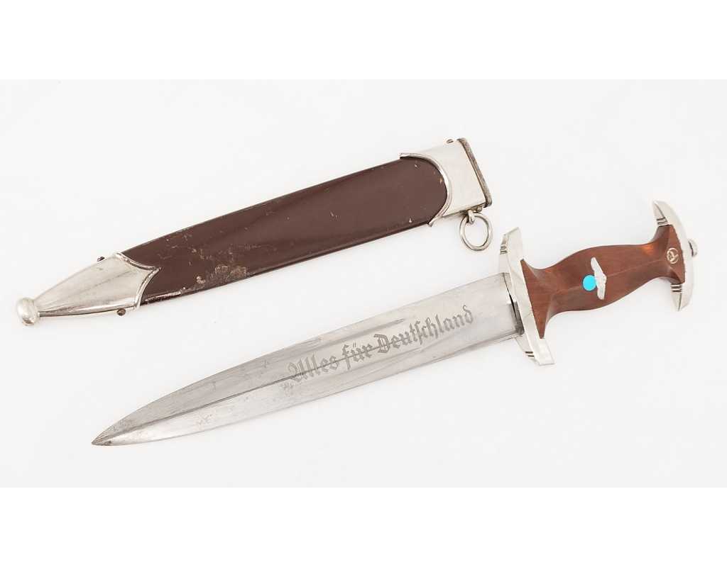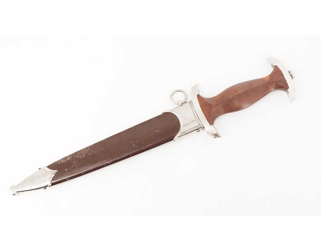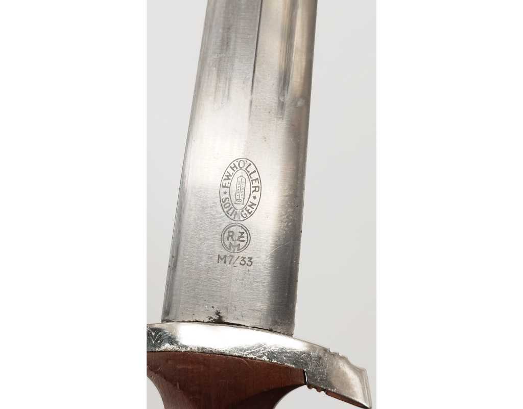 Dague SA de fabrication tardive RZM M7/33. Garniture en alliage de zinc nickelé. Poignée en bois fruitier marron. Insignes SA et aigle montés d’origine et parfaitement incrustés. Belle lame sans usure particulière. Devise SA "Alles Für Deutschland", fabrication F.W. Höller. Fourreau dans sa finition d'origine légèrement écaillé sans déformation. Usure et patine de l'ensemble parfaitement authentique et en excellent état de conservation.
