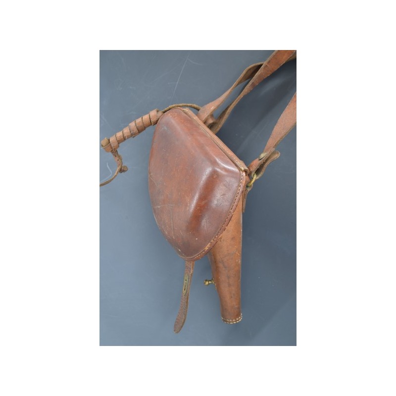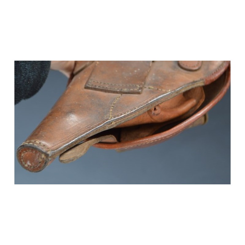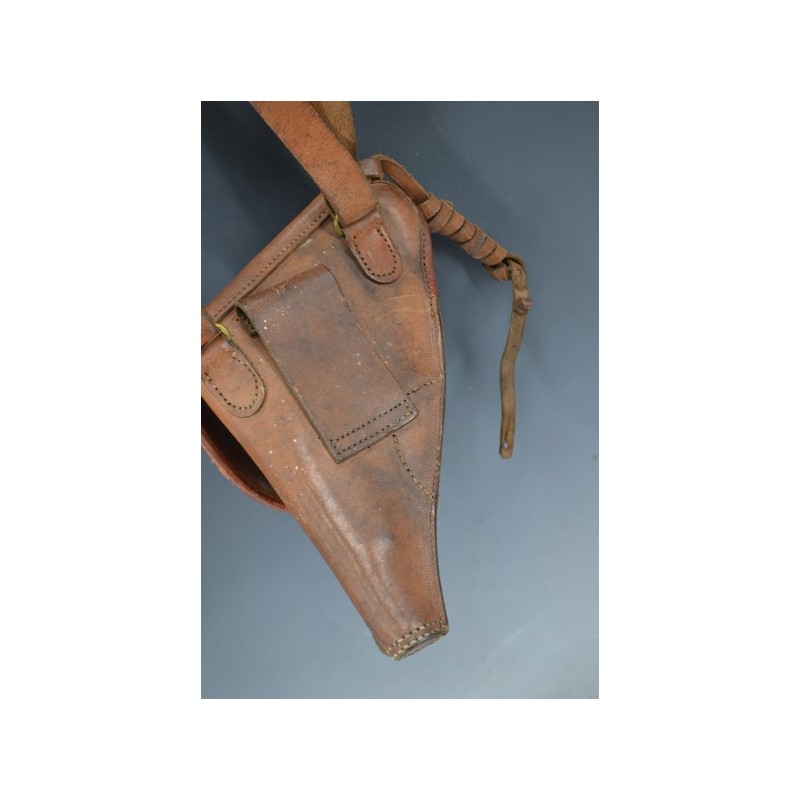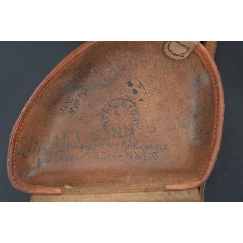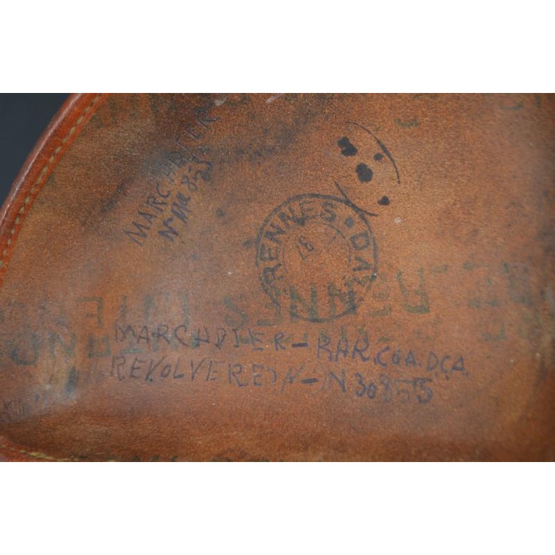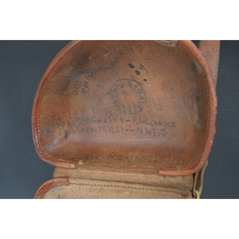 Etui complet de revolver modèle 1892 avec Dragonne Gendarmerie/ cavalerie (passant de ceinture plus court) produit à Rennes en 1937, nom du propriétaire MARCADIER, son N° de matricule 853 Régiment RAR.CGA.DCA et numéro de l'arme 30855 inscrite à l'intérieur du rabat. Cuir brun en parfait état, pochette à 3 compartiments de sachet de 6munitions. brellage et dragonne parfaites, petites traces d'usage sans accident ni déformation. Prix dégressif sans la dragonne