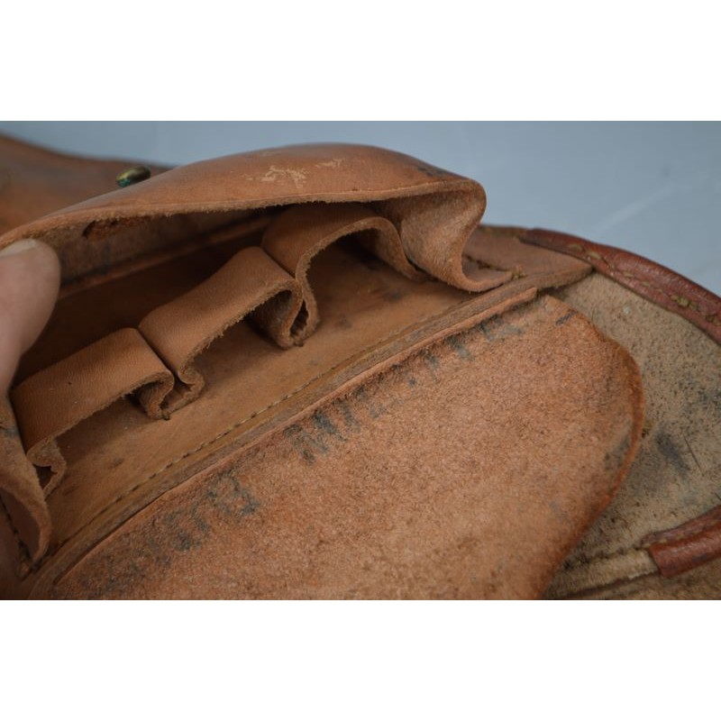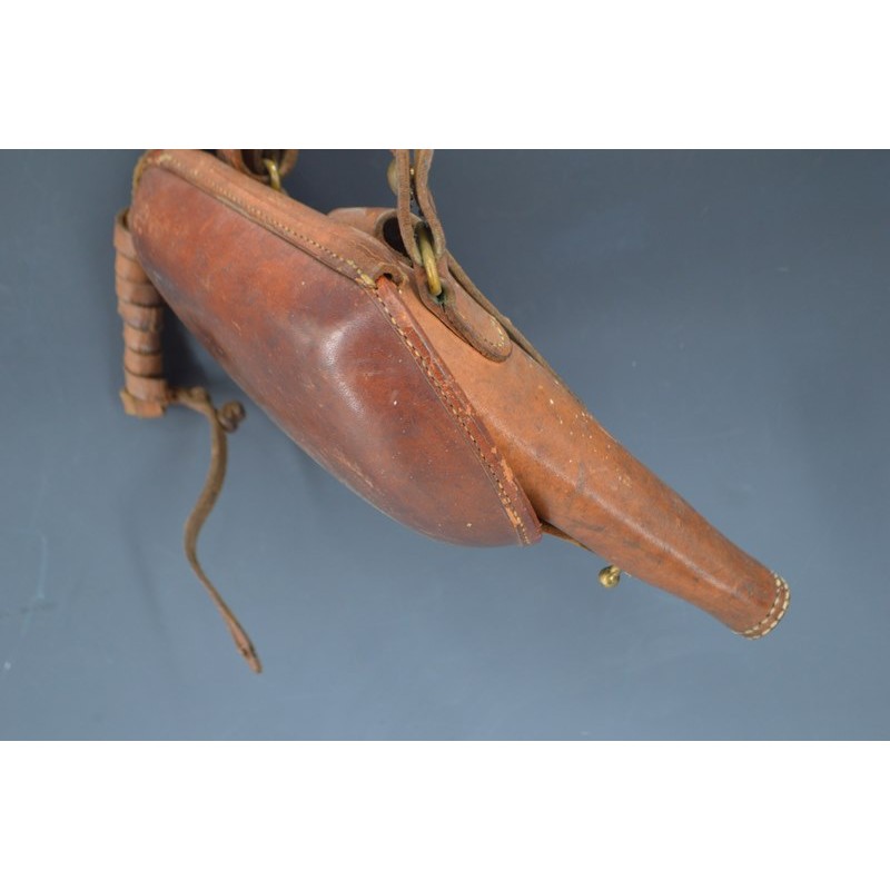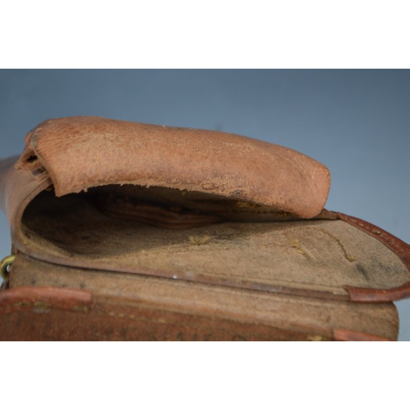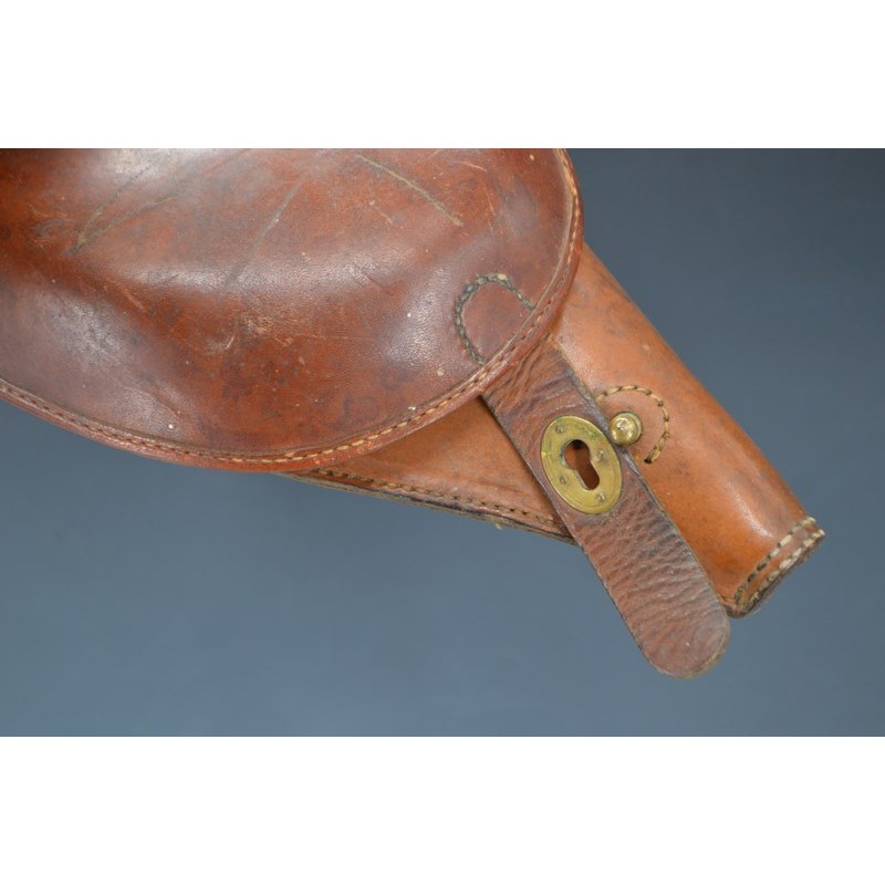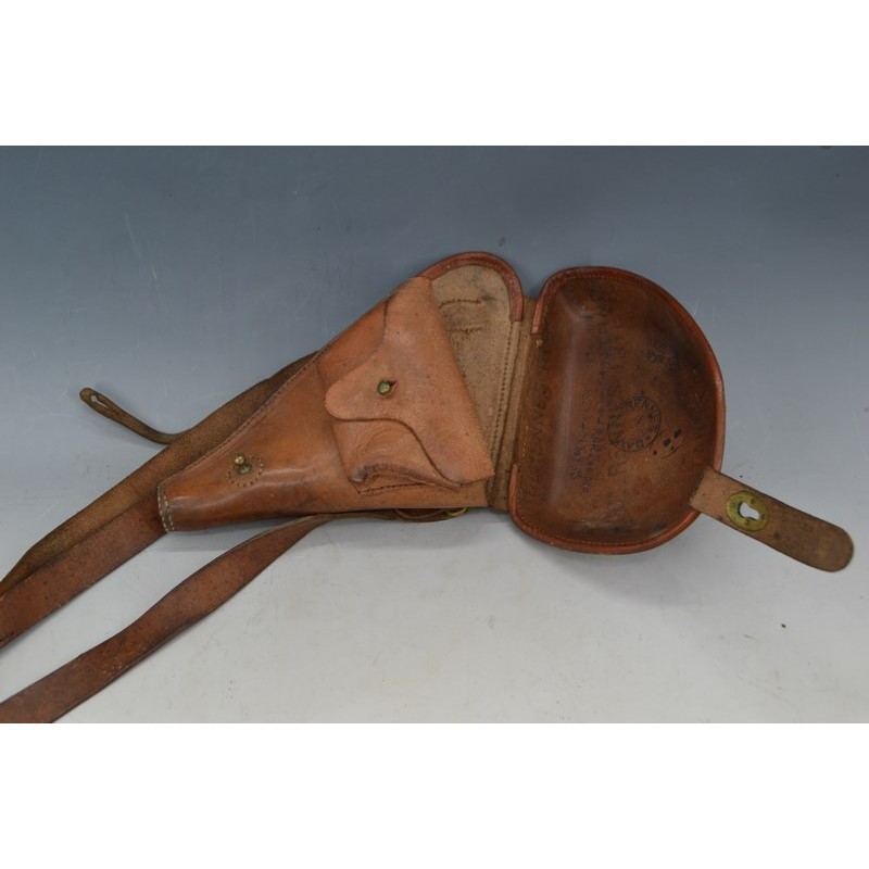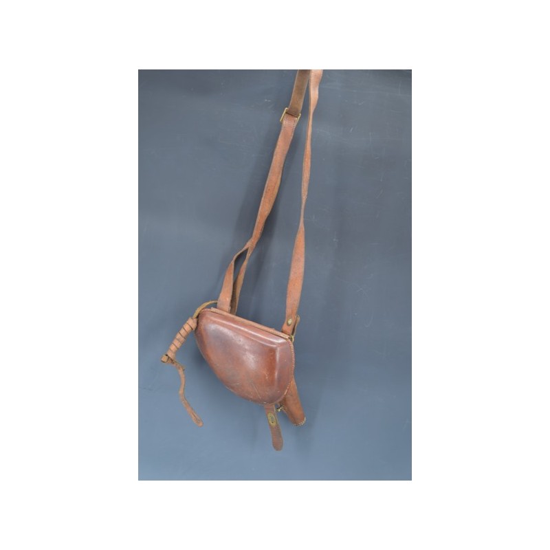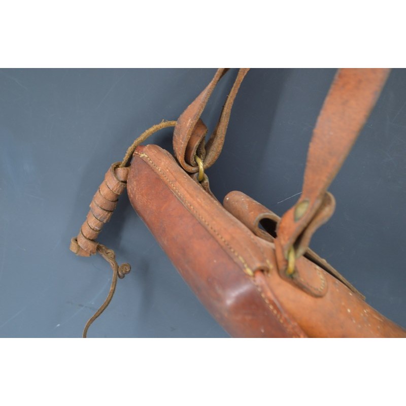 Etui complet de revolver modèle 1892 avec Dragonne Gendarmerie/ cavalerie (passant de ceinture plus court) produit à Rennes en 1937, nom du propriétaire MARCADIER, son N° de matricule 853 Régiment RAR.CGA.DCA et numéro de l'arme 30855 inscrite à l'intérieur du rabat. Cuir brun en parfait état, pochette à 3 compartiments de sachet de 6munitions. brellage et dragonne parfaites, petites traces d'usage sans accident ni déformation. Prix dégressif sans la dragonne