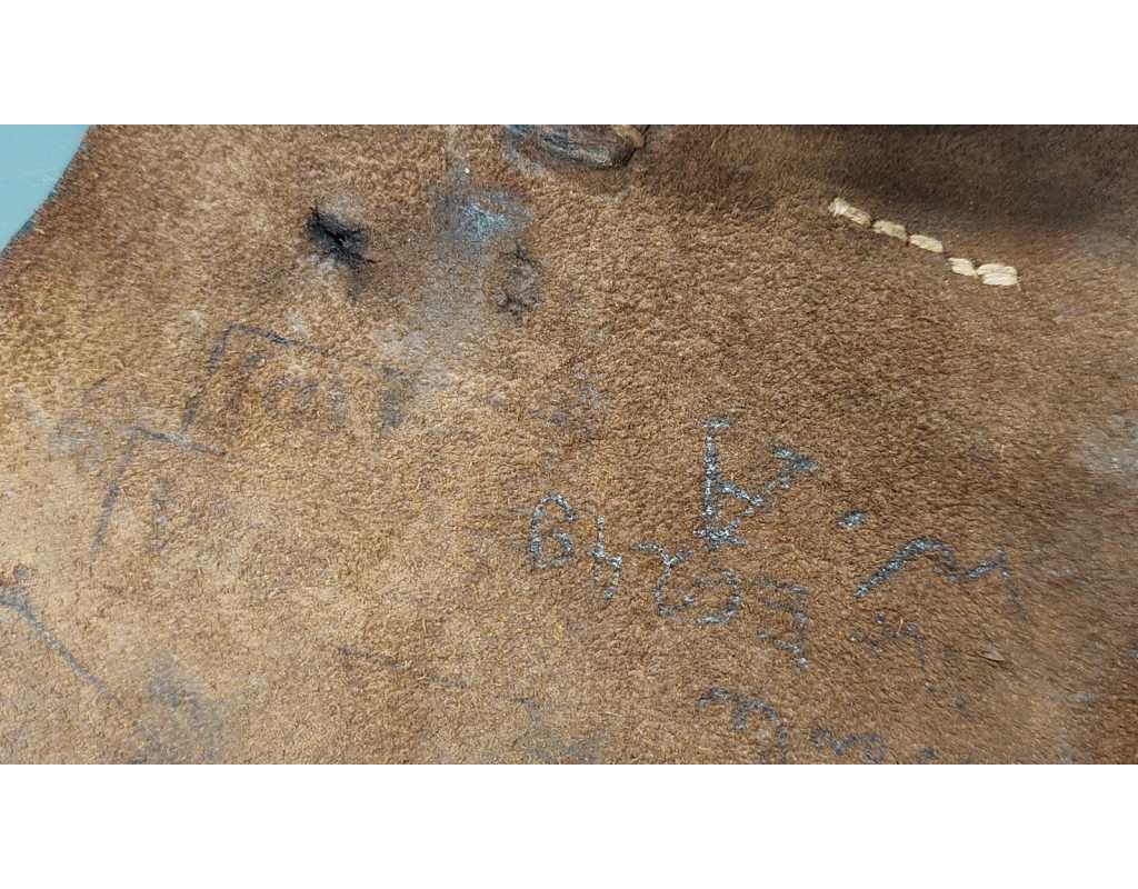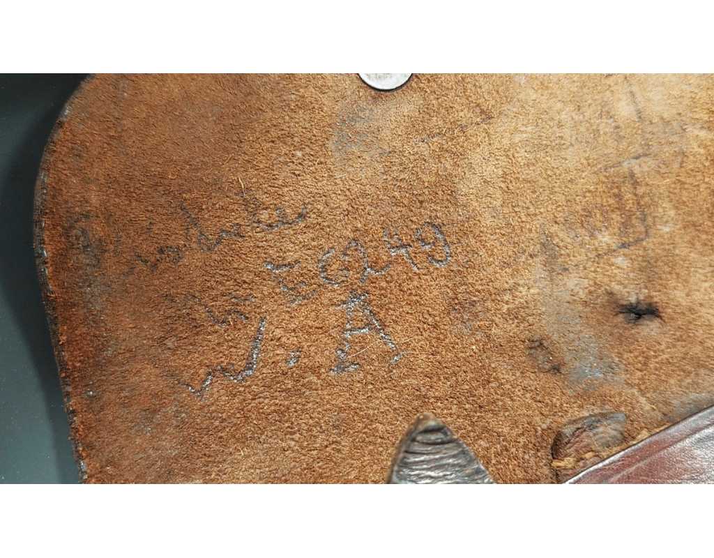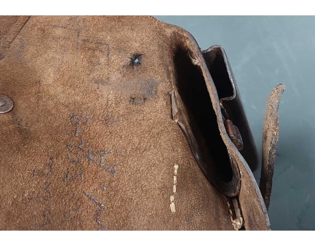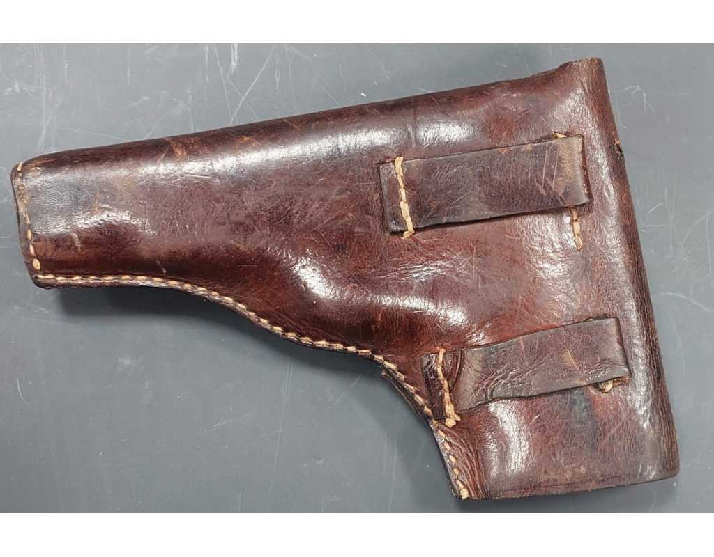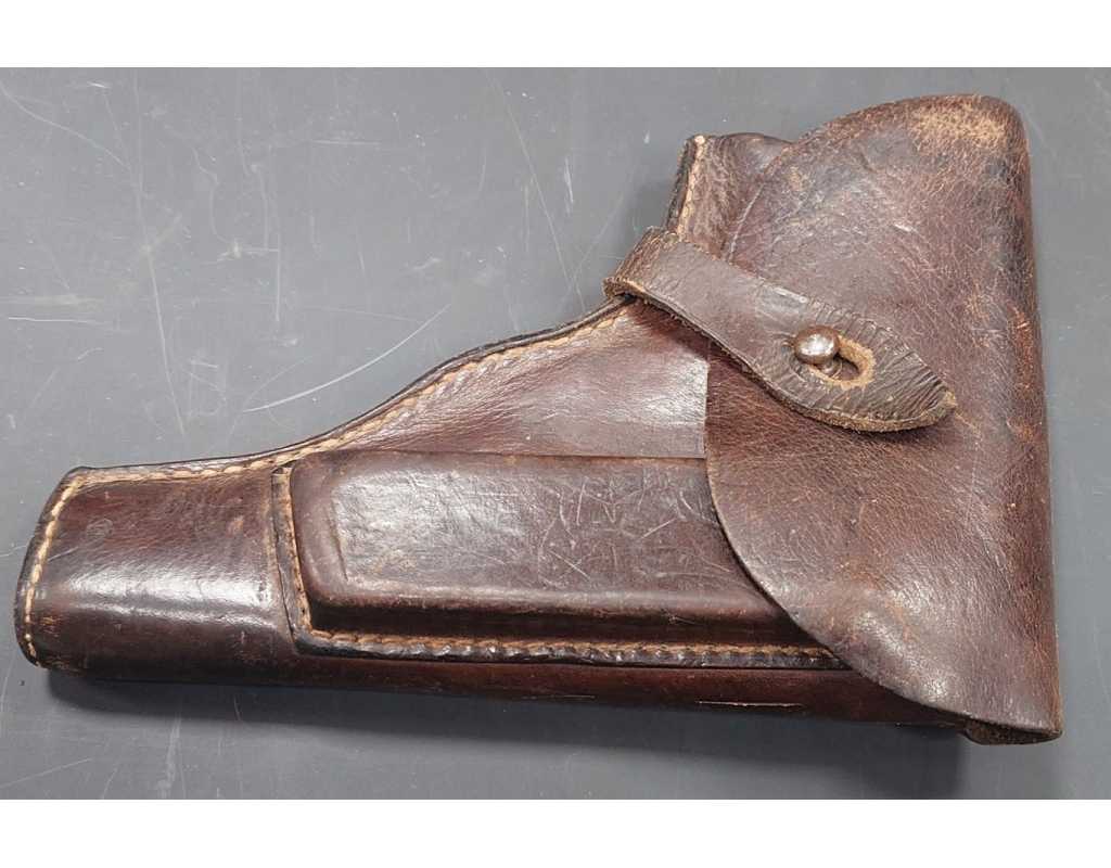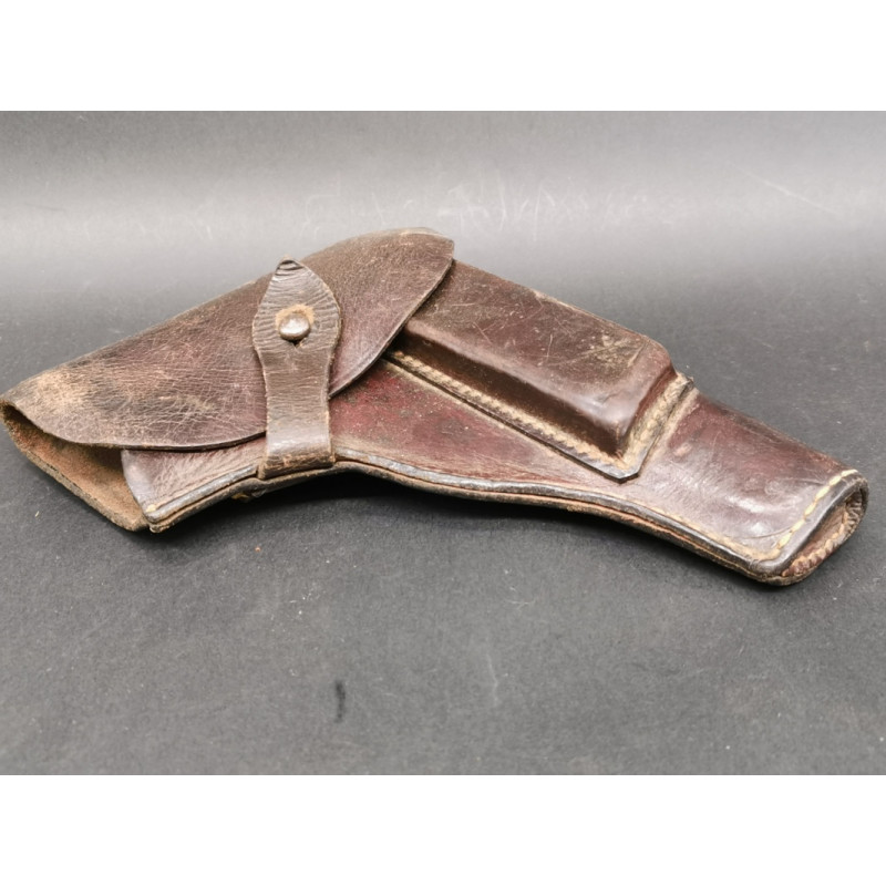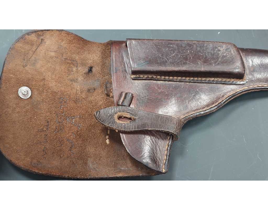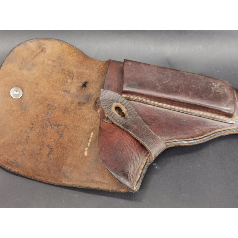 Bel étui de pistolet allemand P35 RADOM seconde guerre, fabrication en cuir brun souple usagé avec un petit trou sur le rabat, écrit sur le rabat intérieur à l’encre noire Pistole 56249 W.A. et deux tampons de fabricant à l'encre peu déchiffrable "44" et (b) à la fin des deux tampon