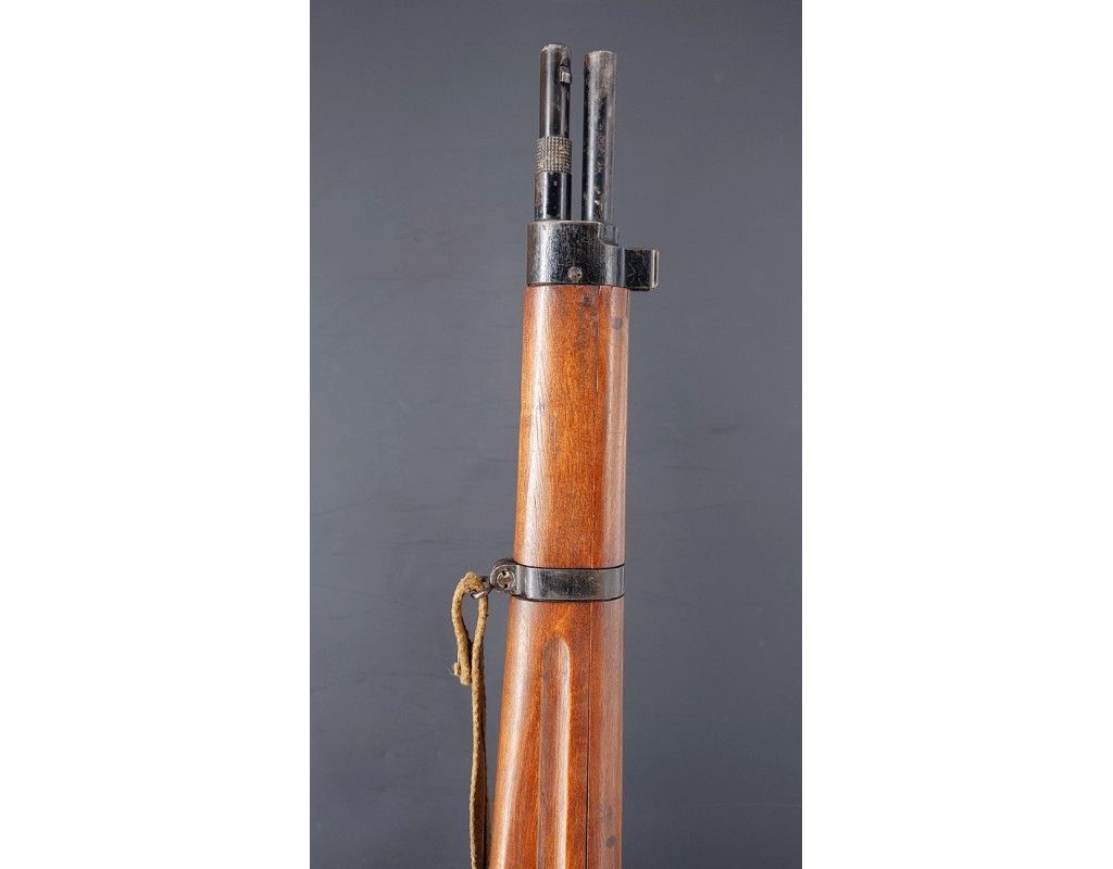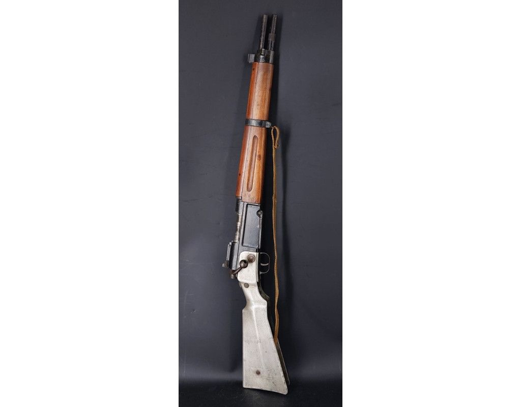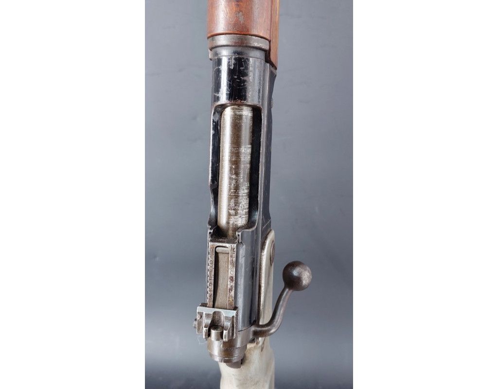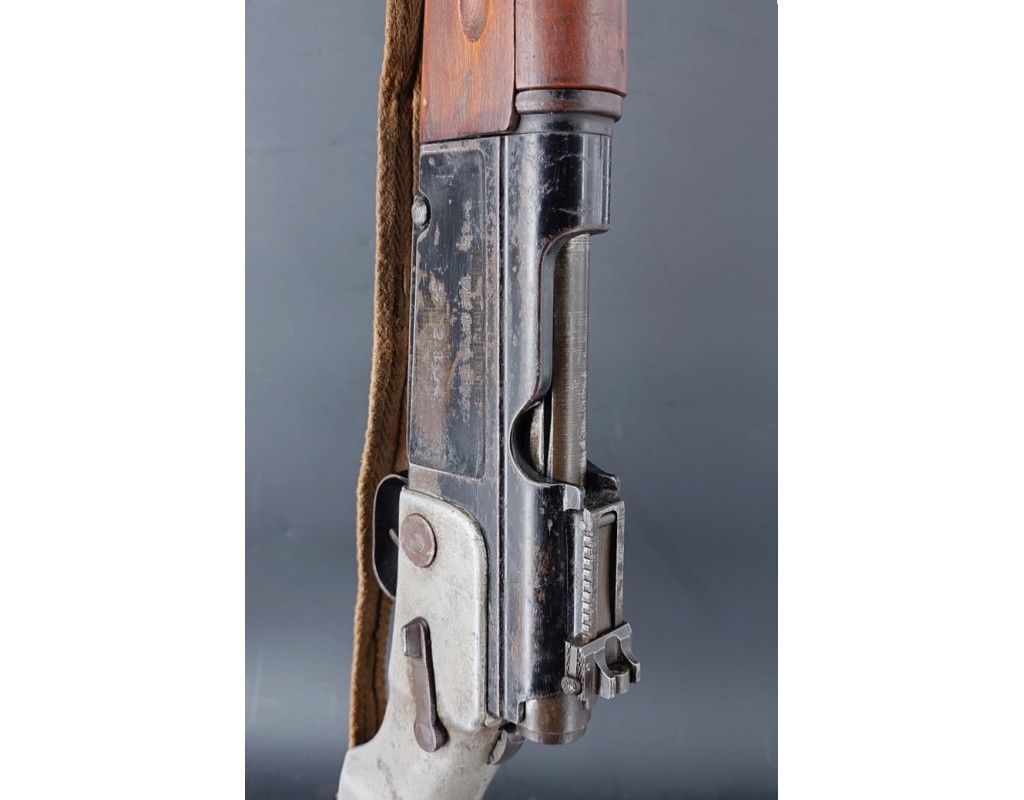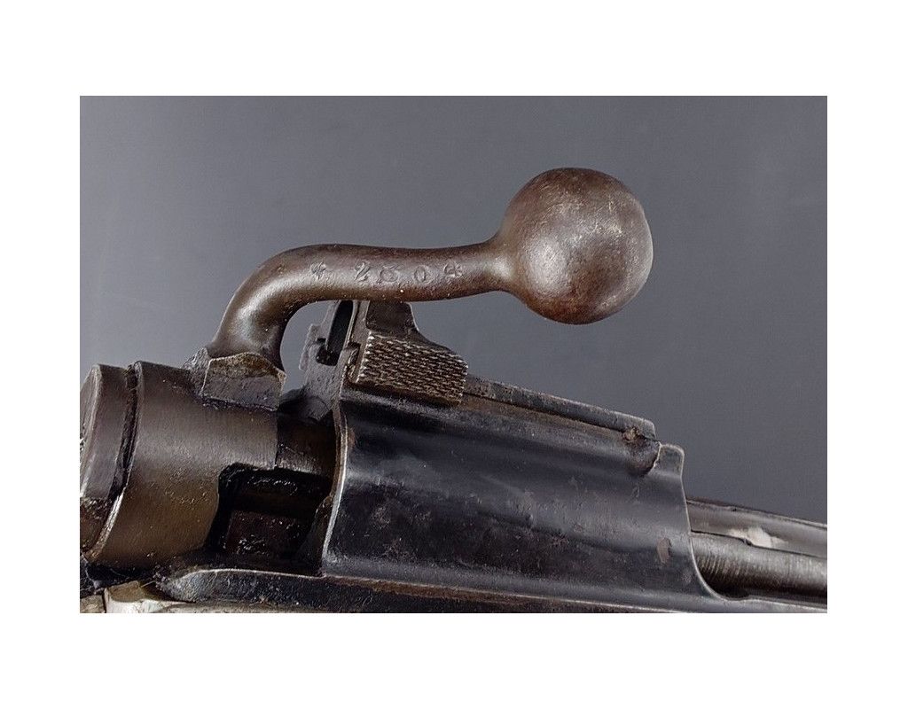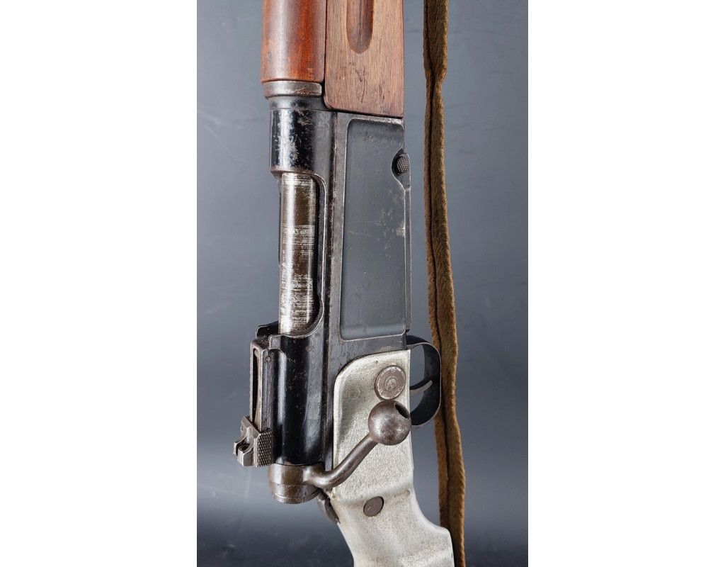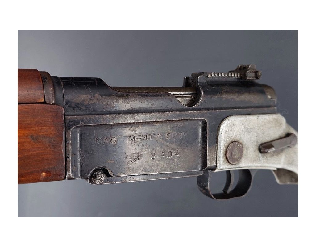 Rare Fusil MAS36 CR39 des troupes alpines françaises, mon matricule F2804 produit en 1939 dans sa finition d'origine peint noir cuit au four, crosse fixe (non visible) pour conserver le classement en catégorie C1, bretelle en tissu montée d'origine ressort de l'enrouleur d'origine ressort défaillant, rayures brillantes sans usure particulière ni tache. Toutes pièces au même numéro y compris la baïonnette, dans son jus jamais en collection, provenance maquis de Haute Savoie 1944.