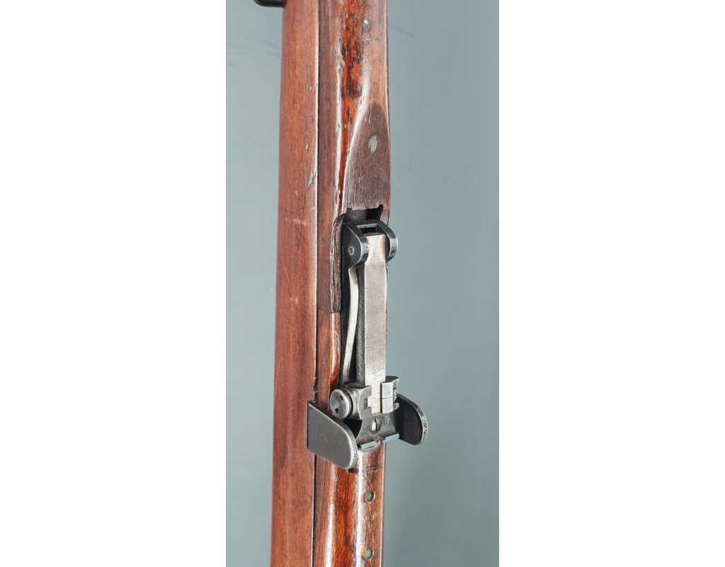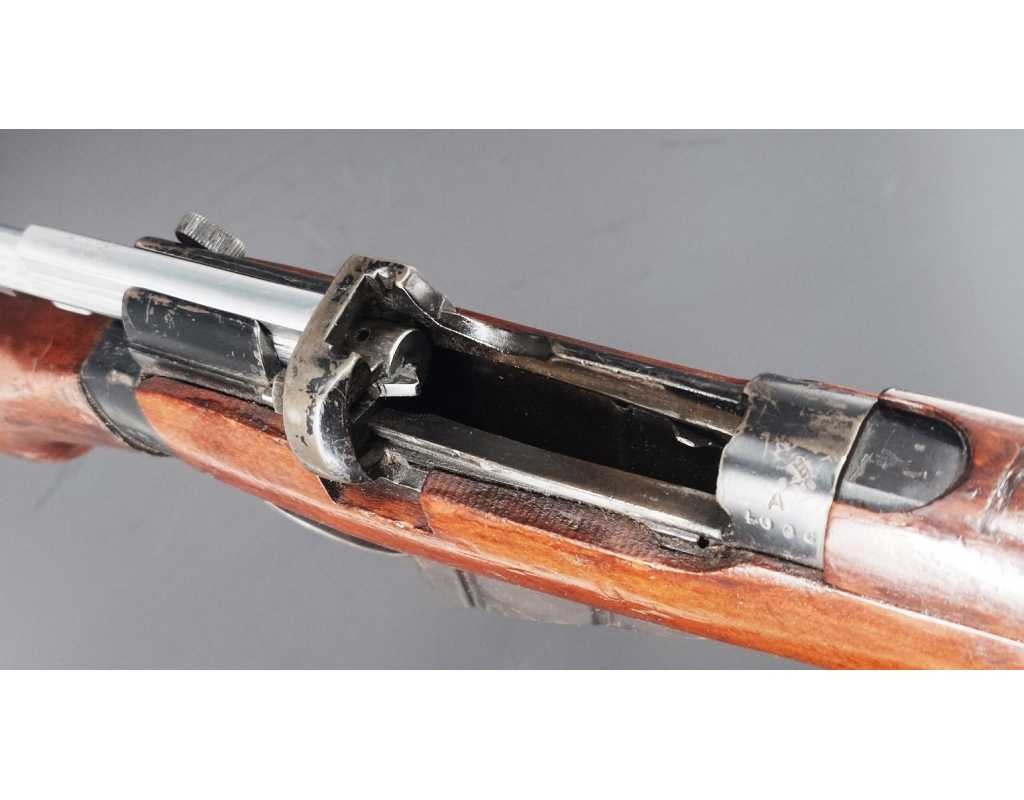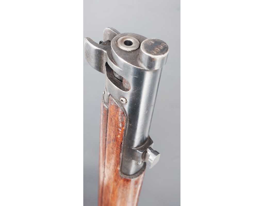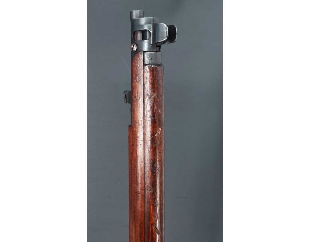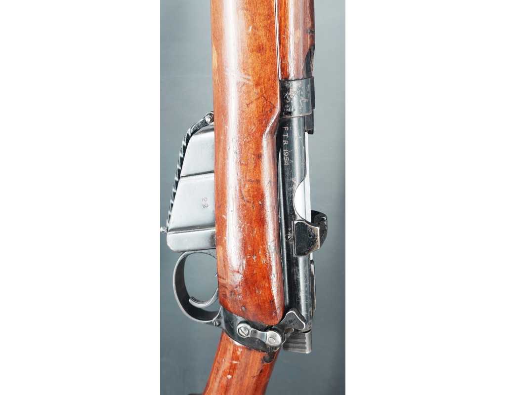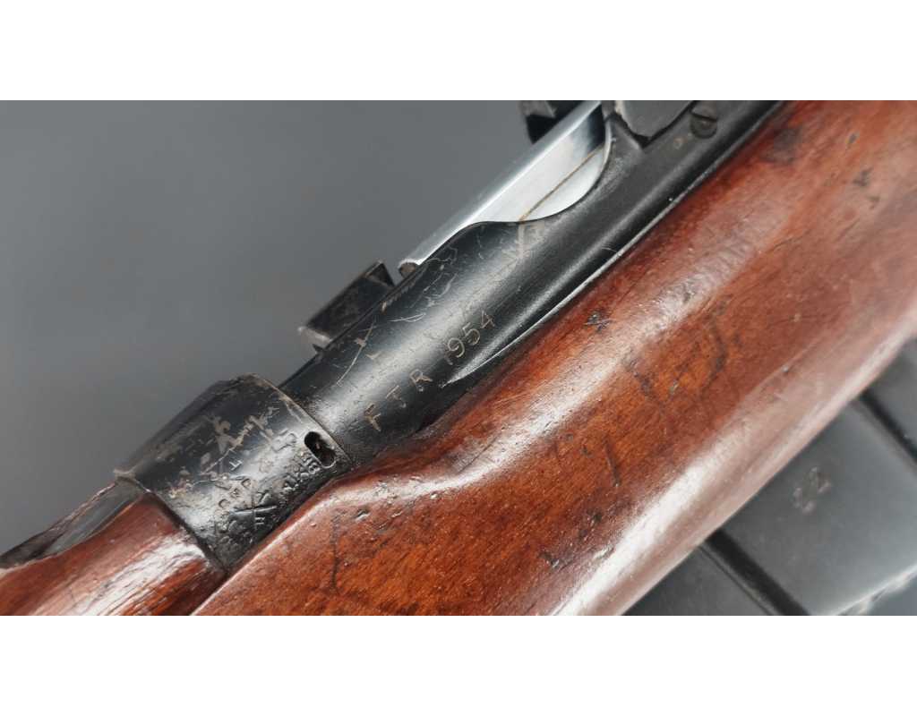 Fusil d'entrainement militaire pour l'infanterie ENFIELD N°1 MKIII ShT22 IV marqué FTR1954, capacité un coup répétition manuelle calibre 22LR. Mécanisme complet avec toutes pièces d'origine parfaitement homogène et au même numéro, bons marquages bien lisibles. peinture noir d'origine patiné de stockage sans oxydation. Rayures brillantes miroir sans usure ni tache. Crosse et fut en parfait état, quelques traces de manutention.