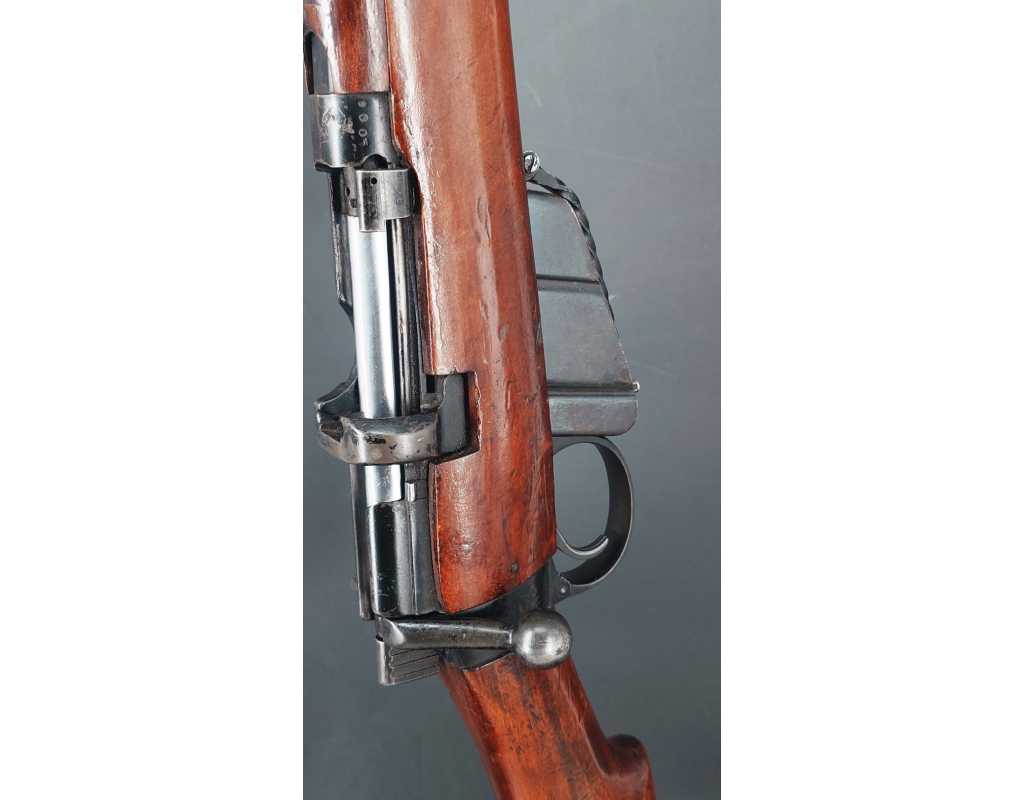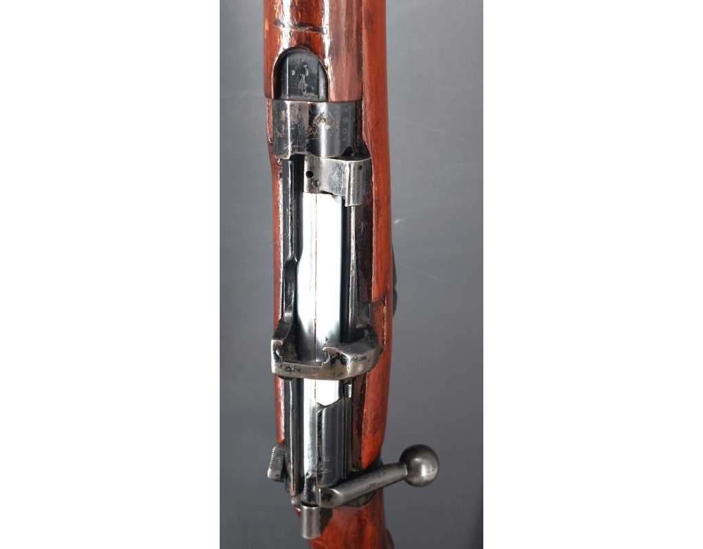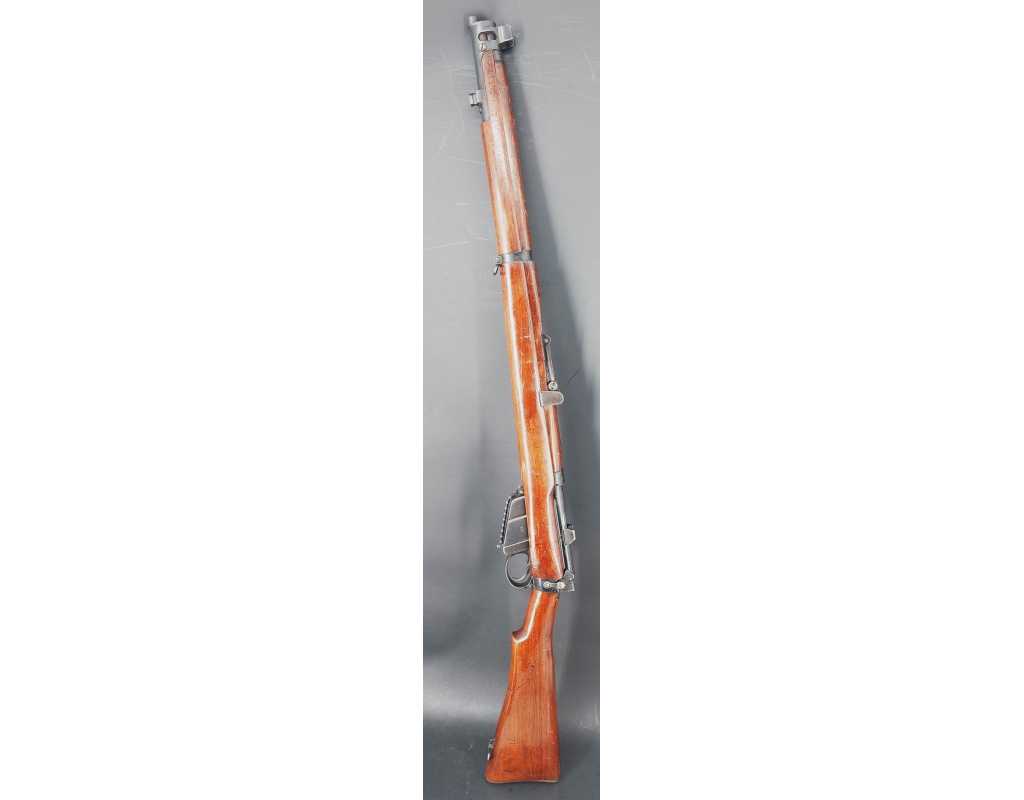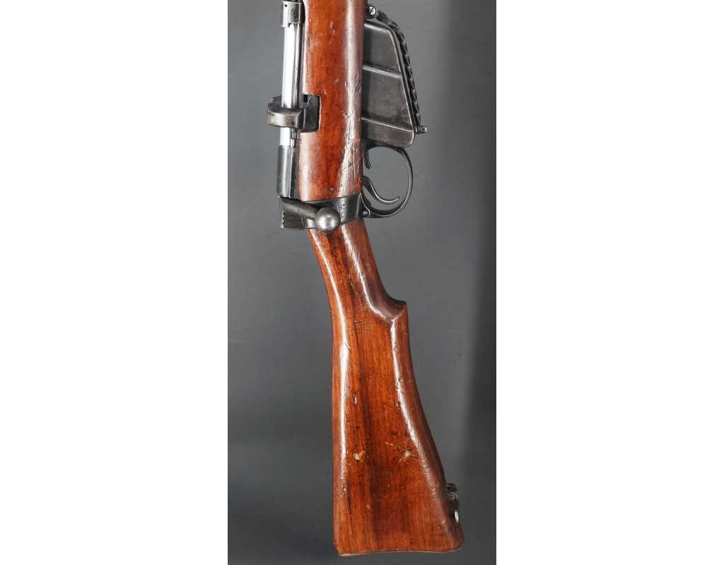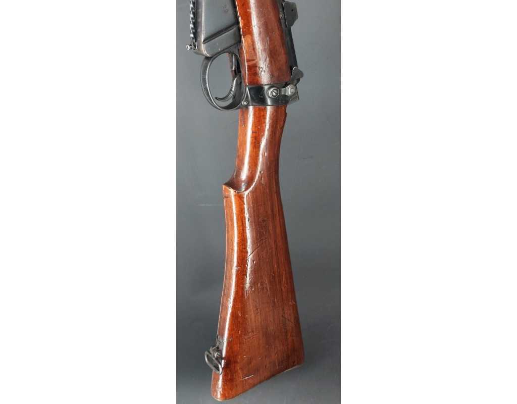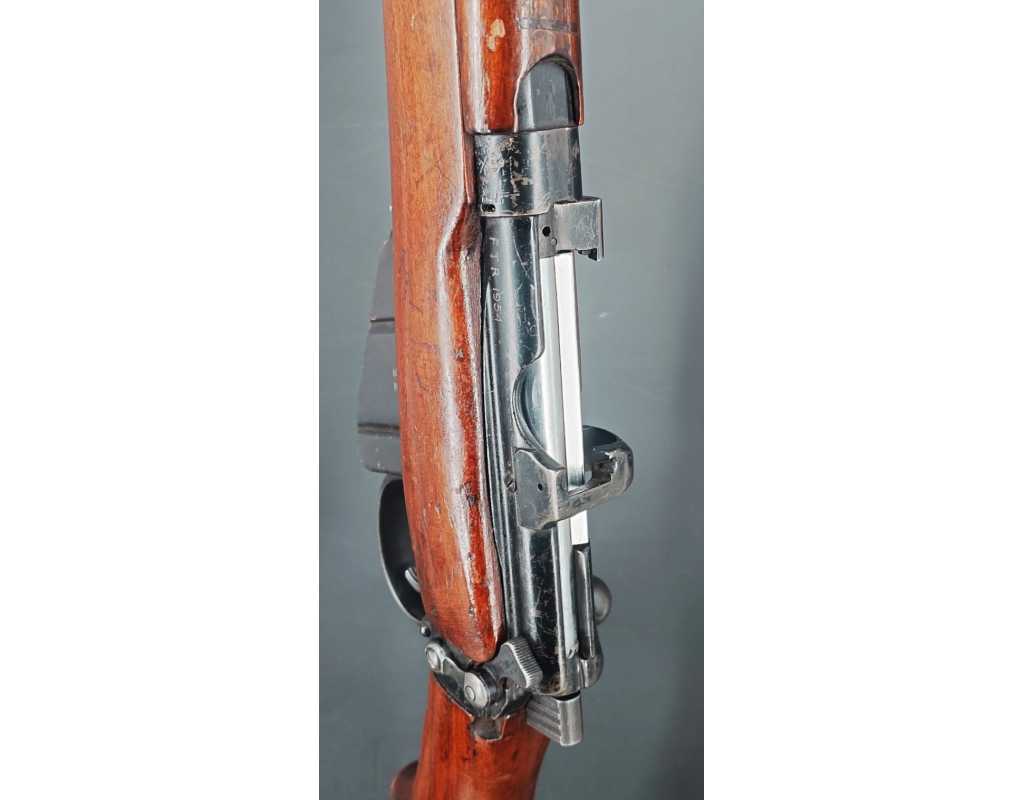 Fusil d'entrainement militaire pour l'infanterie ENFIELD N°1 MKIII ShT22 IV marqué FTR1954, capacité un coup répétition manuelle calibre 22LR. Mécanisme complet avec toutes pièces d'origine parfaitement homogène et au même numéro, bons marquages bien lisibles. peinture noir d'origine patiné de stockage sans oxydation. Rayures brillantes miroir sans usure ni tache. Crosse et fut en parfait état, quelques traces de manutention.