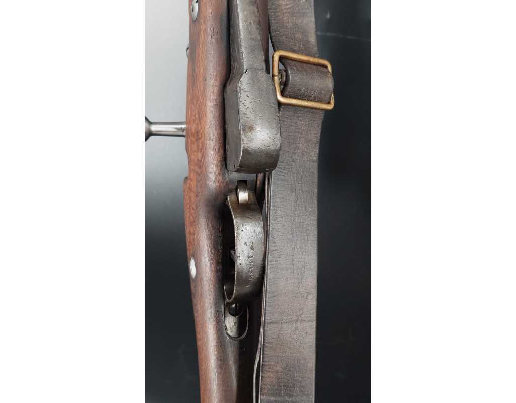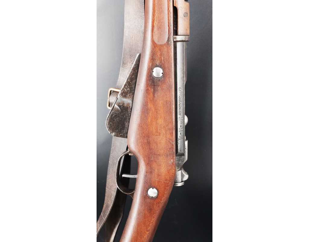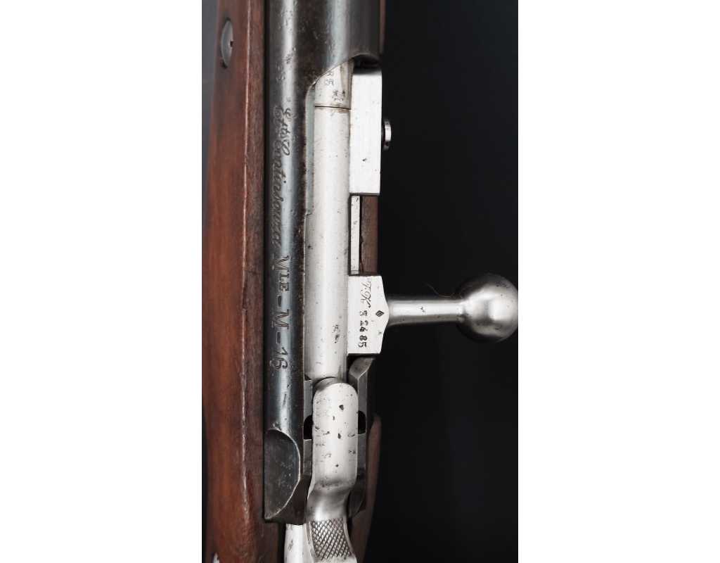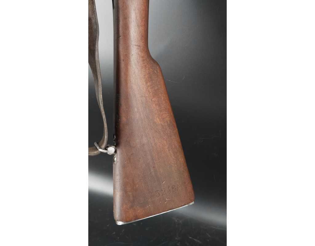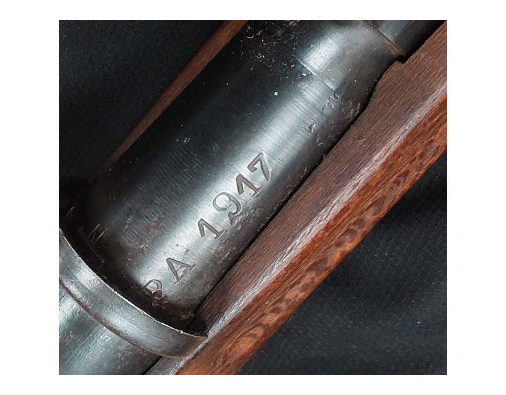 Bel exemplaire d'un fusil Berthier réglementaire modèle 1907/15 M16 construit neuf par Continsouza fin d'année 1917 avec un canon frappé PA 1917, répétition manuelle 5 coups calibre 8x51R modifié pour la balle 32N. Bronzage d'origine légèrement patiné avec fines traces d'oxydation localisées, tous poinçons et marquages conforme et d'origine non atténués. Mécanisme complet et fonctionnel avec un verrouillage parfait, toutes pièces d'origine au même numéro FK32485. Monture en noyer avec macaron de crosse bien net réceptionné en février 1918 sans usure ni enture. Canon bien marqué long de 778mm, rayures bien nettes, peu usagées d'aspect brillantes miroir sans tache interne.