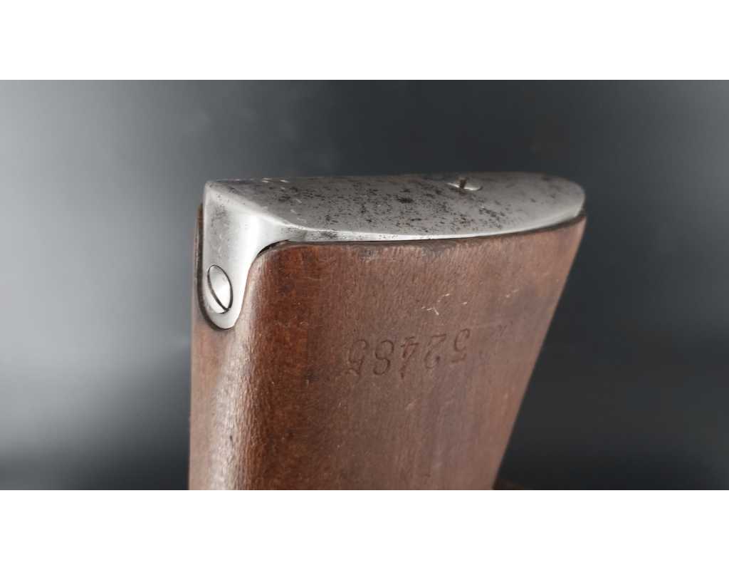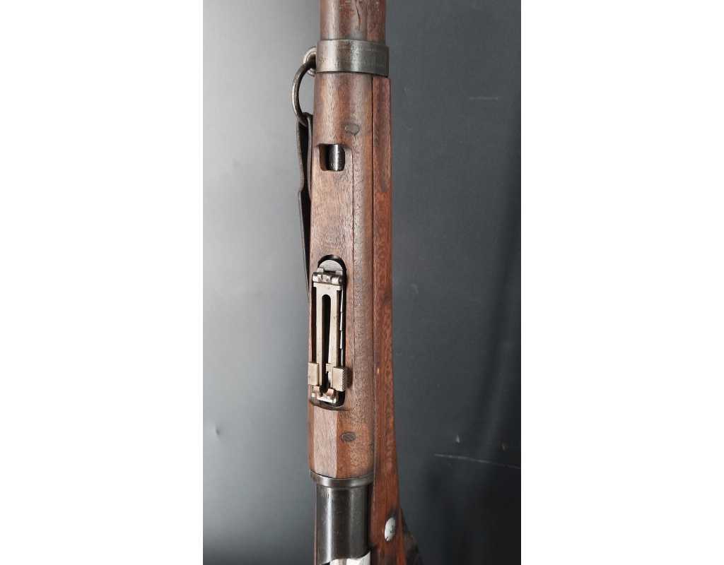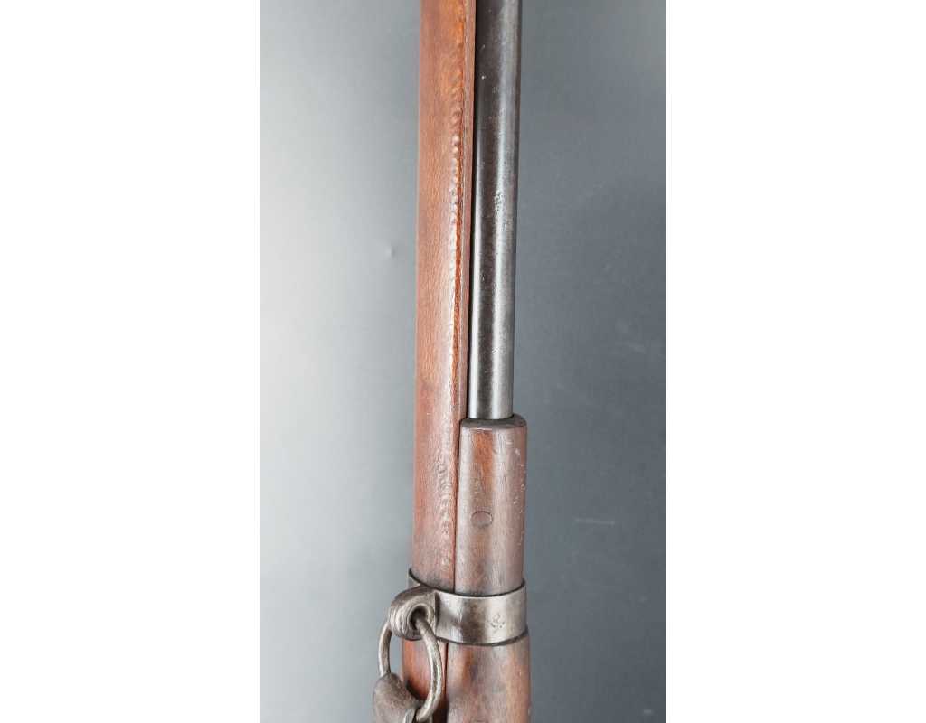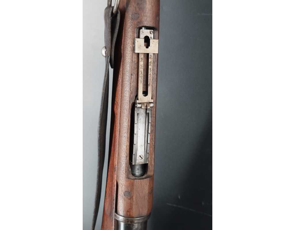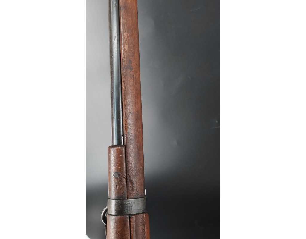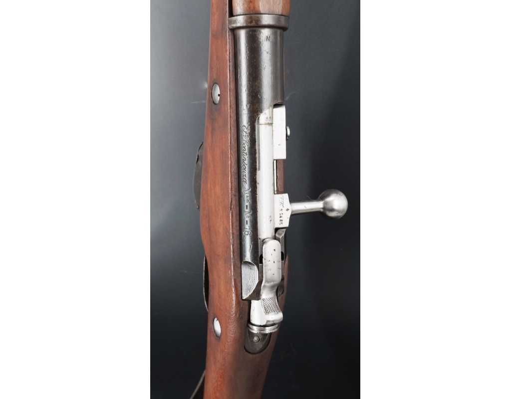 Bel exemplaire d'un fusil Berthier réglementaire modèle 1907/15 M16 construit neuf par Continsouza fin d'année 1917 avec un canon frappé PA 1917, répétition manuelle 5 coups calibre 8x51R modifié pour la balle 32N. Bronzage d'origine légèrement patiné avec fines traces d'oxydation localisées, tous poinçons et marquages conforme et d'origine non atténués. Mécanisme complet et fonctionnel avec un verrouillage parfait, toutes pièces d'origine au même numéro FK32485. Monture en noyer avec macaron de crosse bien net réceptionné en février 1918 sans usure ni enture. Canon bien marqué long de 778mm, rayures bien nettes, peu usagées d'aspect brillantes miroir sans tache interne.