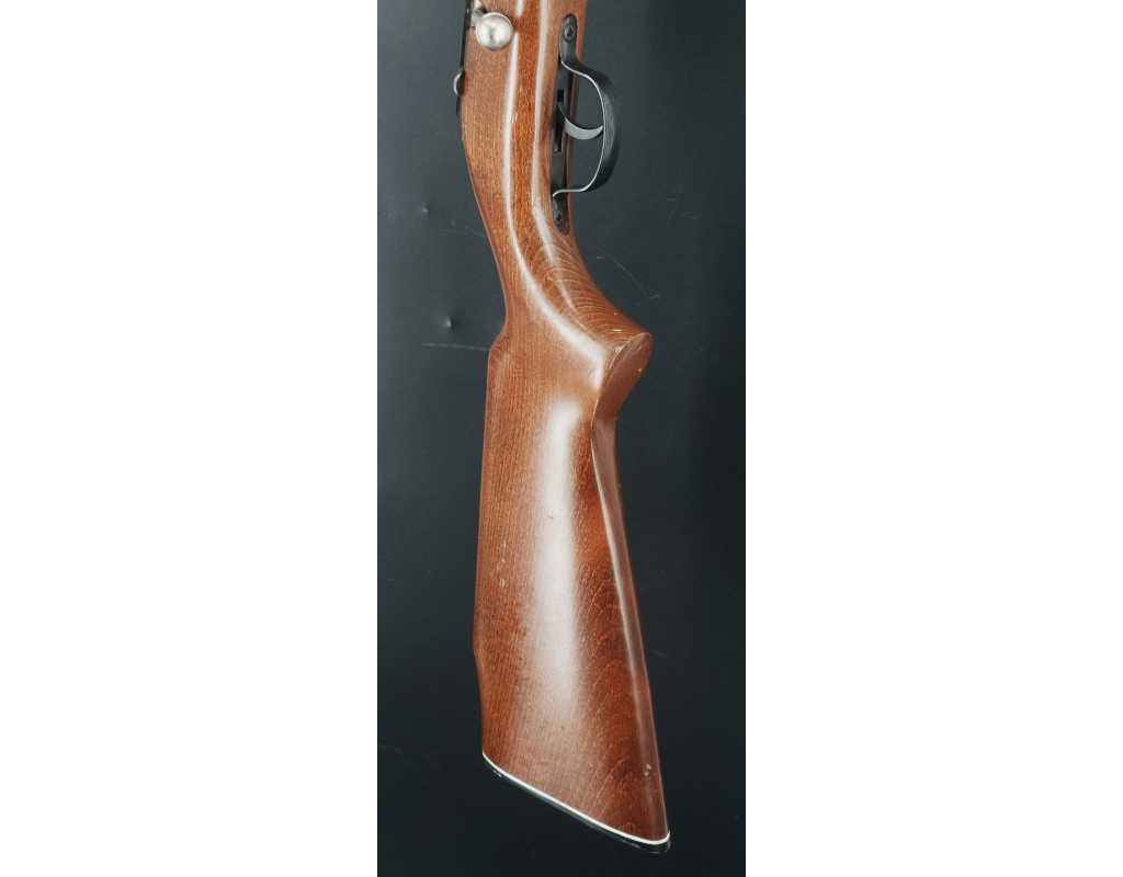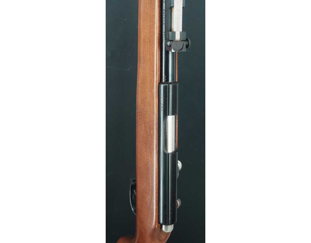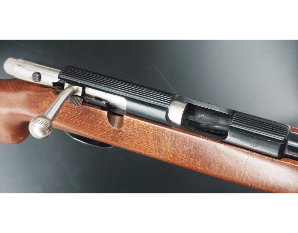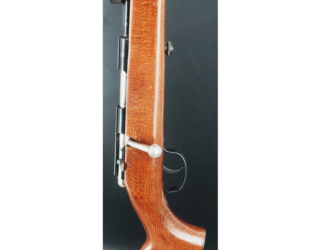 carabine Gaucher mono coup calibre 22LR. Bronzage d'origine sans tache, crosse 35cm en noyer sans accident, rayures miroir et mécanisme sans usure, bouchon fileté à la bouche pour modérateur de son. Canon 55cm, longueur totale 101cm